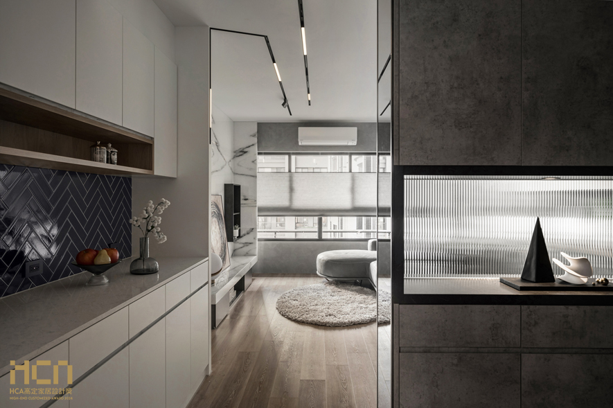 ▲玄关处因风水考量,设置一座衣帽与外出鞋的收纳柜,柜体中段的长虹玻璃使其轻盈无压,并援引远处的自然光洒落;一旁的餐柜壁面拼接窑变砖,不仅带有与全屋呼应的质朴触感,饱和的深蓝色彩,亦为周围沉稳的灰阶注入活泼气息。