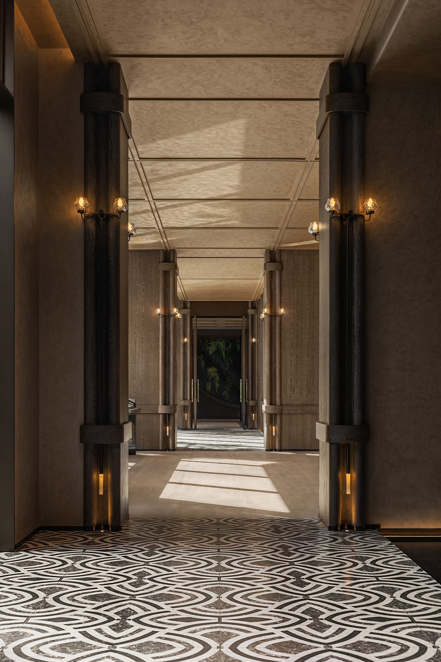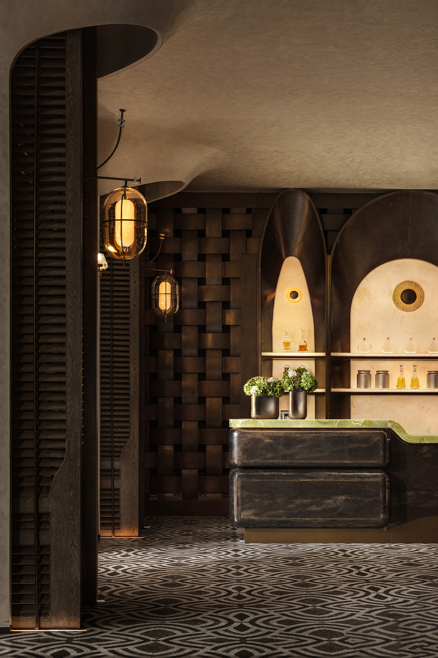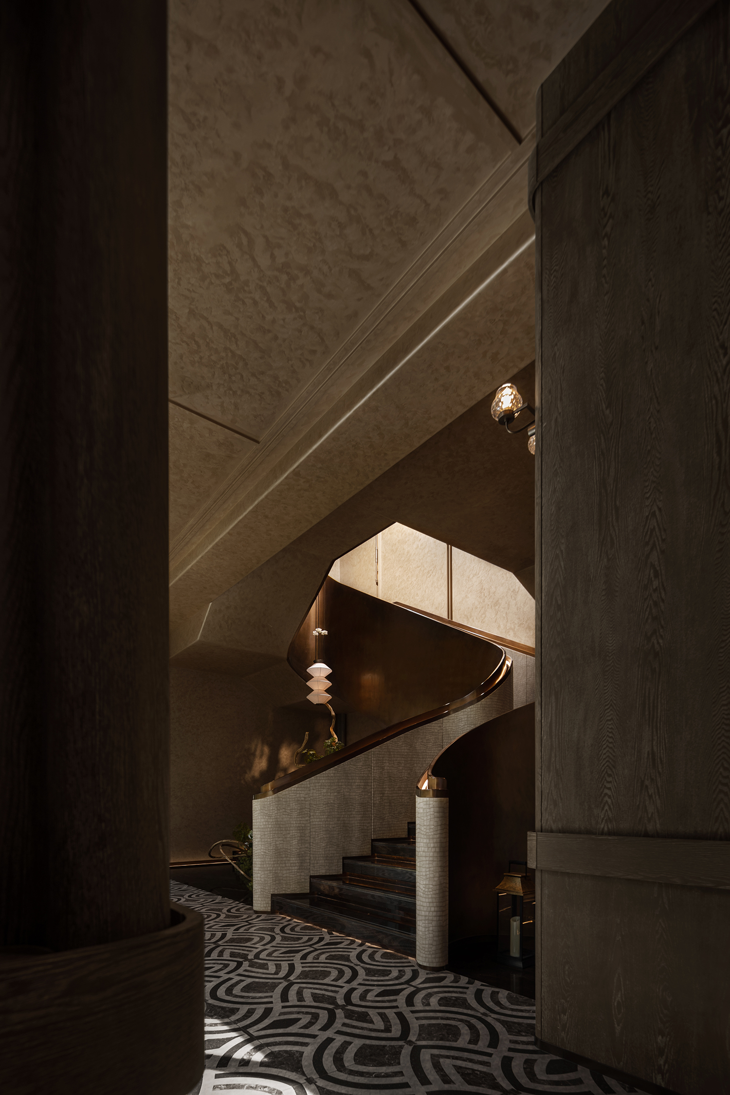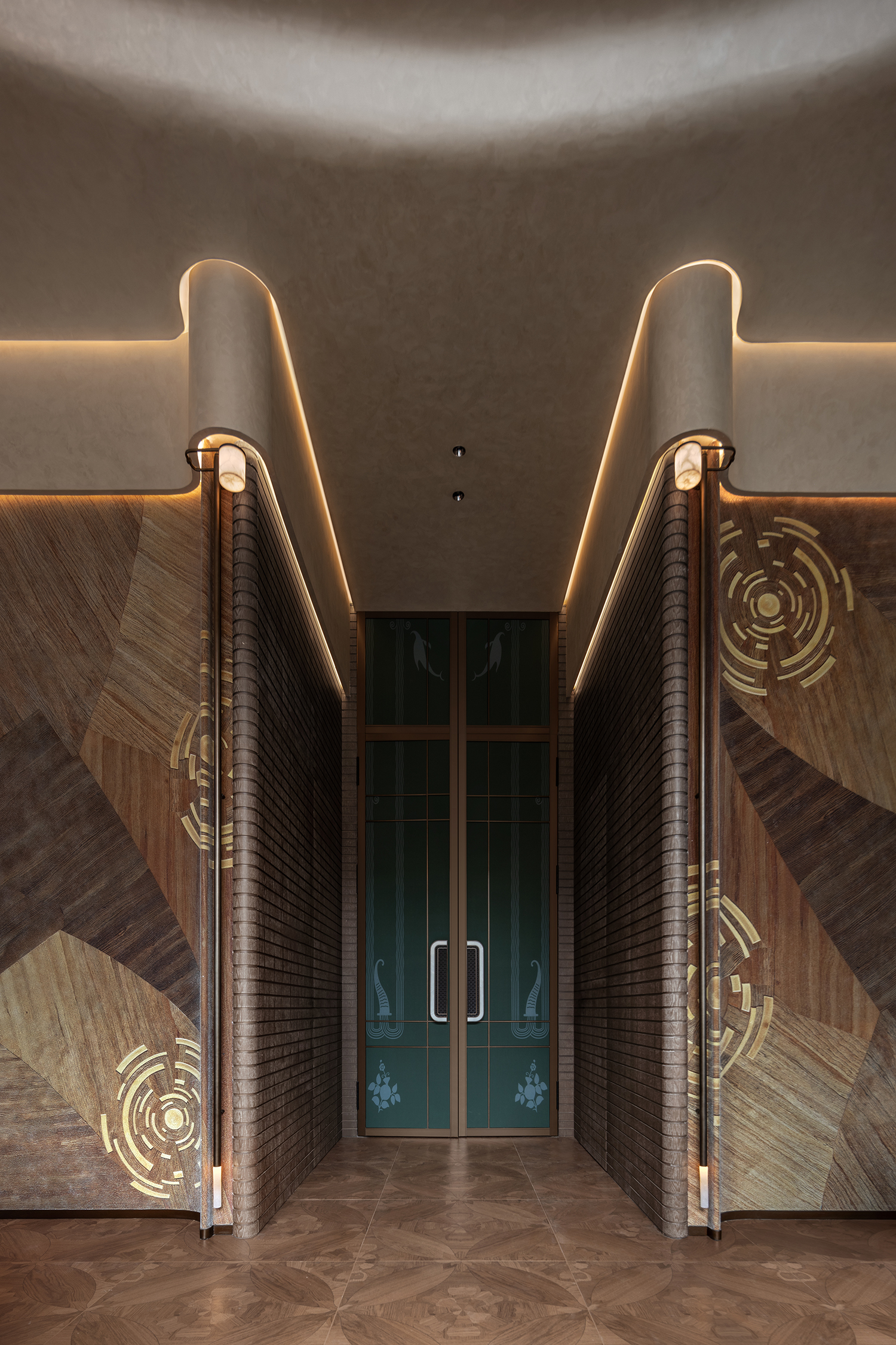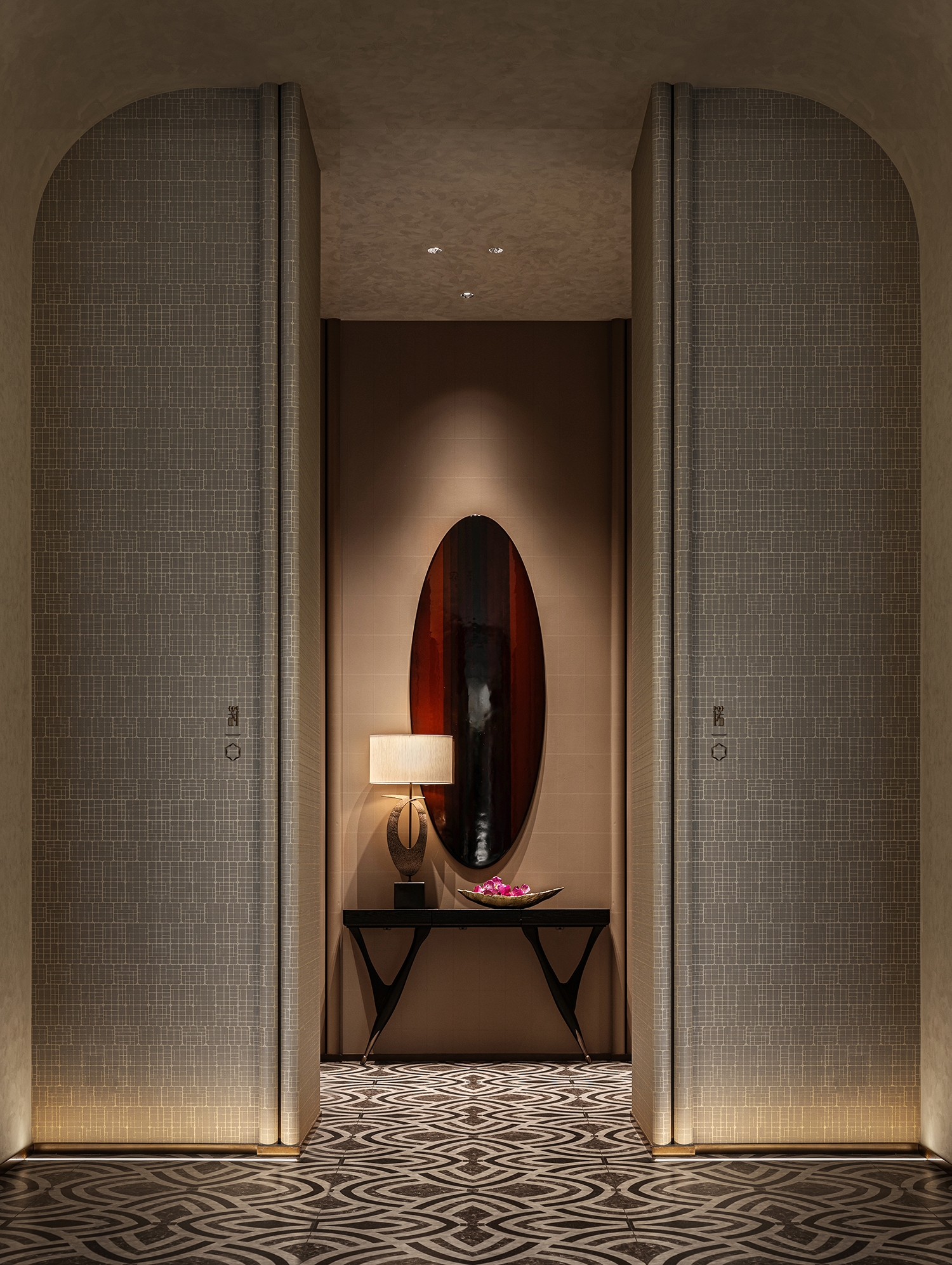 空间布局:温润木质与冷峻线条刚柔相济,两侧浅金色层次柔和雅致,地面花纹地砖如大地脉络,呼应在地文脉。空间布局以“渡”为脉络,流畅划分功能区域,形成从开放到私密的渐进式过渡,实现当代礼序的平衡与升华。