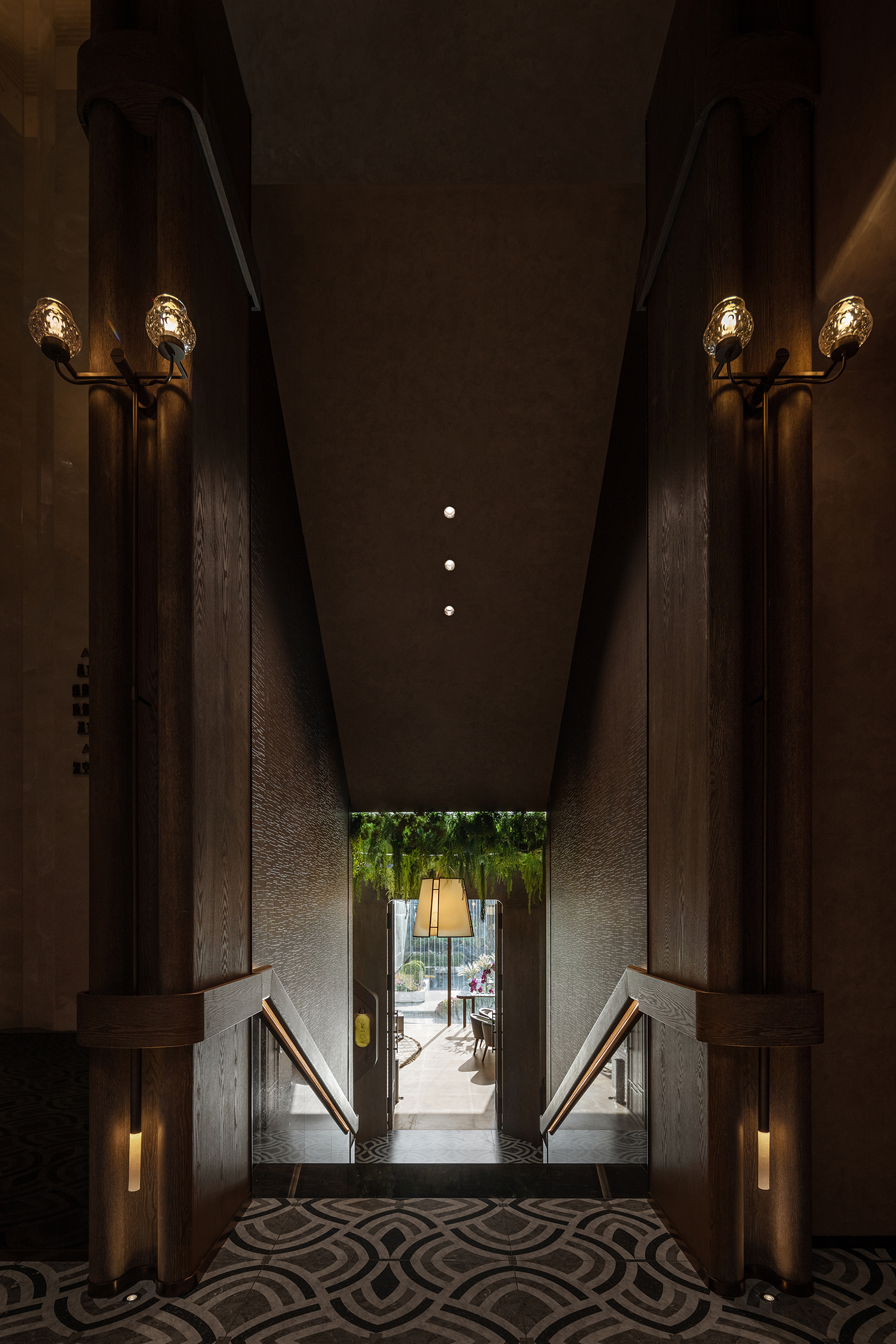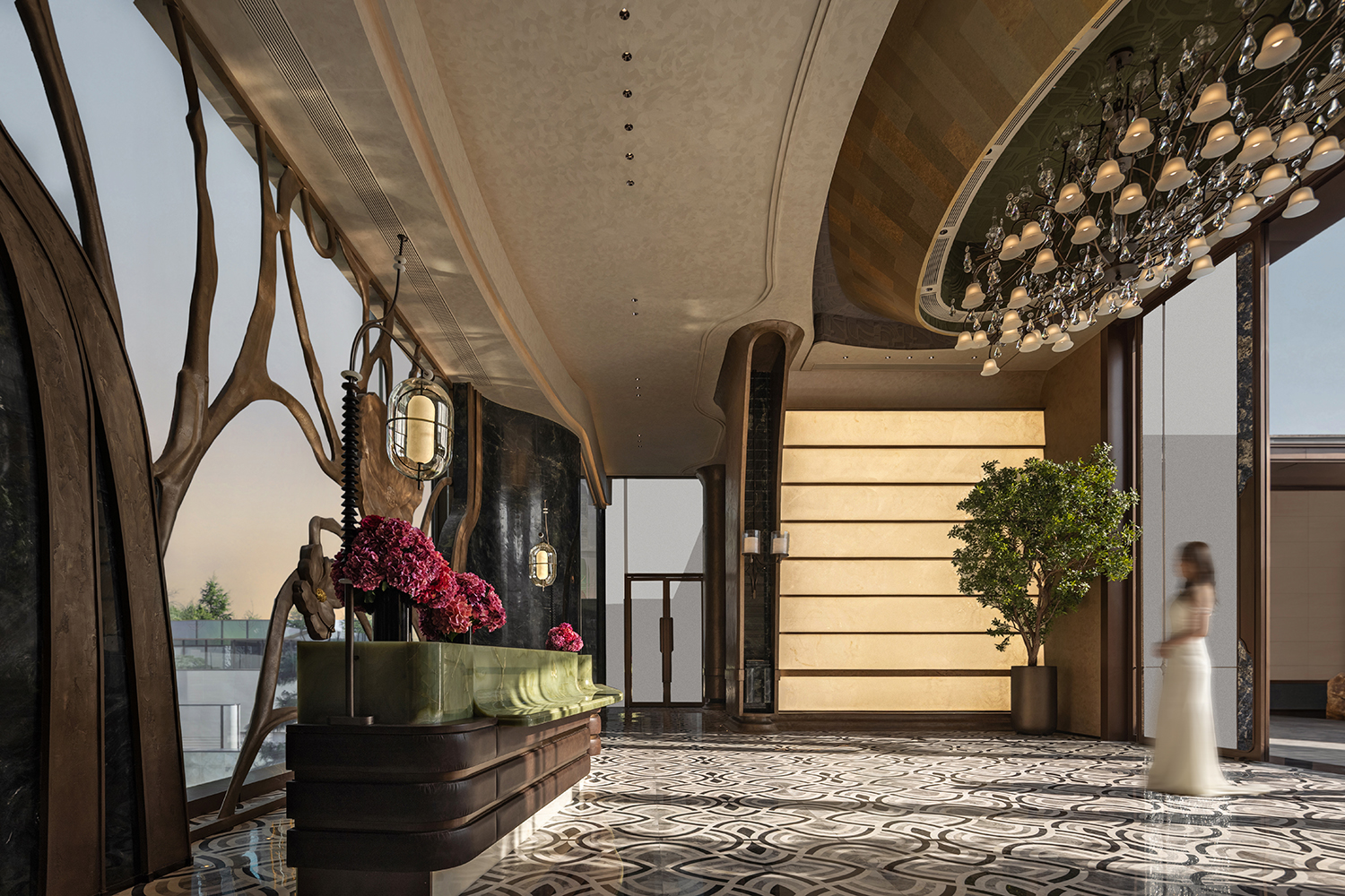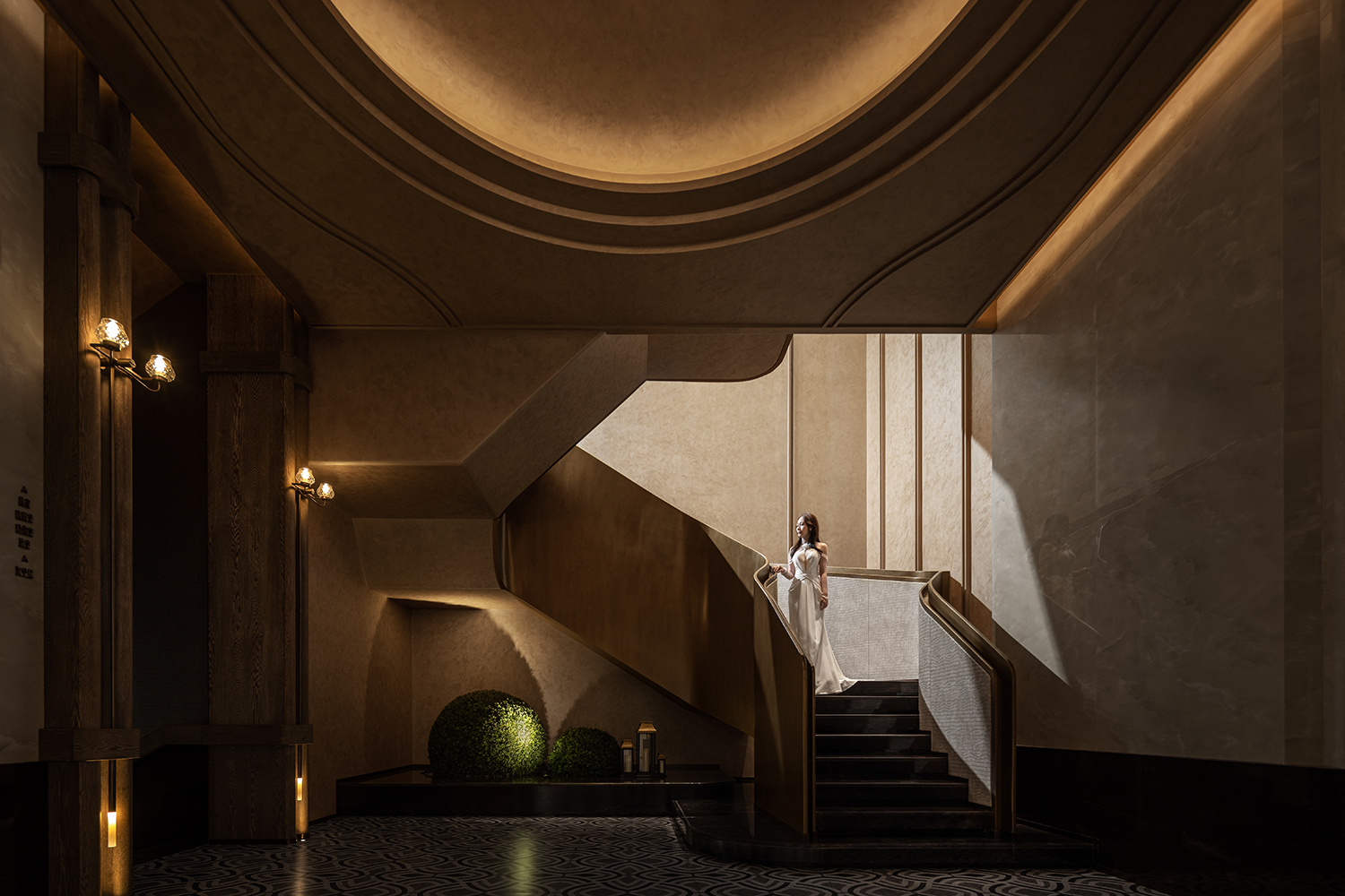重构「陇中四合天井」之韵,以现代手法演绎“四水归堂”意境。光影倾泻于特质石材,勾勒出“渡”之动线,既隐喻聚财纳福,亦以宏大尺度延展空间纵深。 -