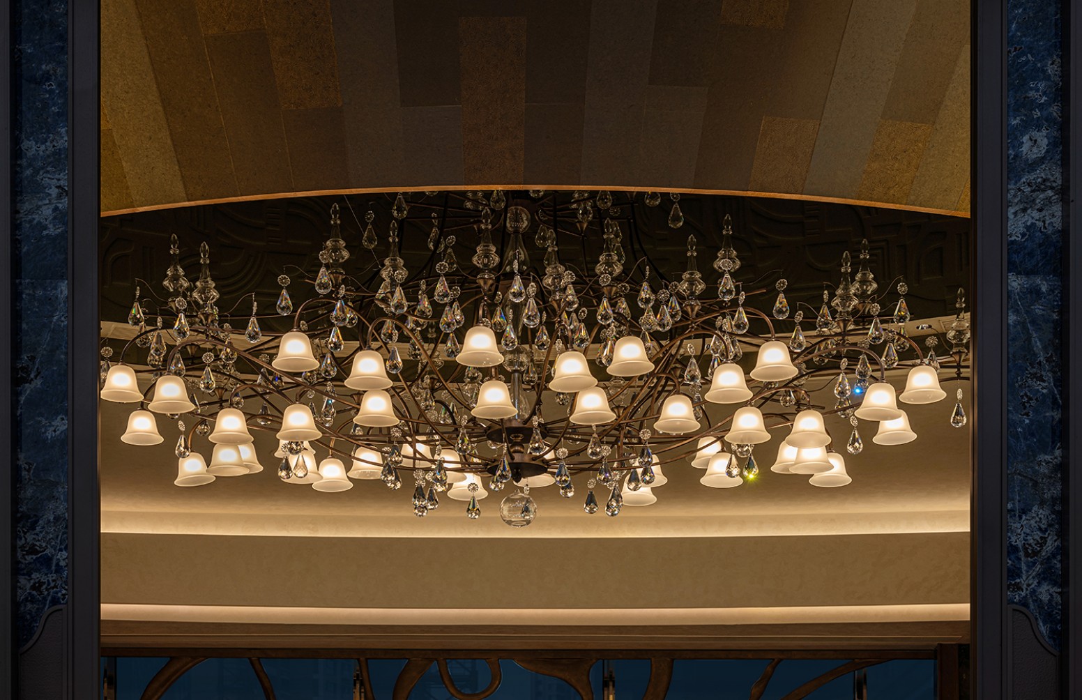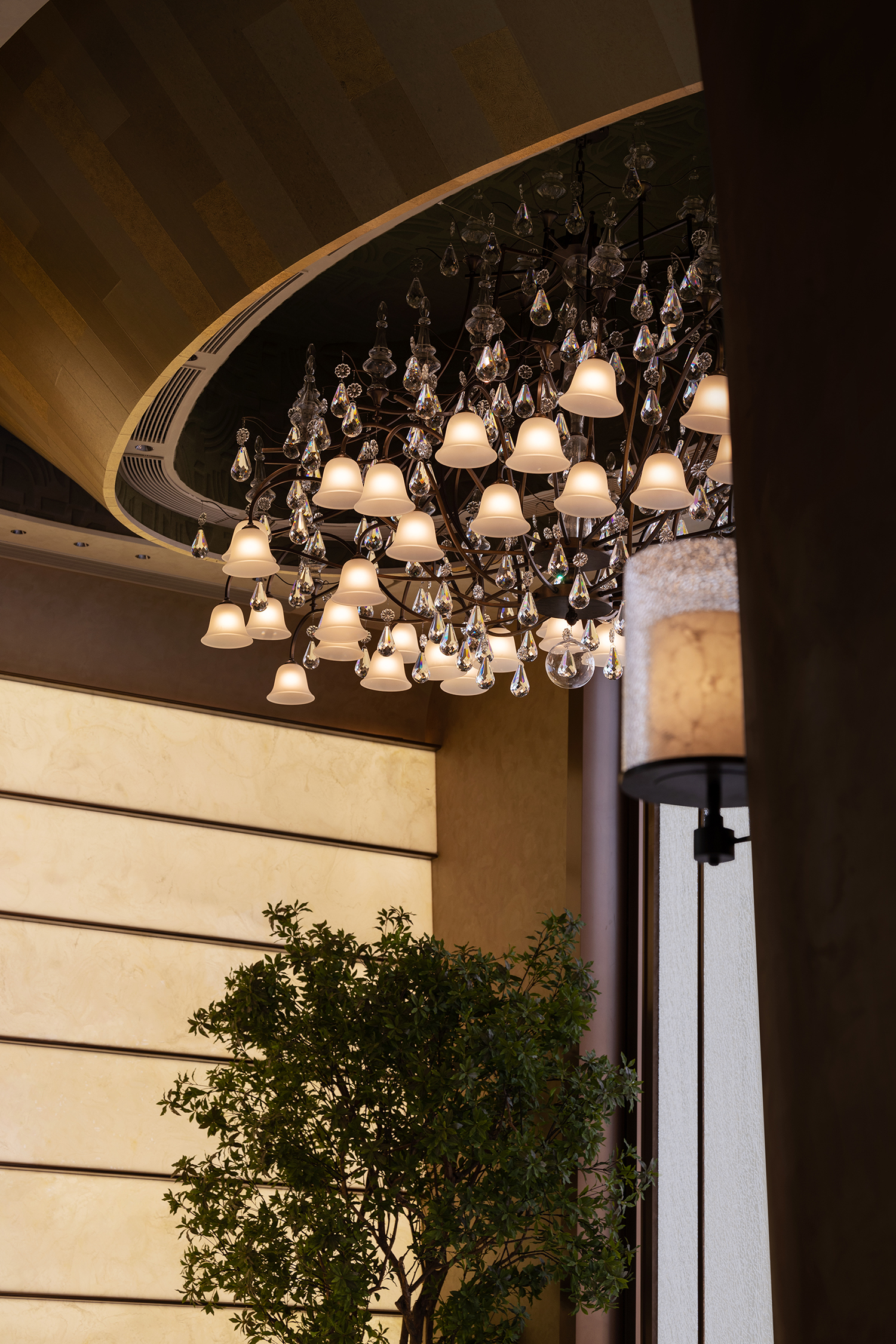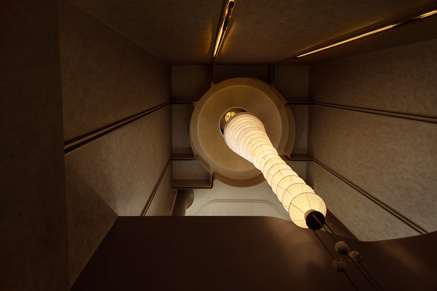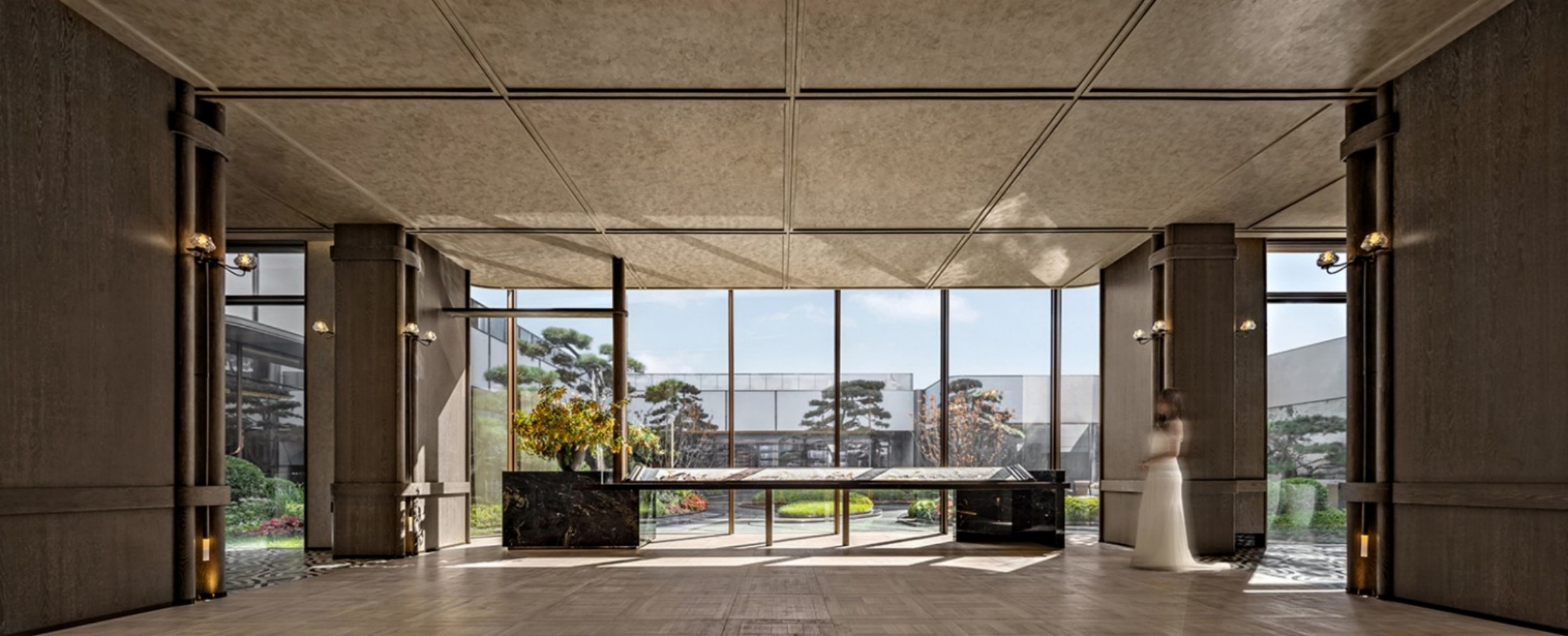 重构「陇中四合天井」之韵,以现代手法演绎“四水归堂”意境。光影倾泻于特质石材,勾勒出“渡”之动线,既隐喻聚财纳福,亦以宏大尺度延展空间纵深。 -