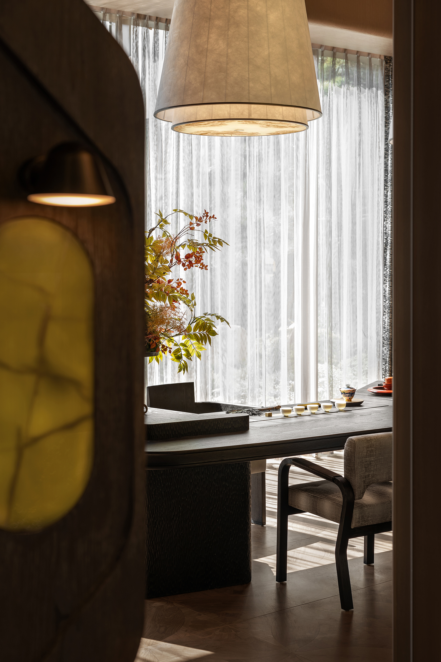 一器一物、一光一影之间,韵致深邃,于静谧之中浸润精神与文化。布局暗合“渡”的共生结构,营造从社交到私密的渐进体验。