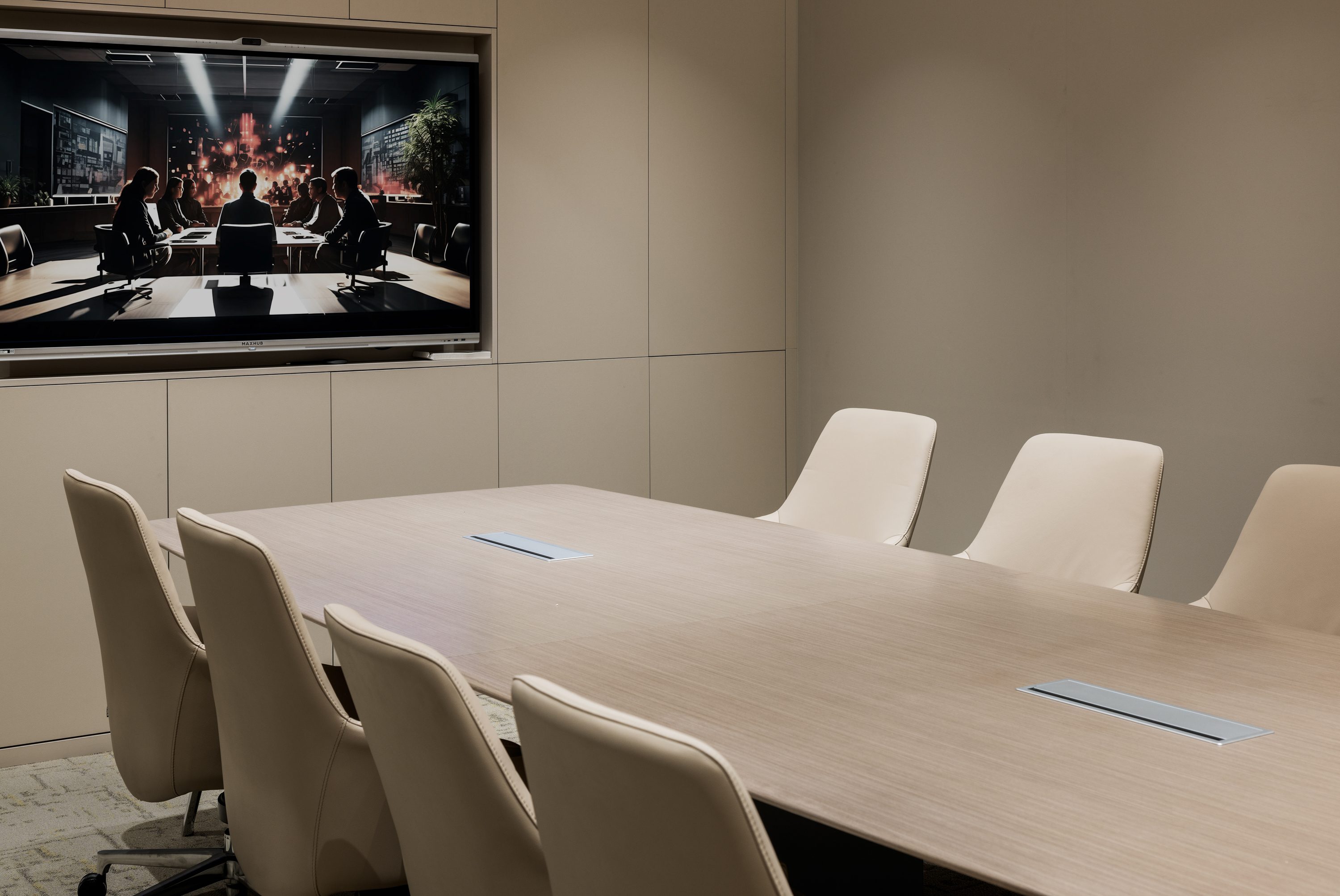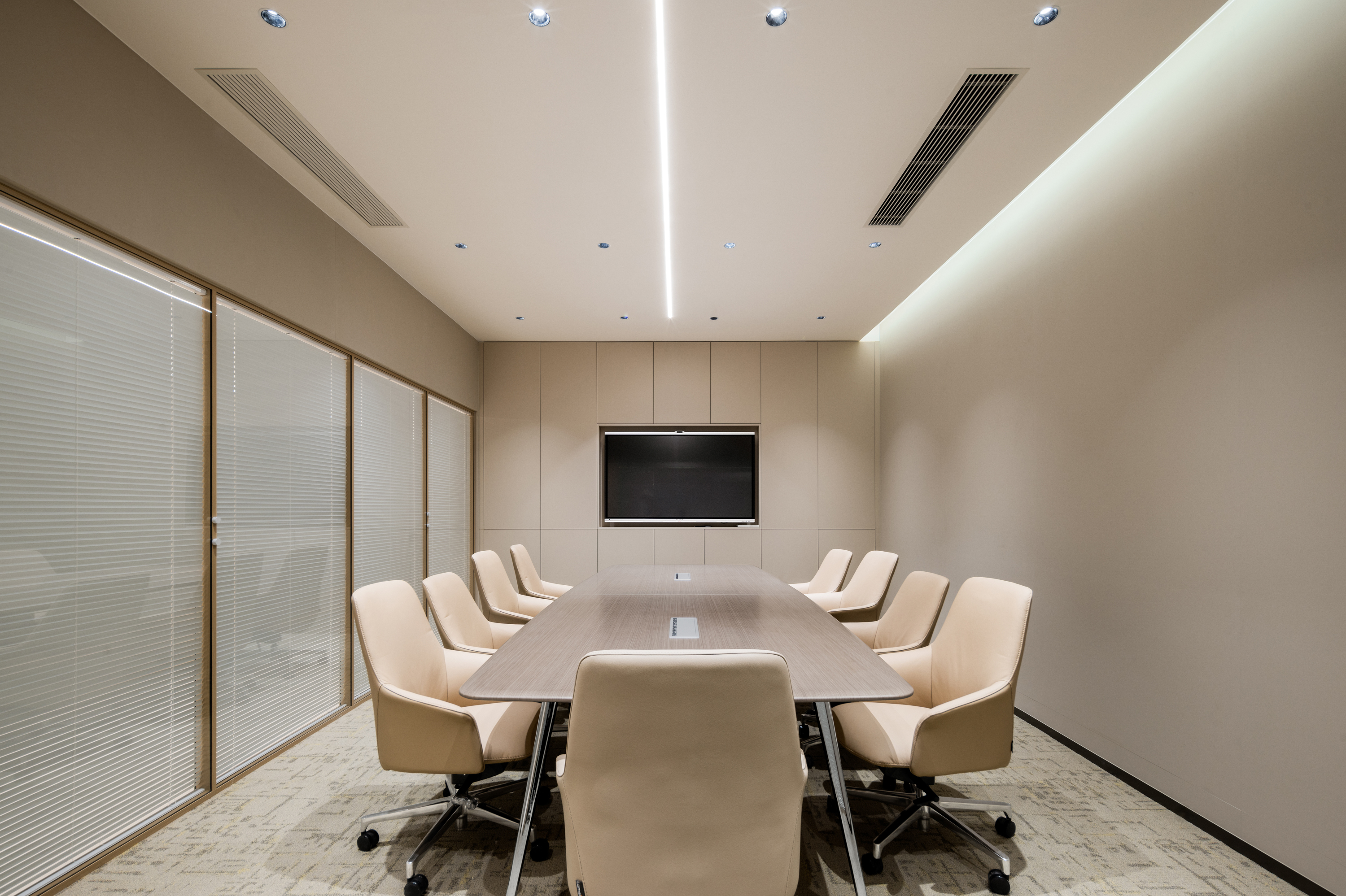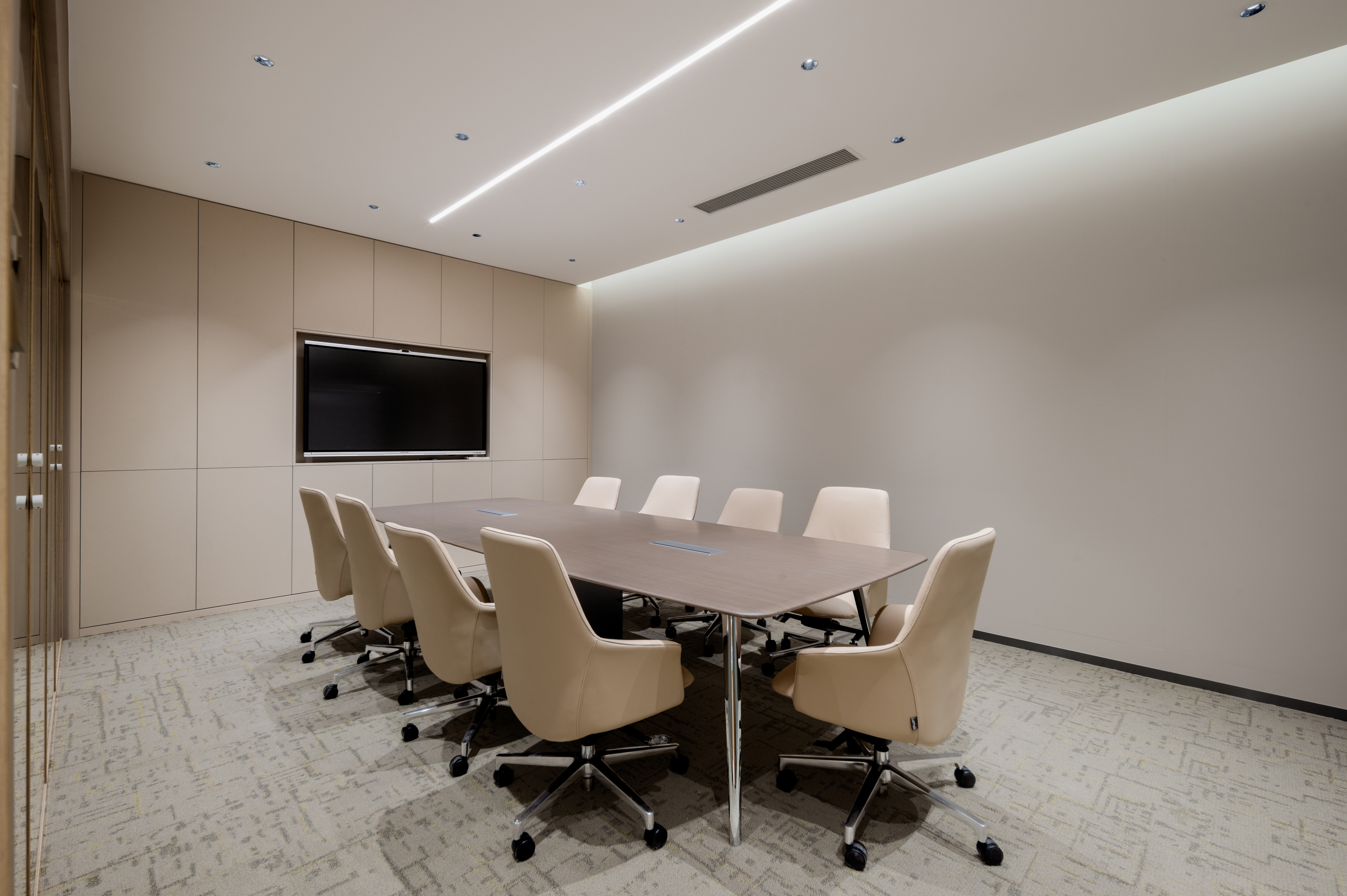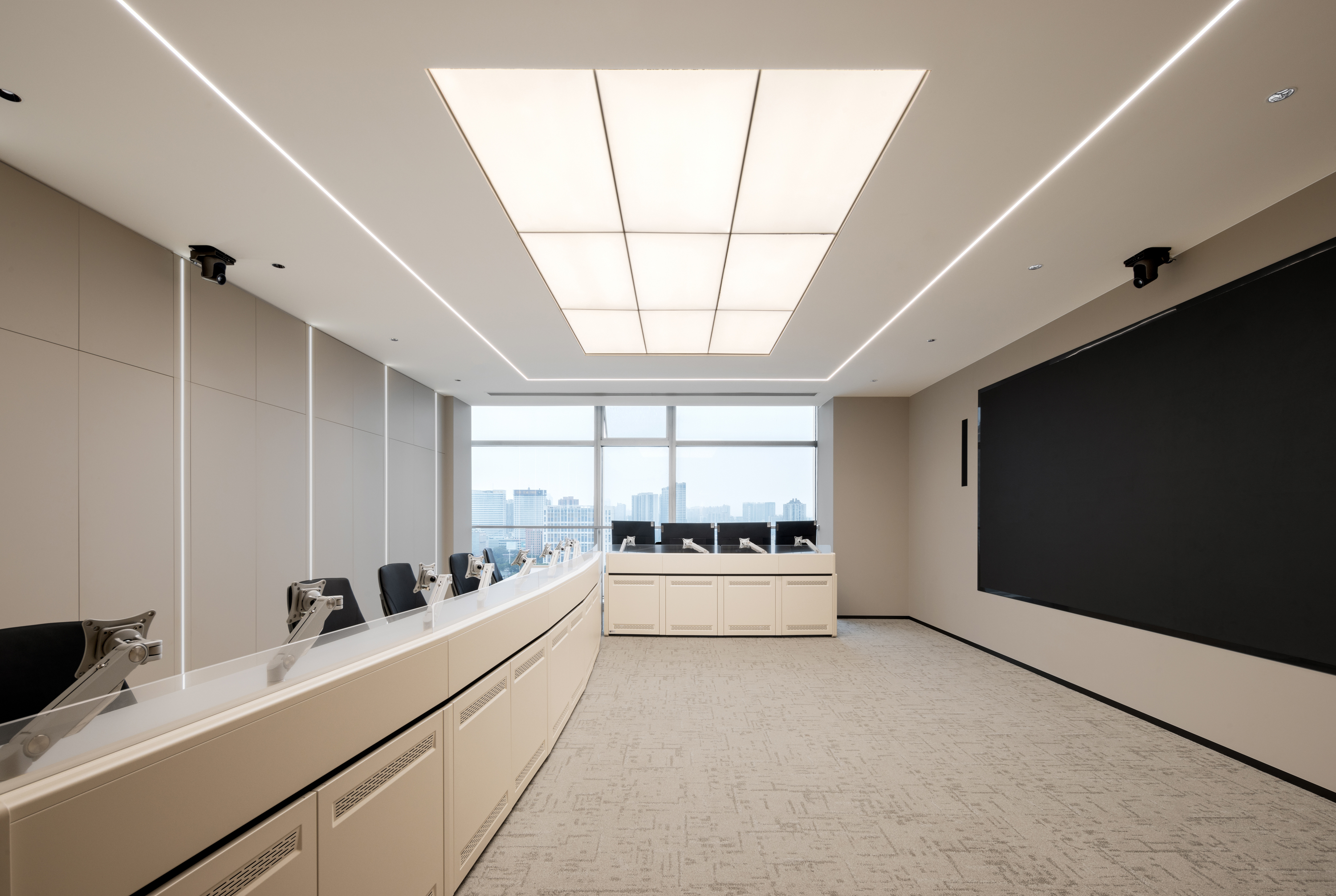 多 媒 体 会 议 厅 以 极 简 线 条 构 建 空 间 秩 序 , 隐 藏 式 灯 带 沿
