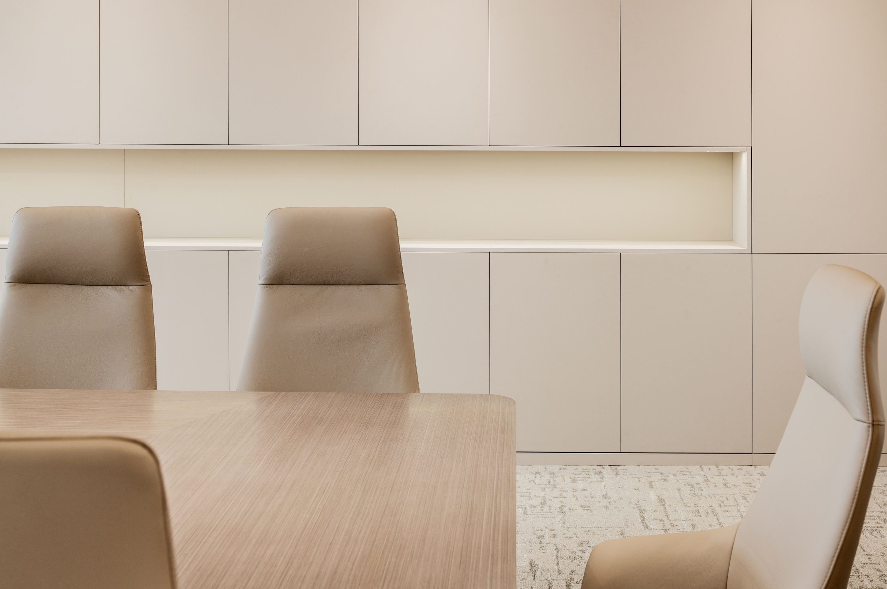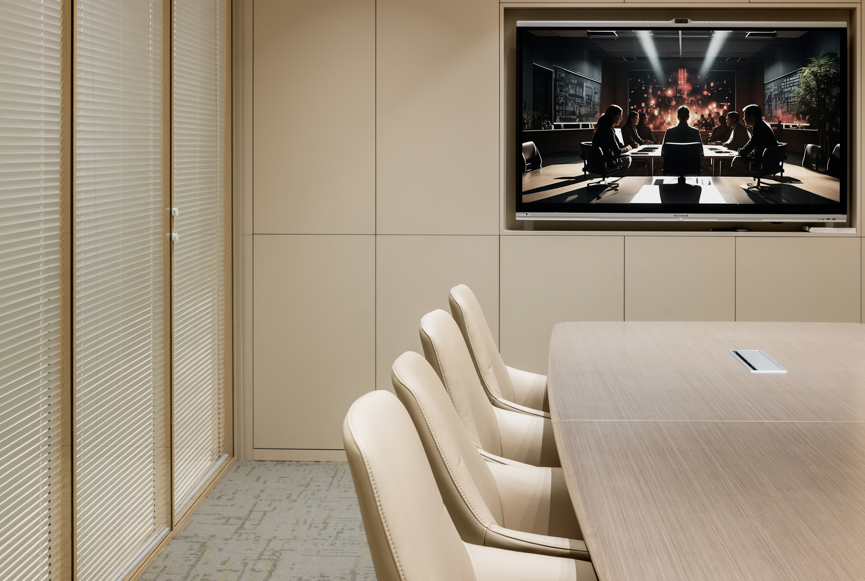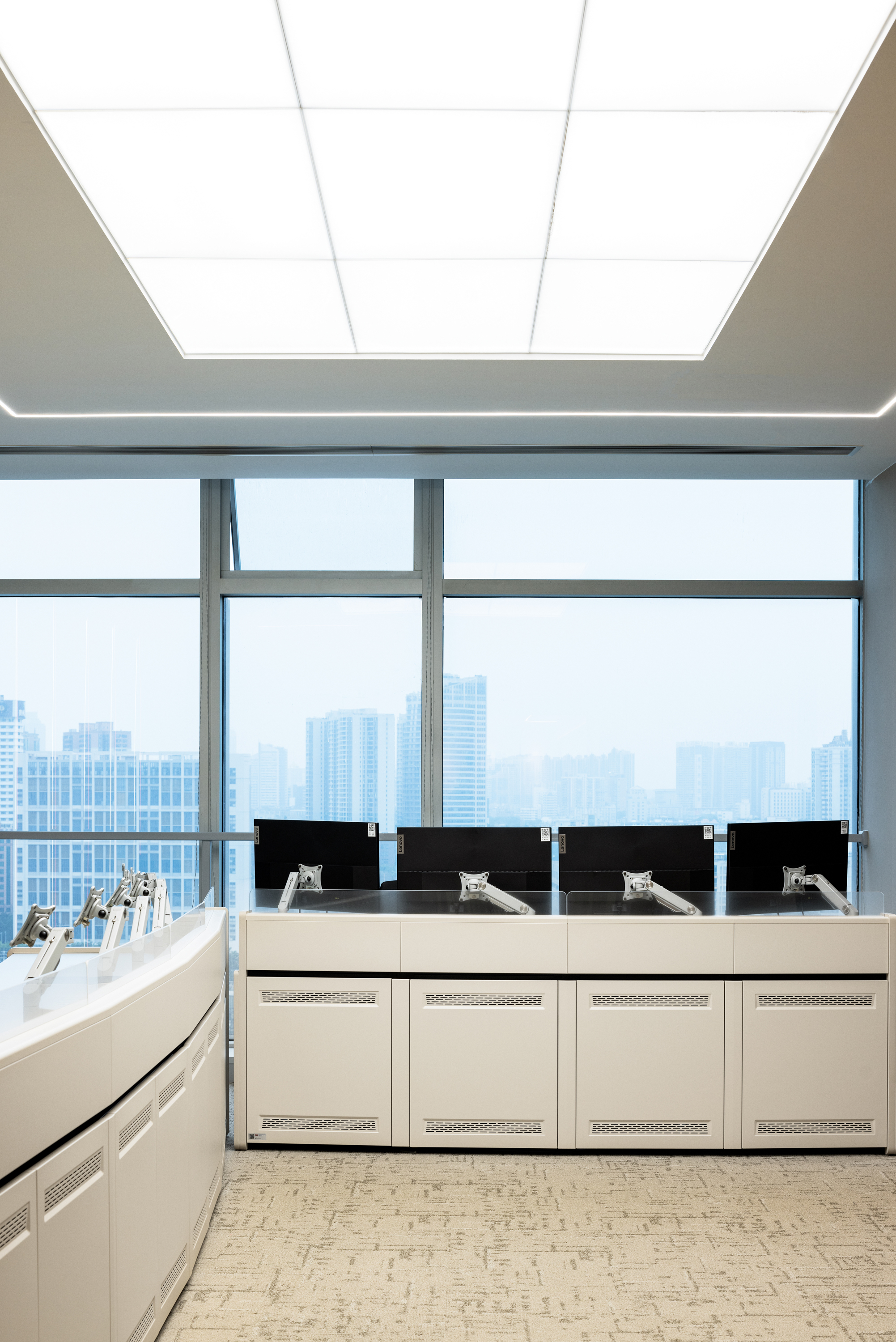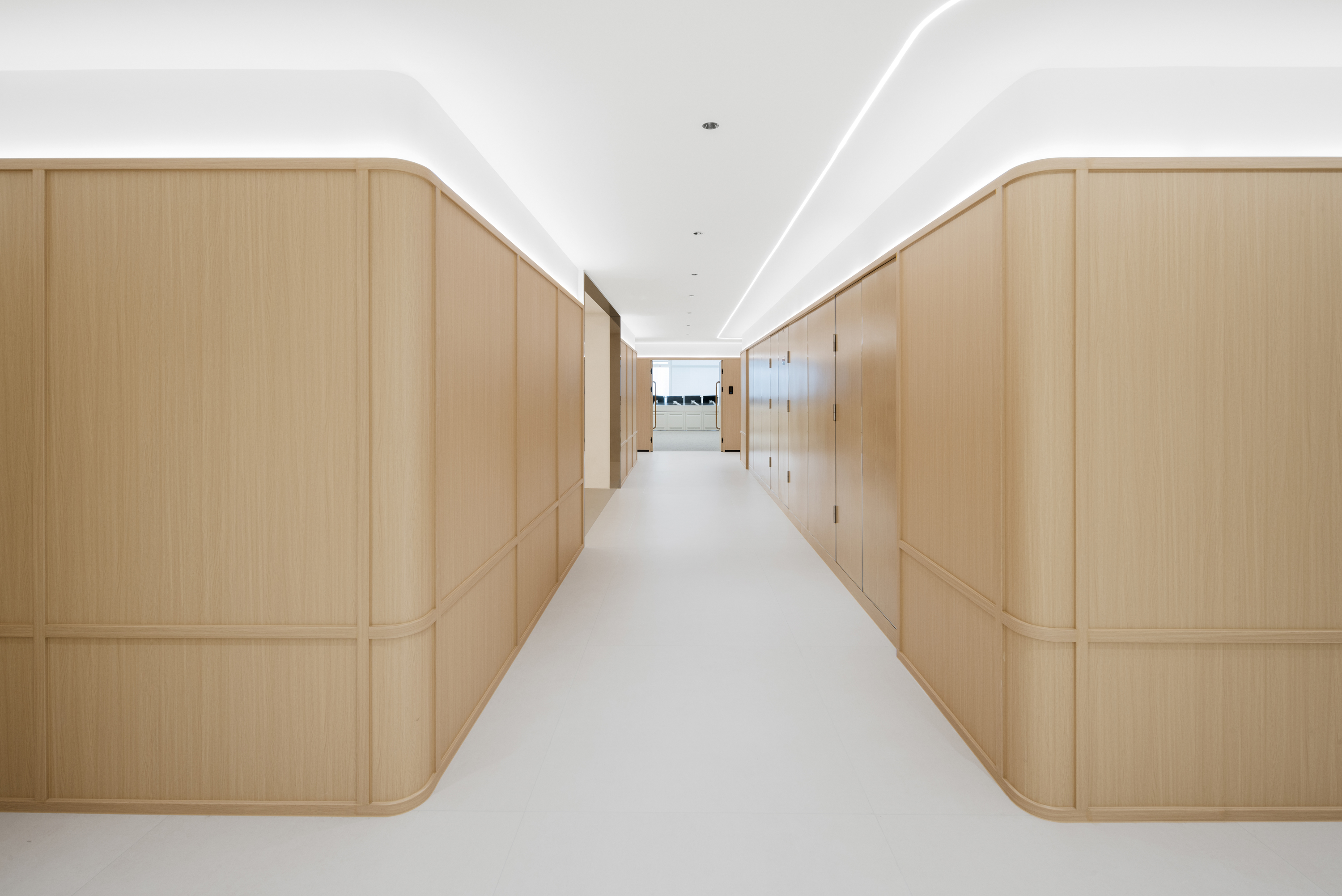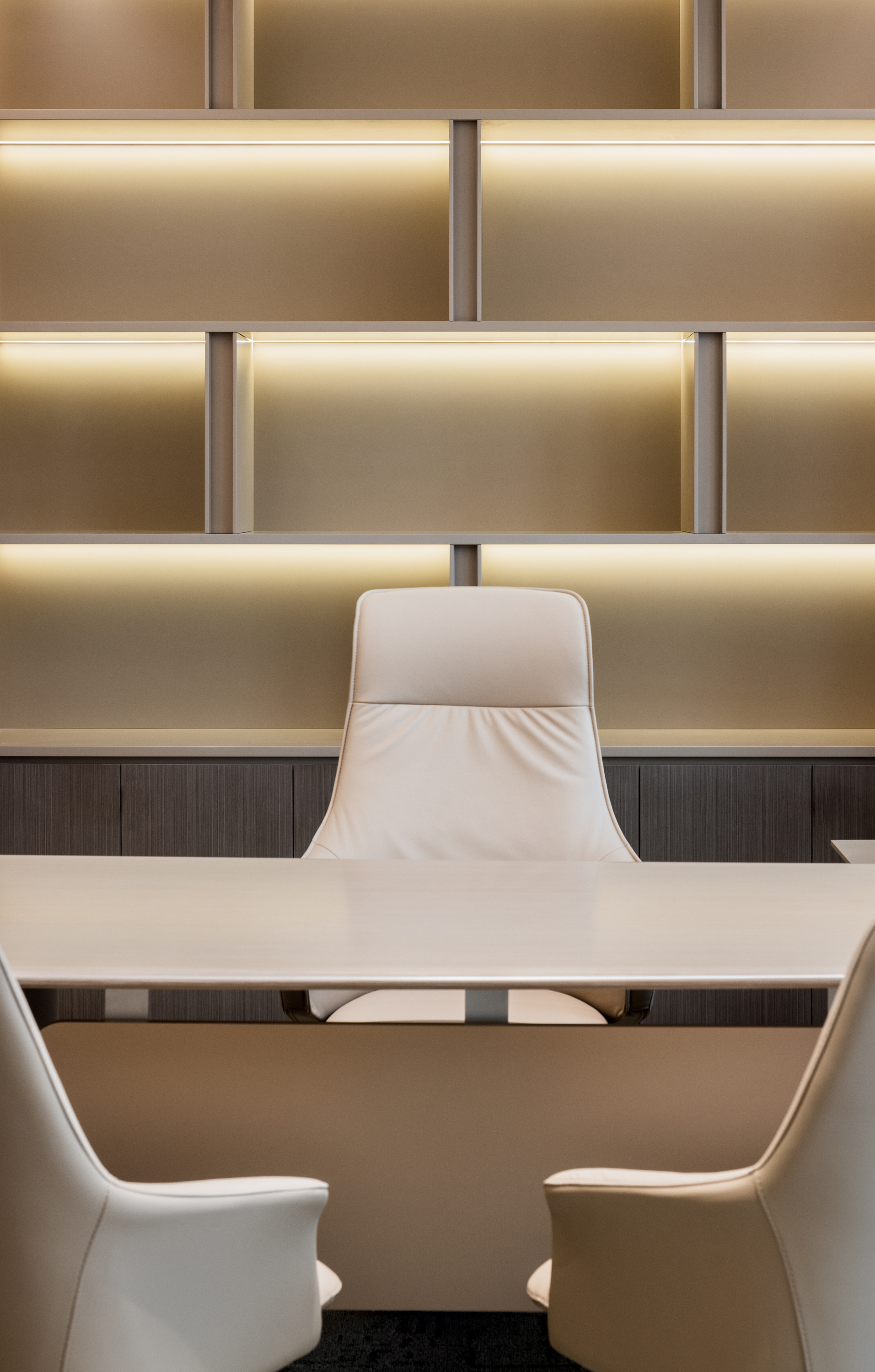 多 媒 体 会 议 厅 以 极 简 线 条 构 建 空 间 秩 序 , 隐 藏 式 灯 带 沿