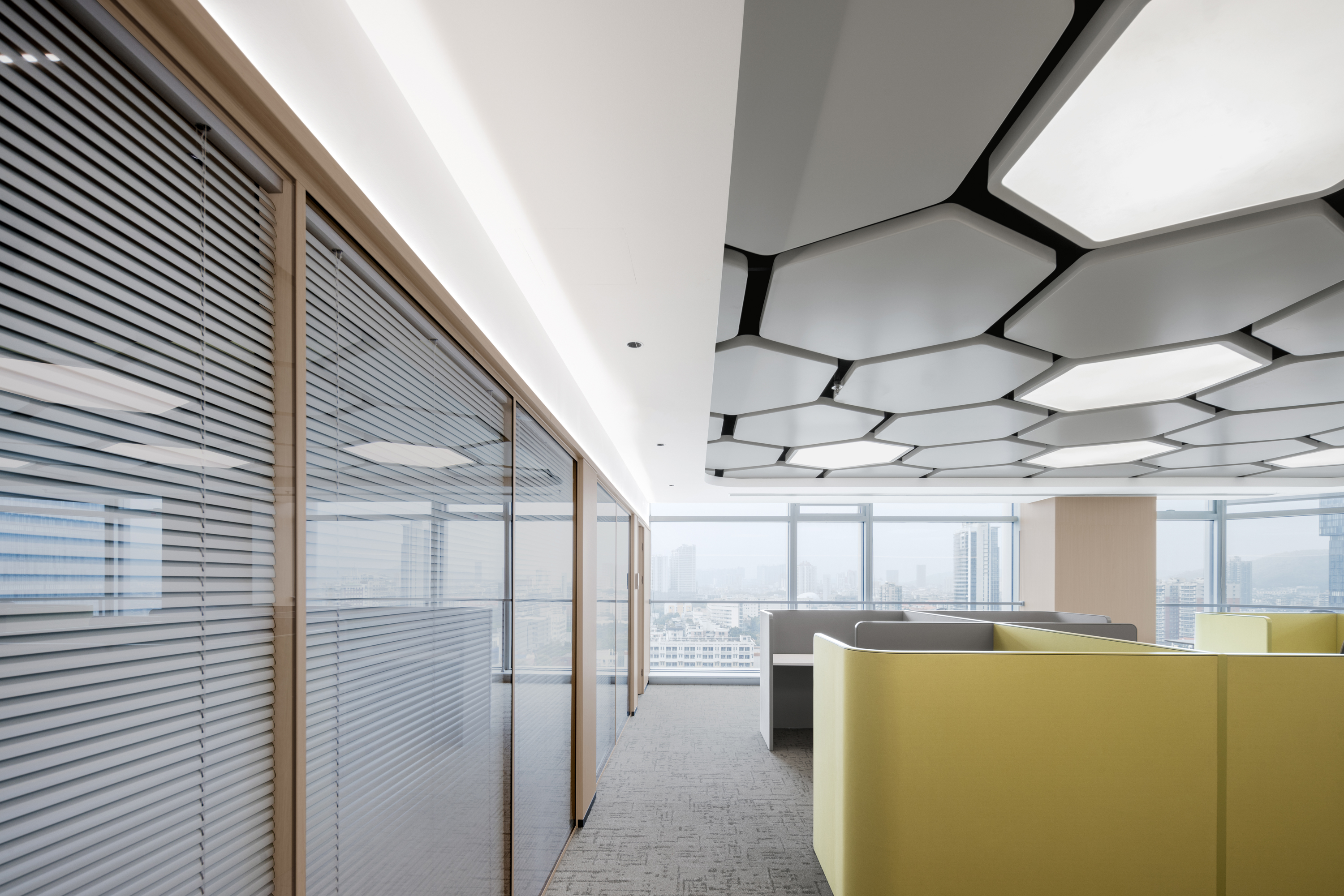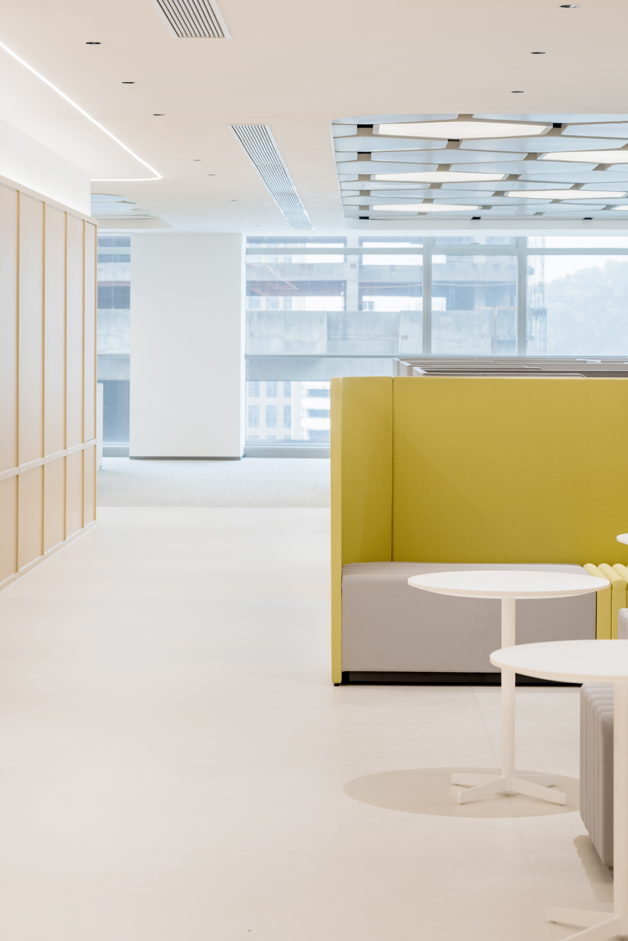 造 动 态 化 洽 谈 场 景 。 半 开 放 式 空 间 布 局 以 透 明 隔 断 呈 现