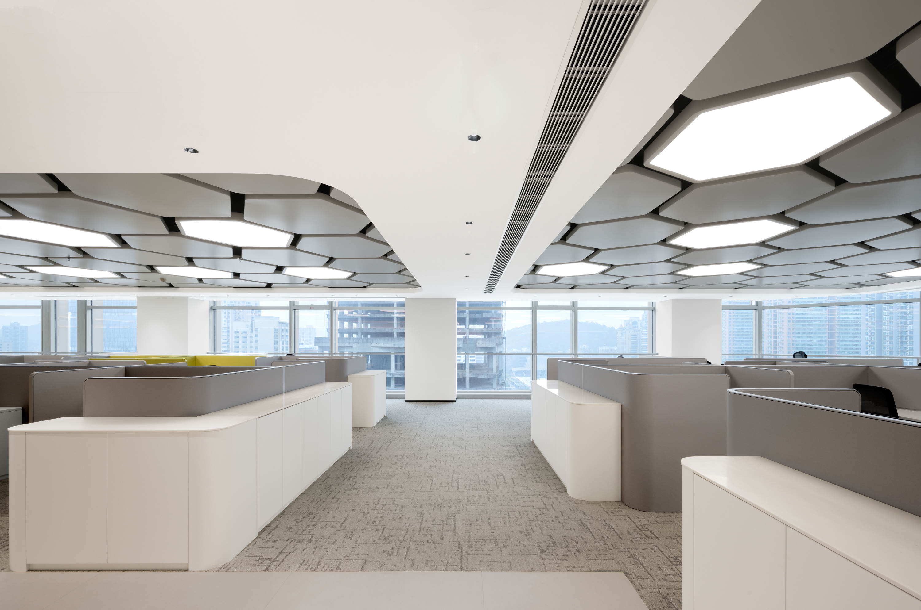 通 过 色 彩 块 面 将 空 间 分 隔 , 半 围 合 式 办 公 区 域 构 建 出 环