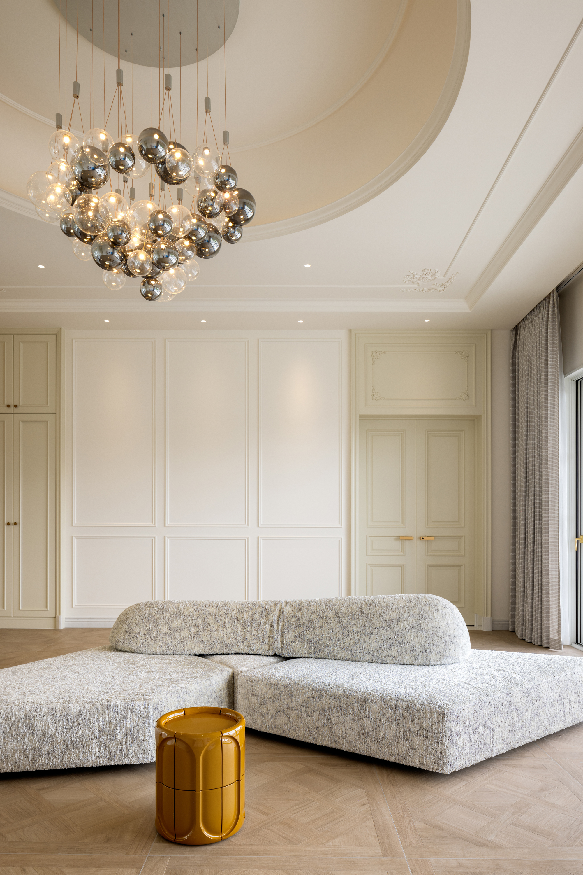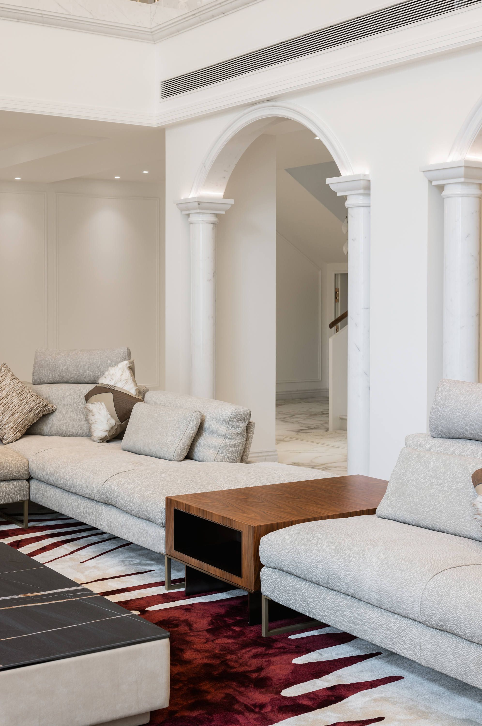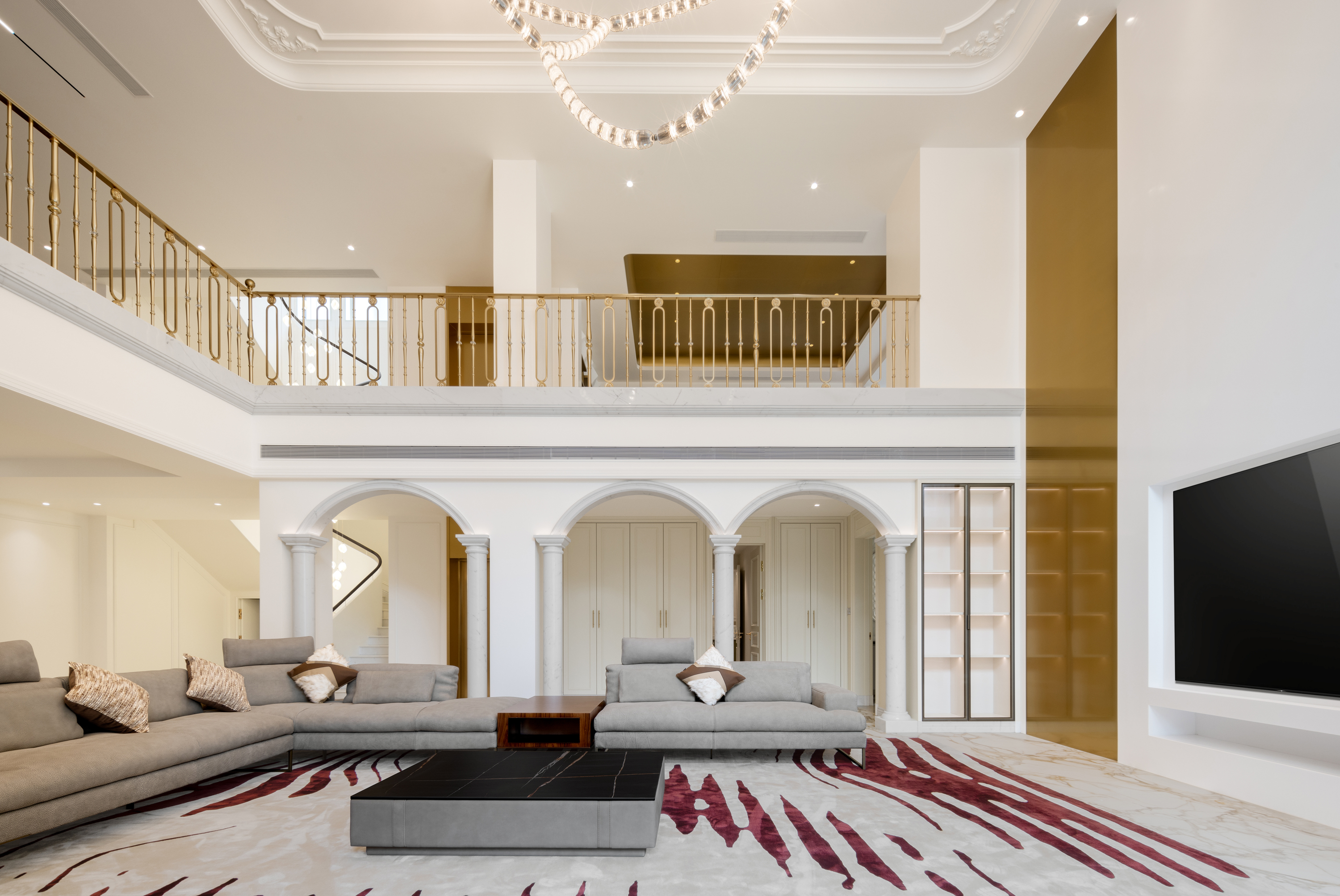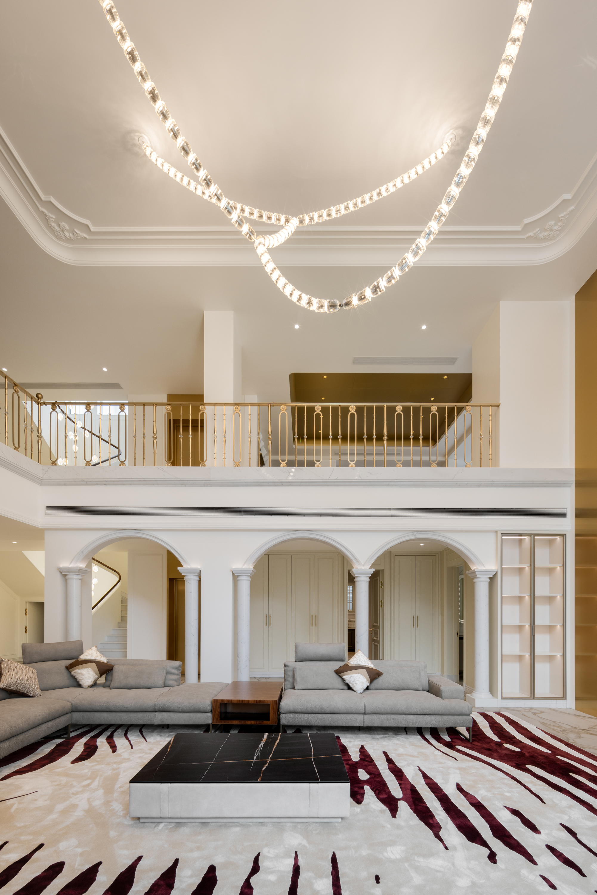 空间布局:法式优雅与现代简约于此和谐相融,拱形立柱、螺旋楼梯与水晶灯光勾勒出经典与现代交织的视觉印象。在纯粹的白色基调与极简线条中,艺术与自然悄然对话——阳台外珠江城景与室内绿植相映,构成一幅“流动的艺术绘画”;光影交织间,香槟色皮椅、玉白石餐桌与亚克力儿童展示柜,借材质与色彩的对比,进一步丰富了空间的质感层次。