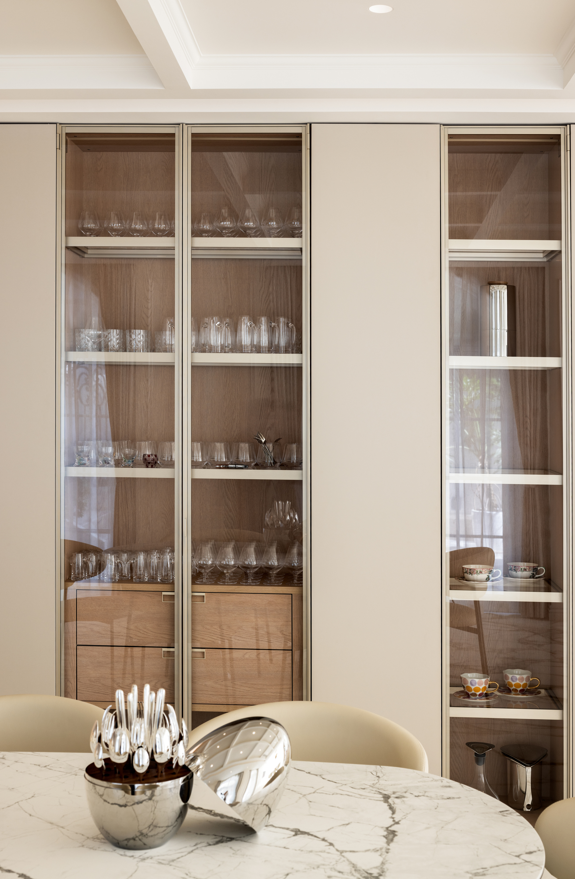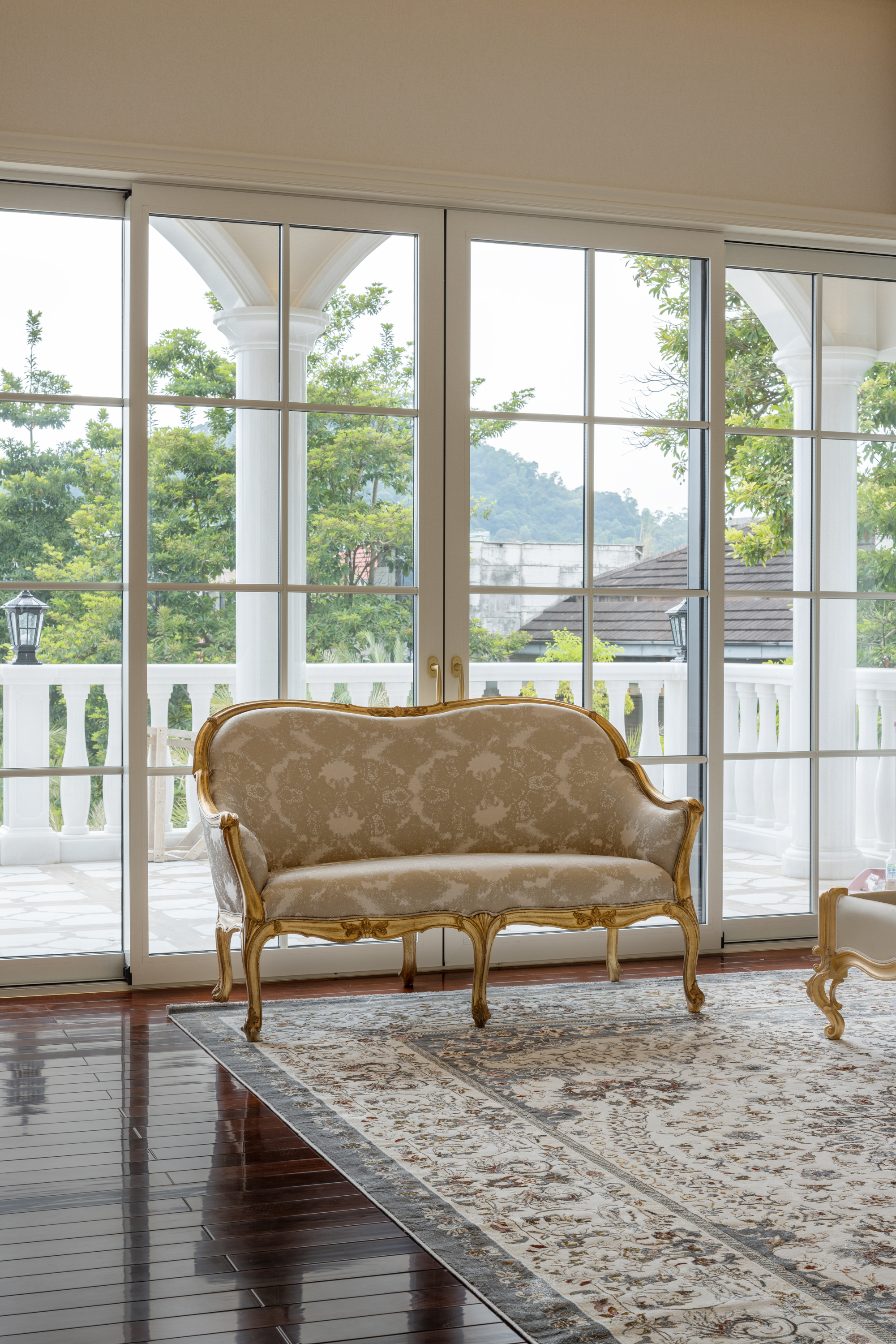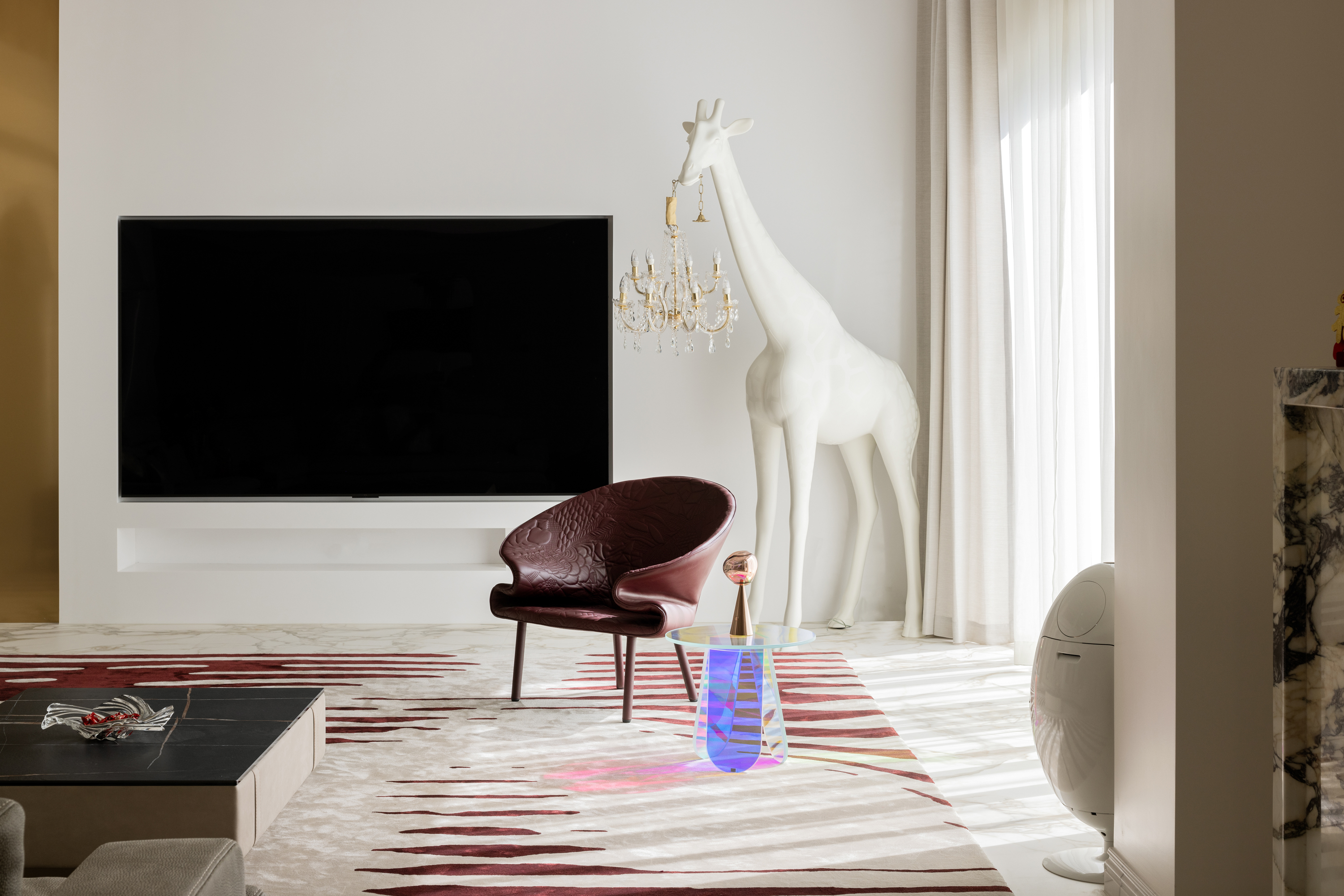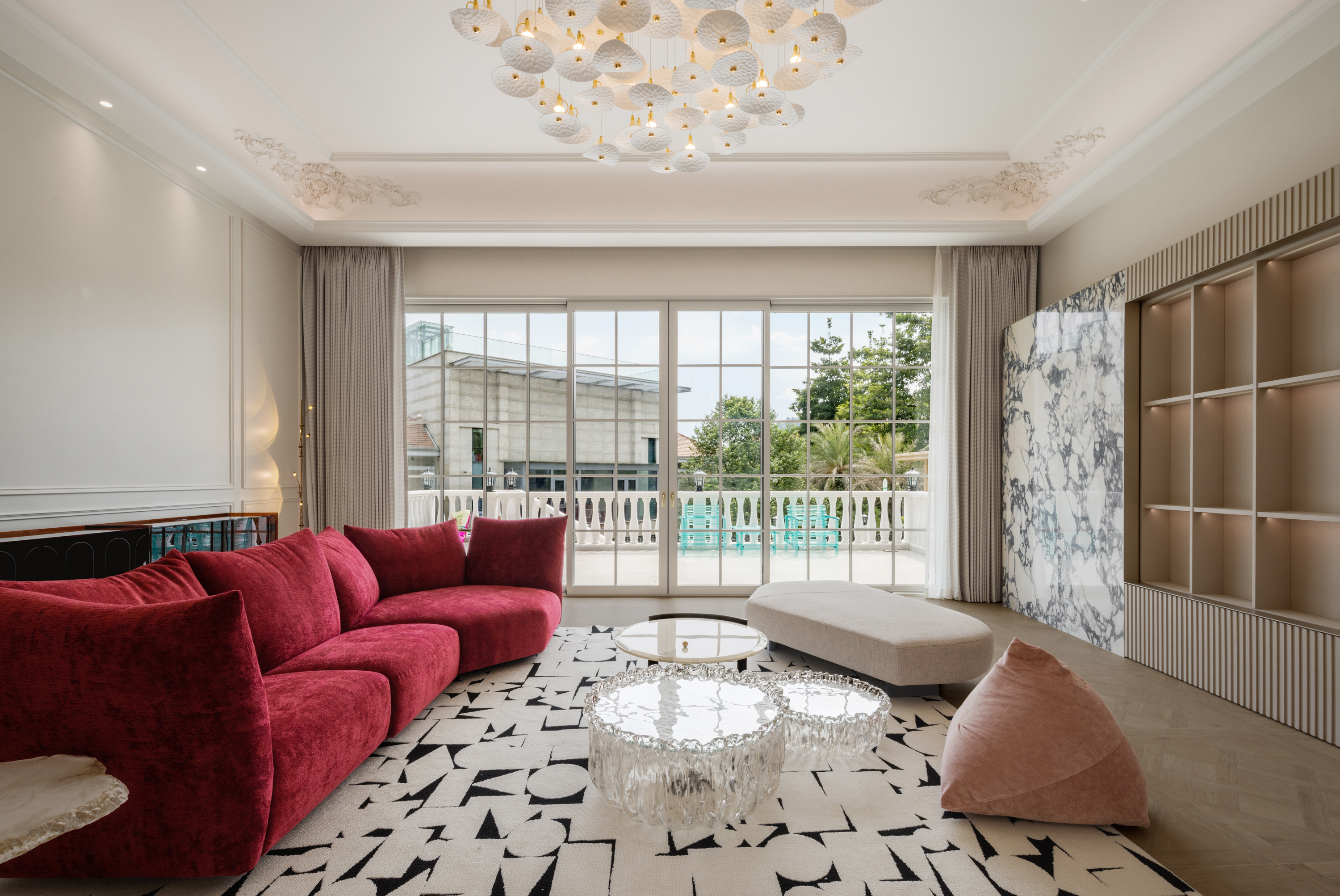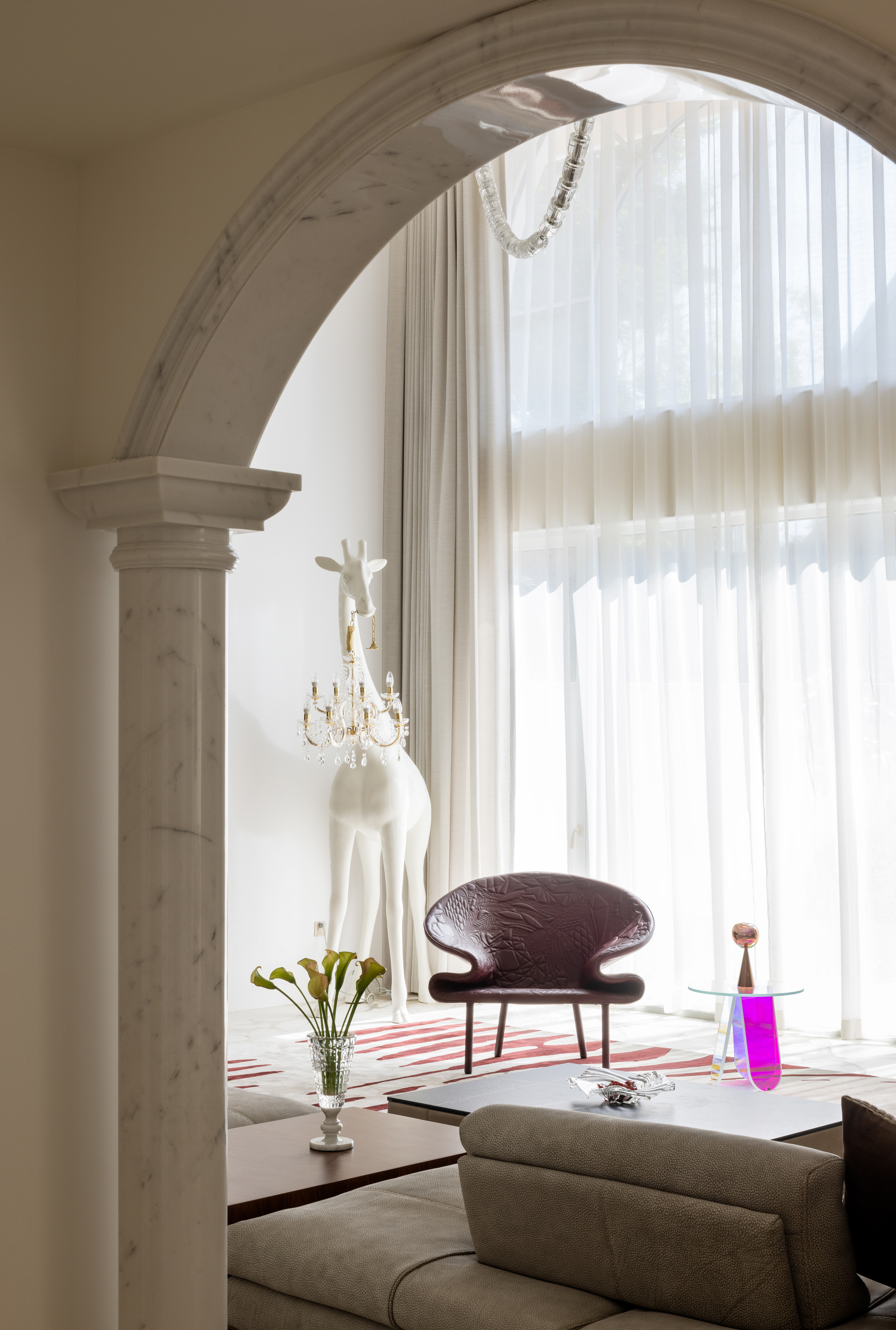 空间布局:法式优雅与现代简约于此和谐相融,拱形立柱、螺旋楼梯与水晶灯光勾勒出经典与现代交织的视觉印象。在纯粹的白色基调与极简线条中,艺术与自然悄然对话——阳台外珠江城景与室内绿植相映,构成一幅“流动的艺术绘画”;光影交织间,香槟色皮椅、玉白石餐桌与亚克力儿童展示柜,借材质与色彩的对比,进一步丰富了空间的质感层次。
