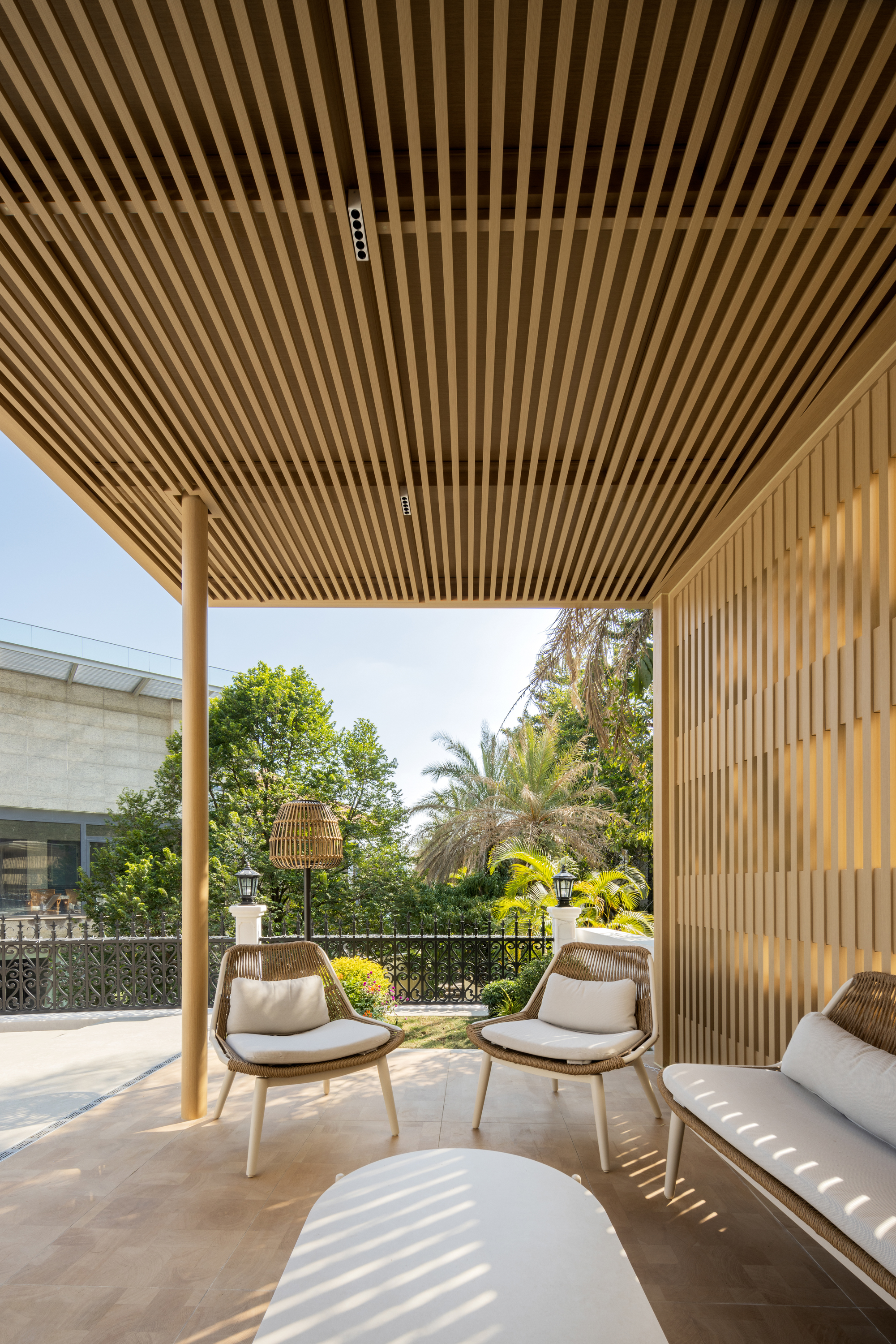 建筑总共4层,垂直呼吸体系层层递进,皆循生活之韵律而设,四层空间依江景走向开凿全景落地窗,独享360°环幕式生态景观——推窗可见珠江天际线蜿蜒如练,侧耳可闻林间鸟鸣私语,晨昏光影流转间,绘就「离尘不离城」的诗意栖居范本。