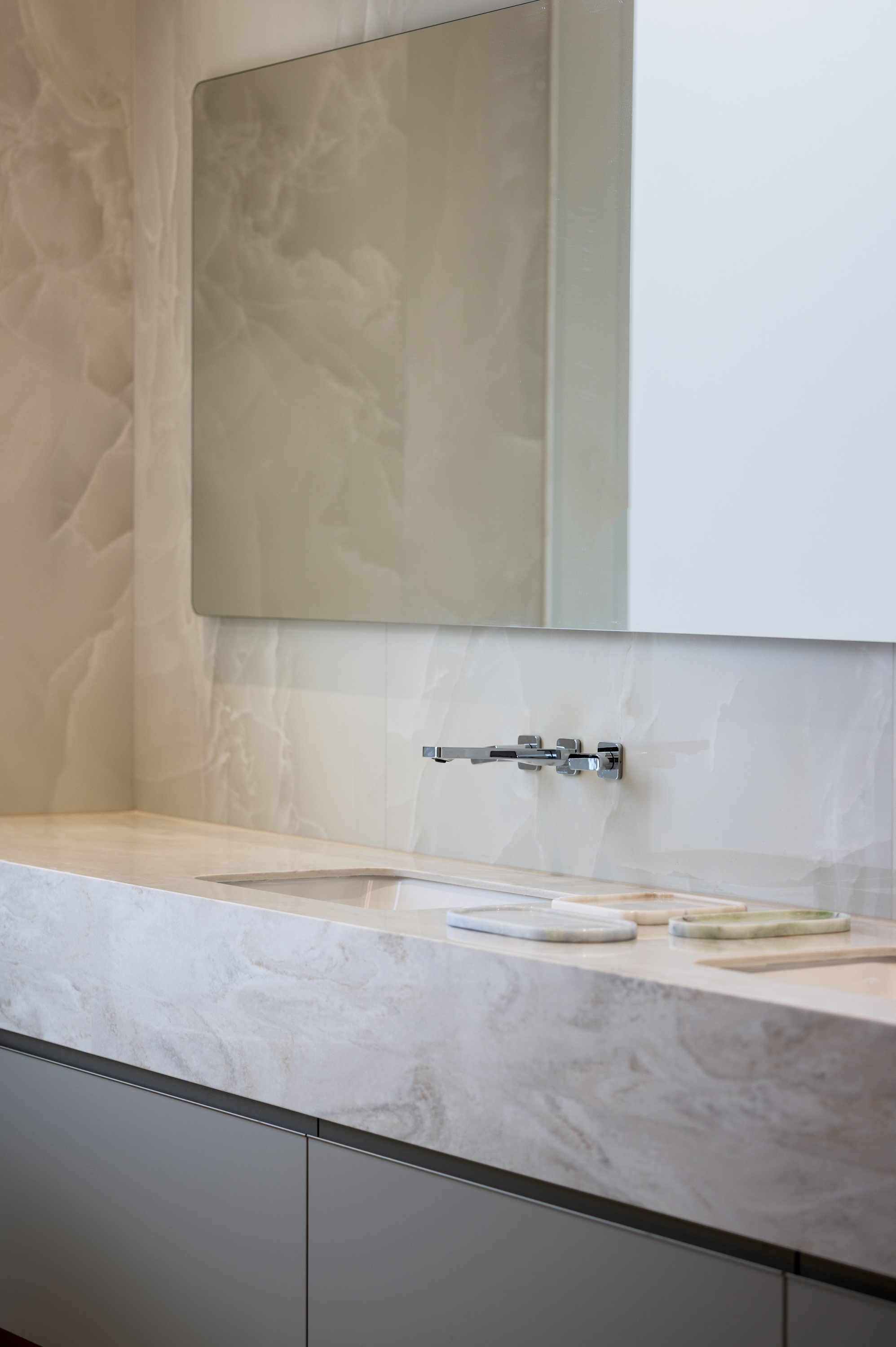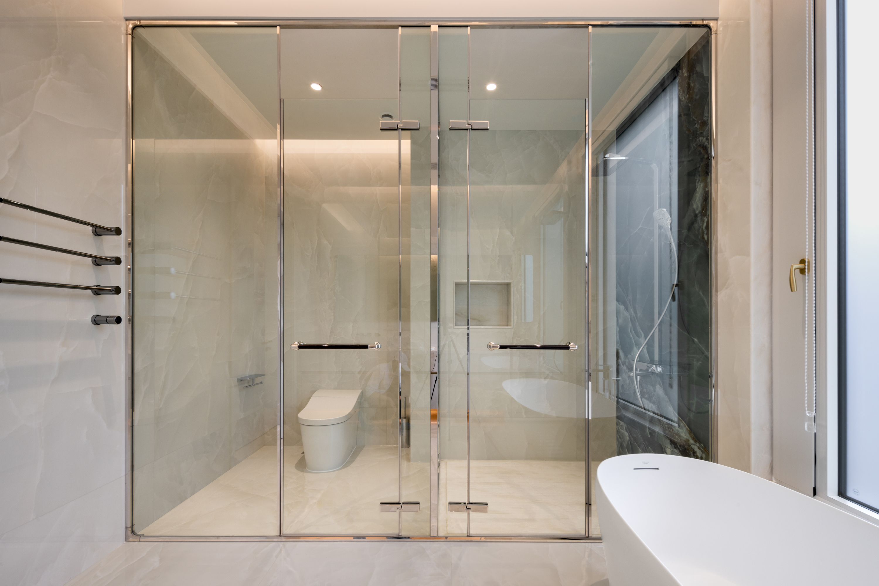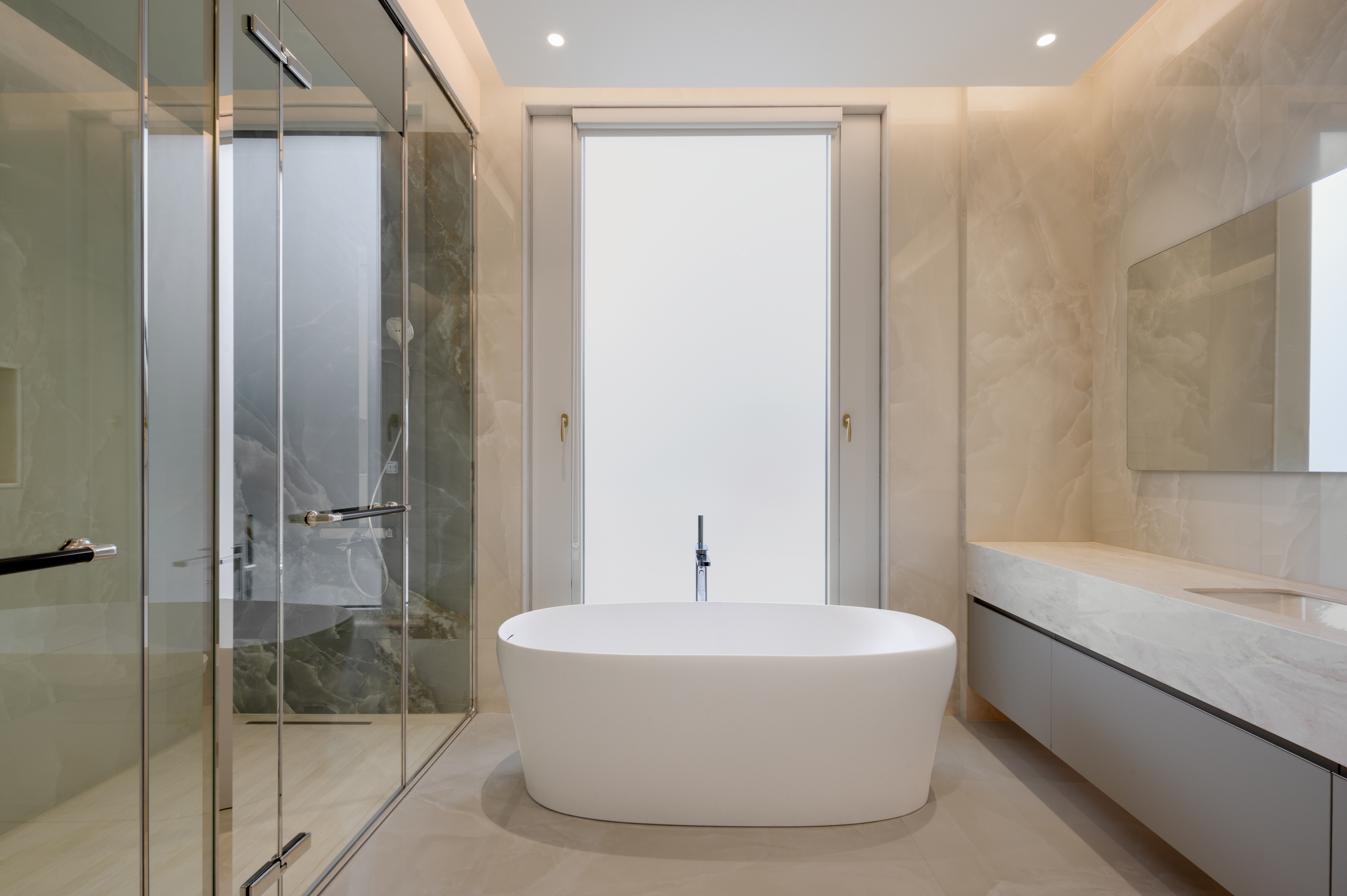 浴室采用低奢大理石台面,简约的线条搭配若隐若现的花纹无形中增添一丝古典韵味,隐藏式LED灯带柔和地照亮每一寸空间,让每一次沐浴都成为一场关于美的仪式。