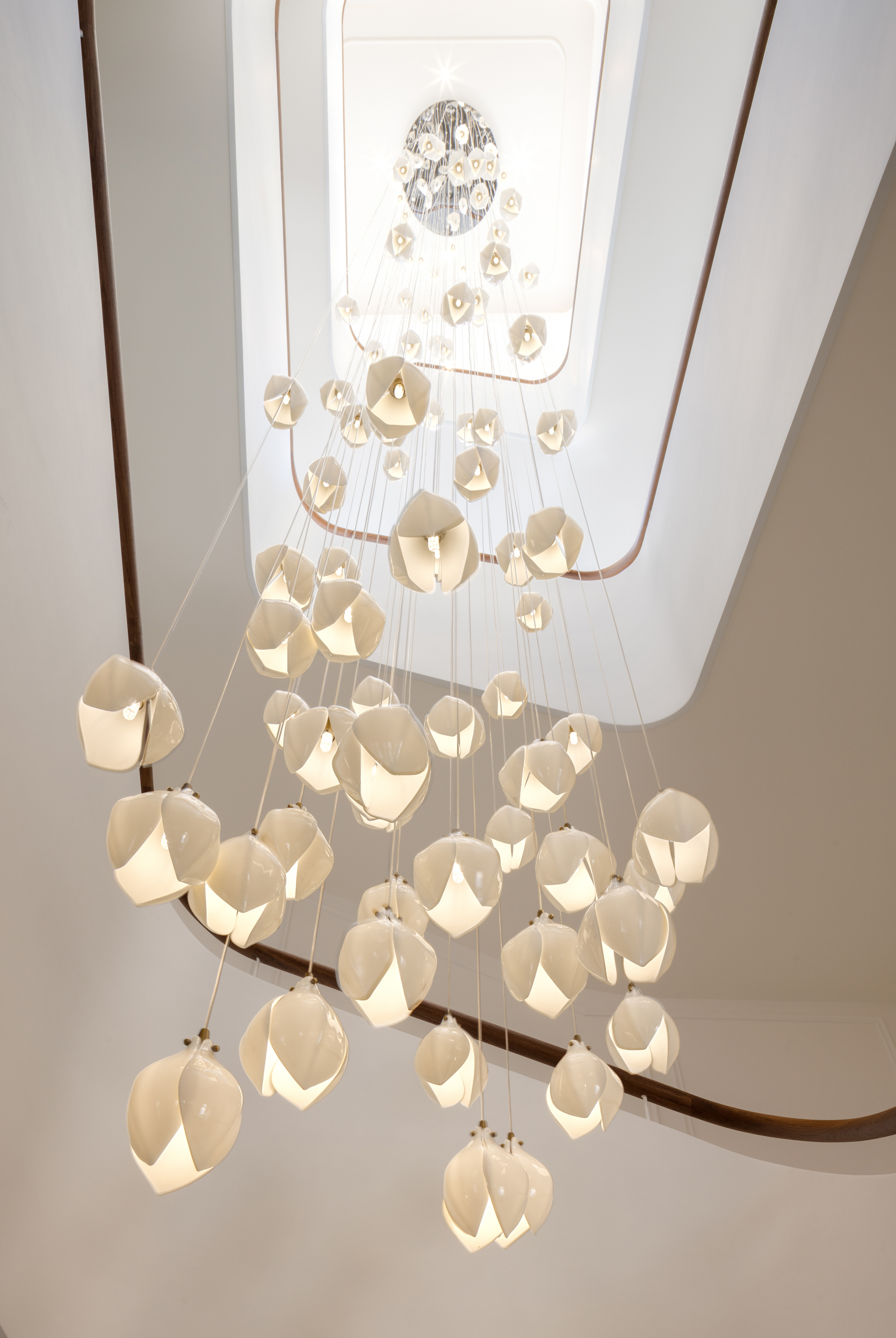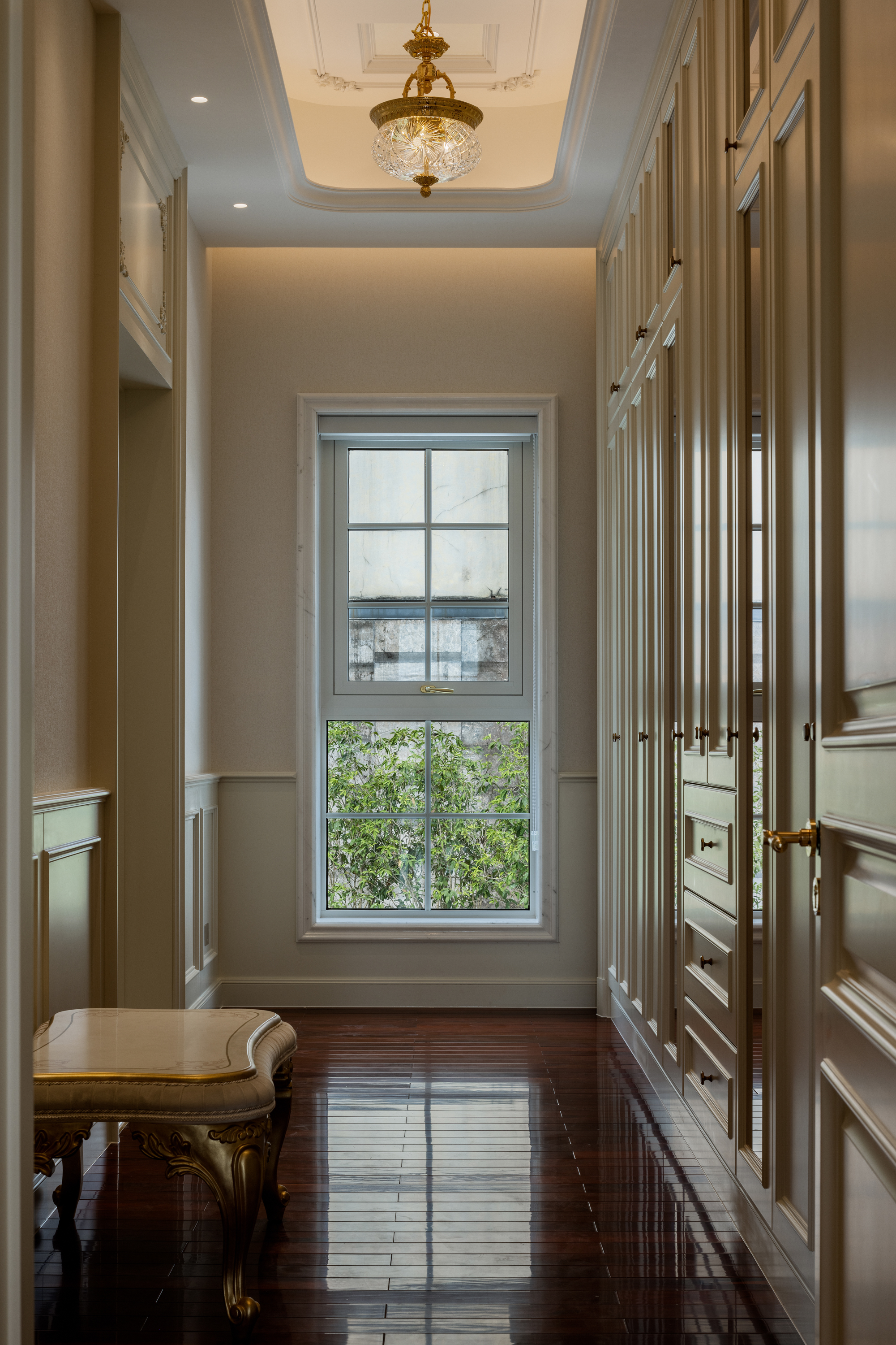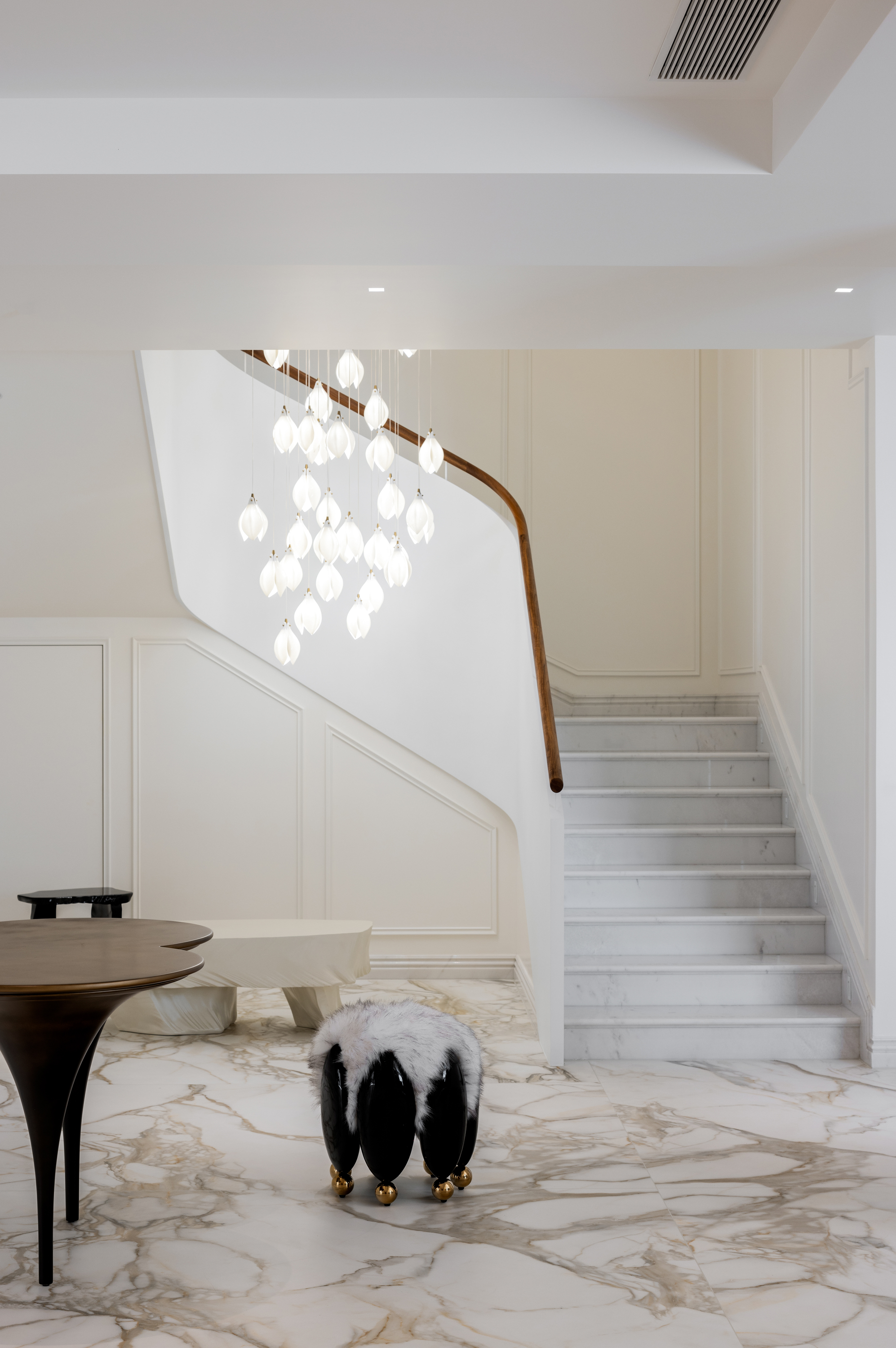 入户极具仪式感的门厅,简约的白色基调,引领视线延伸至楼上,直至天际。大理石雕琢的旋转楼梯,引天光、水色、绿意倾泻入室,在光影中缓缓铺展,与璀璨夺目的水晶灯饰交相辉映共筑「光之序曲」。
