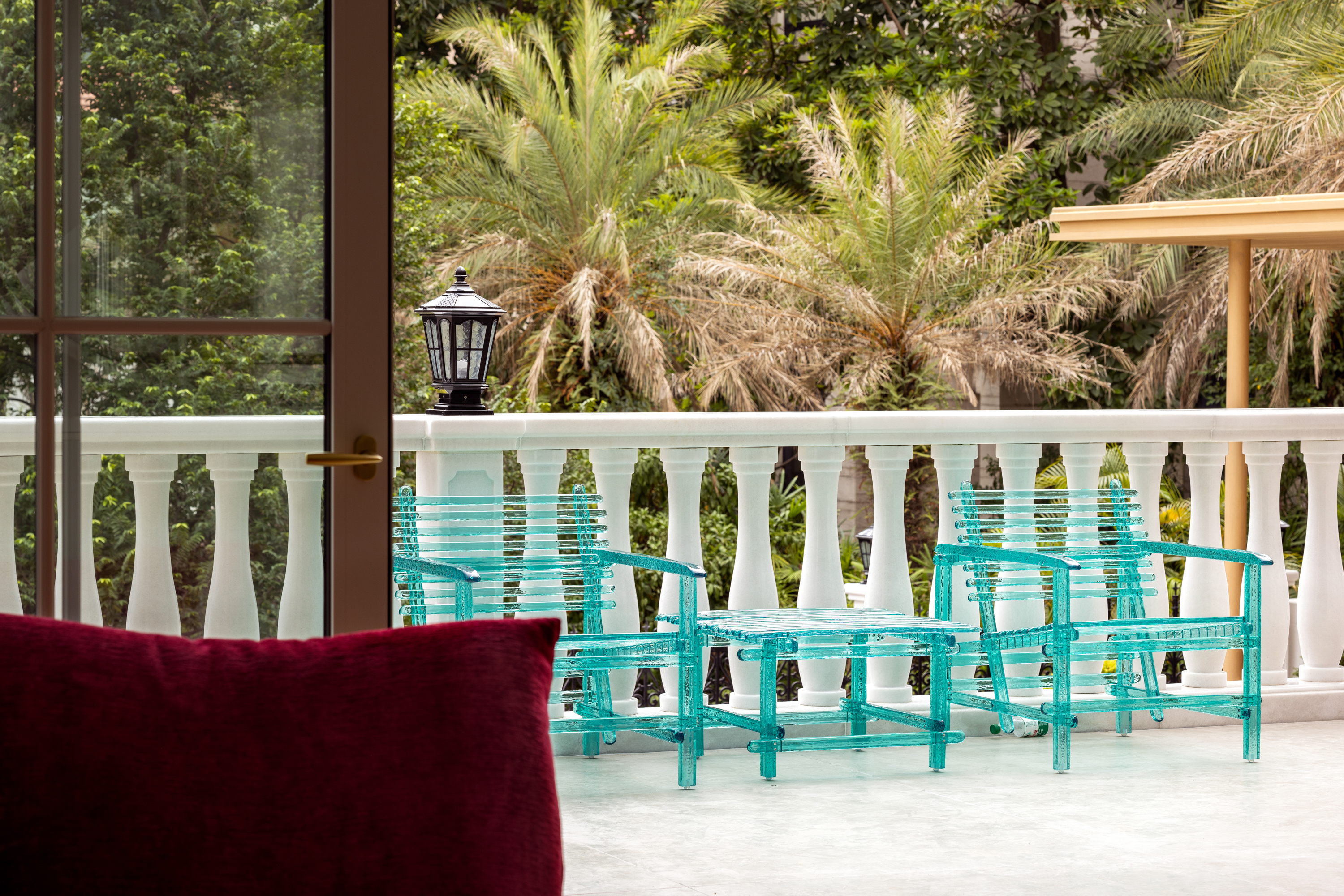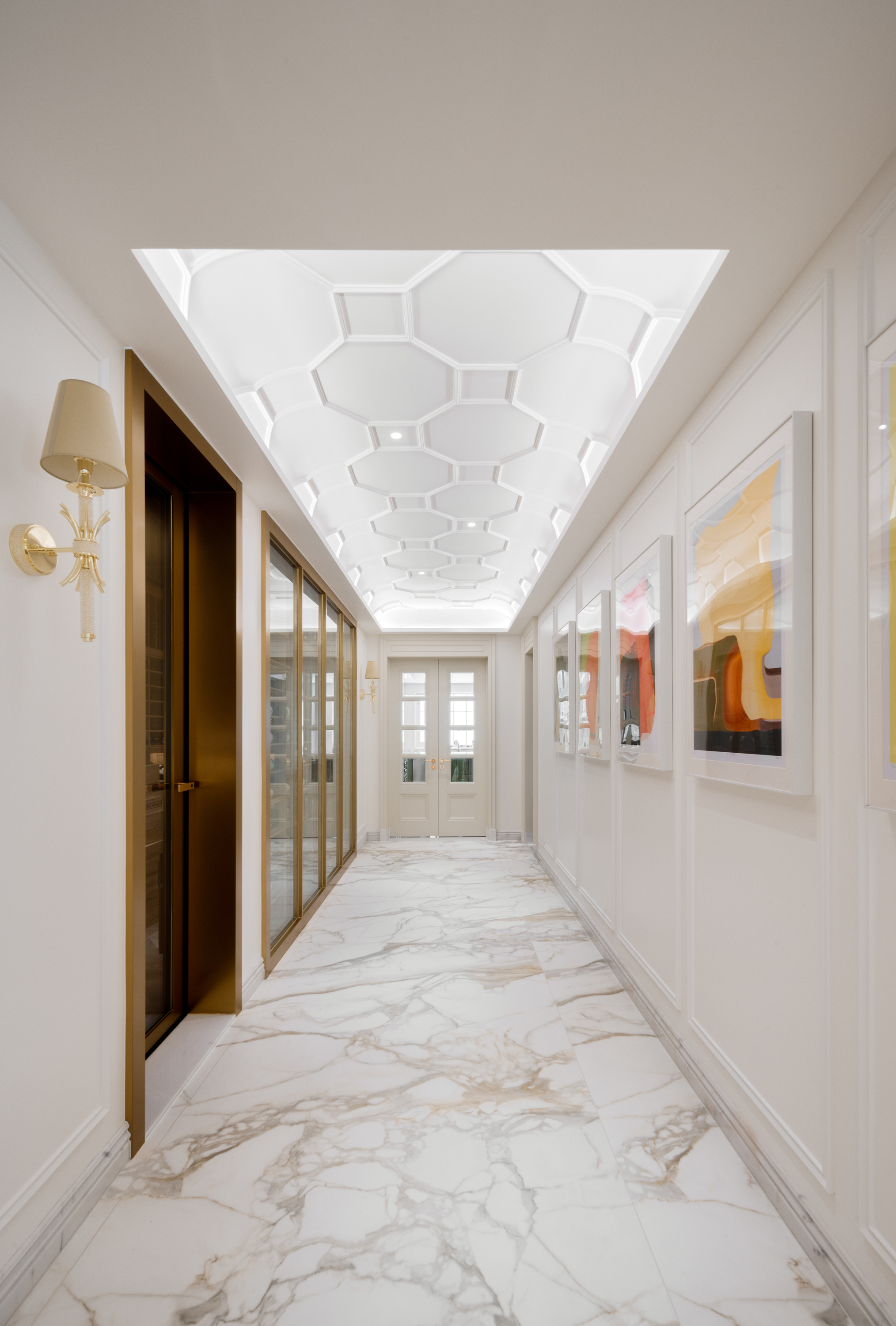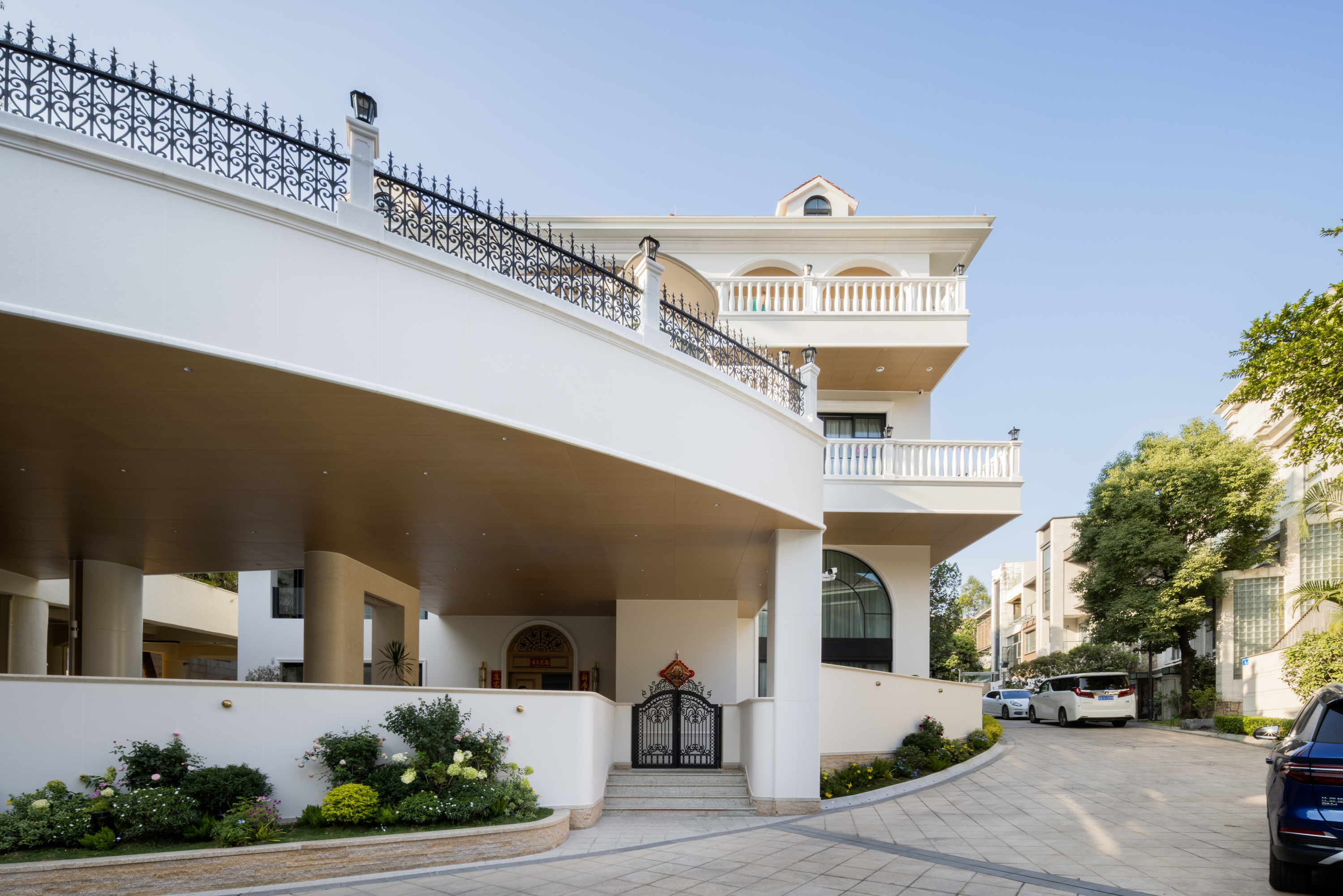 优雅的拱形立柱犹如一曲温柔的诗篇,以柔和而富有诗意的空间语言,邀请人们放慢脚步,一旁静静伫立的白马雕塑,以其流畅的线条与矫健的姿态构建是力量与优雅的化身,与空间形成和谐对话,暗涌着居者对自由、高贵生活的不懈追求。