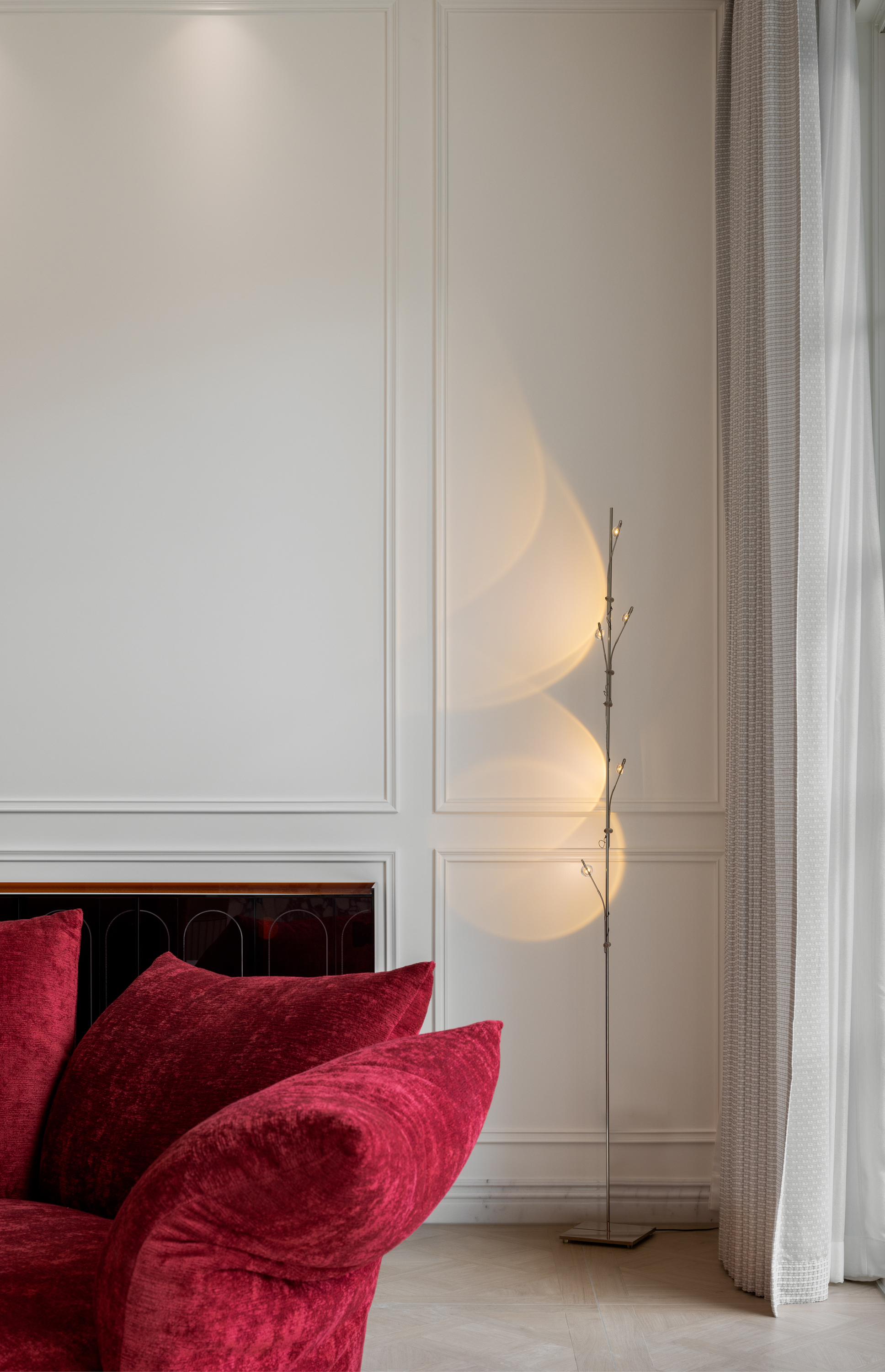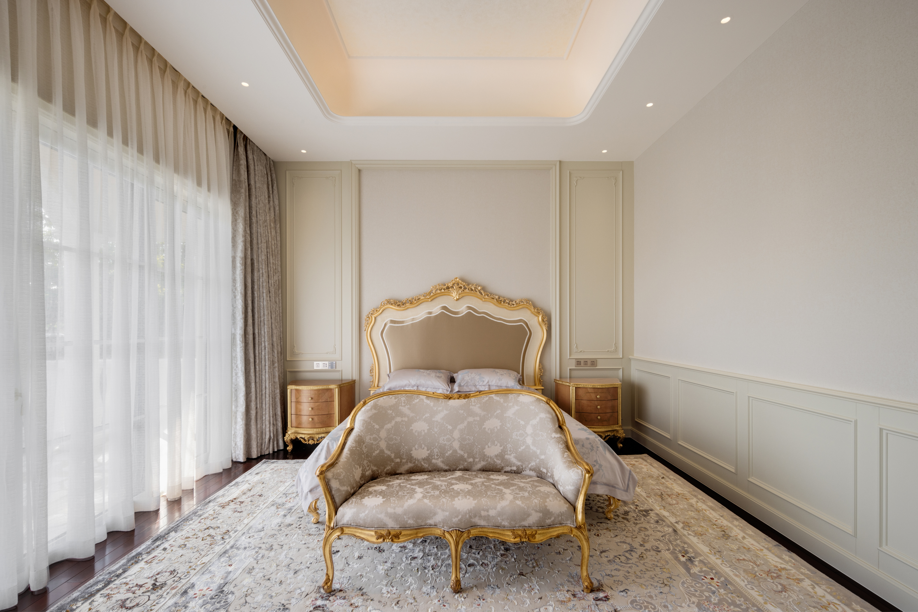 空间不止于居住容器,更是情感与艺术的载体:卧室是柔软、轻盈、明亮的代名词,丝绸材质的床品以其细腻触感与光泽勾勒低调的奢华,香槟配色尽显柔与微妙。