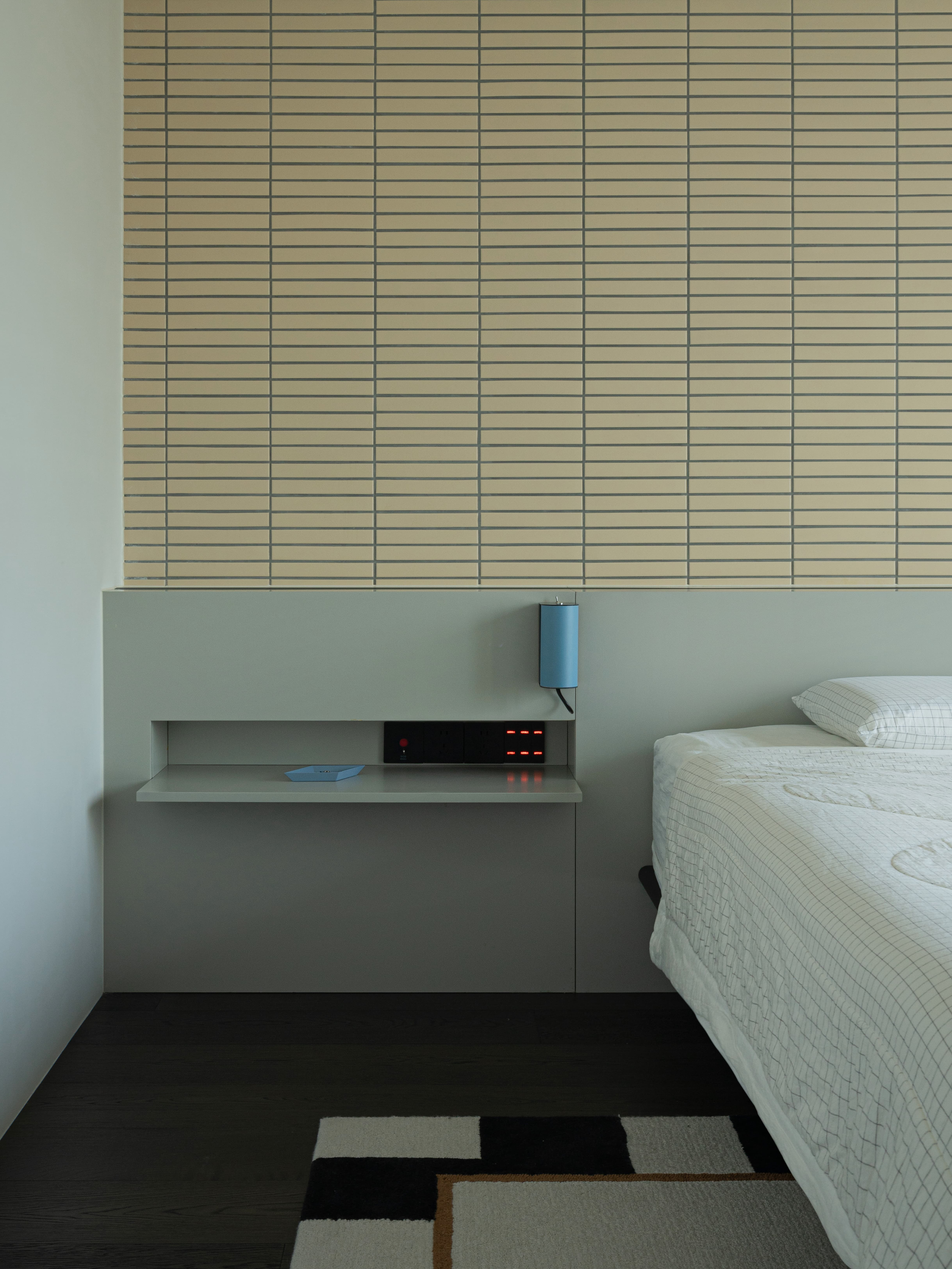 床头米黄色小砖象征日出初光,轻柔包裹情绪。
