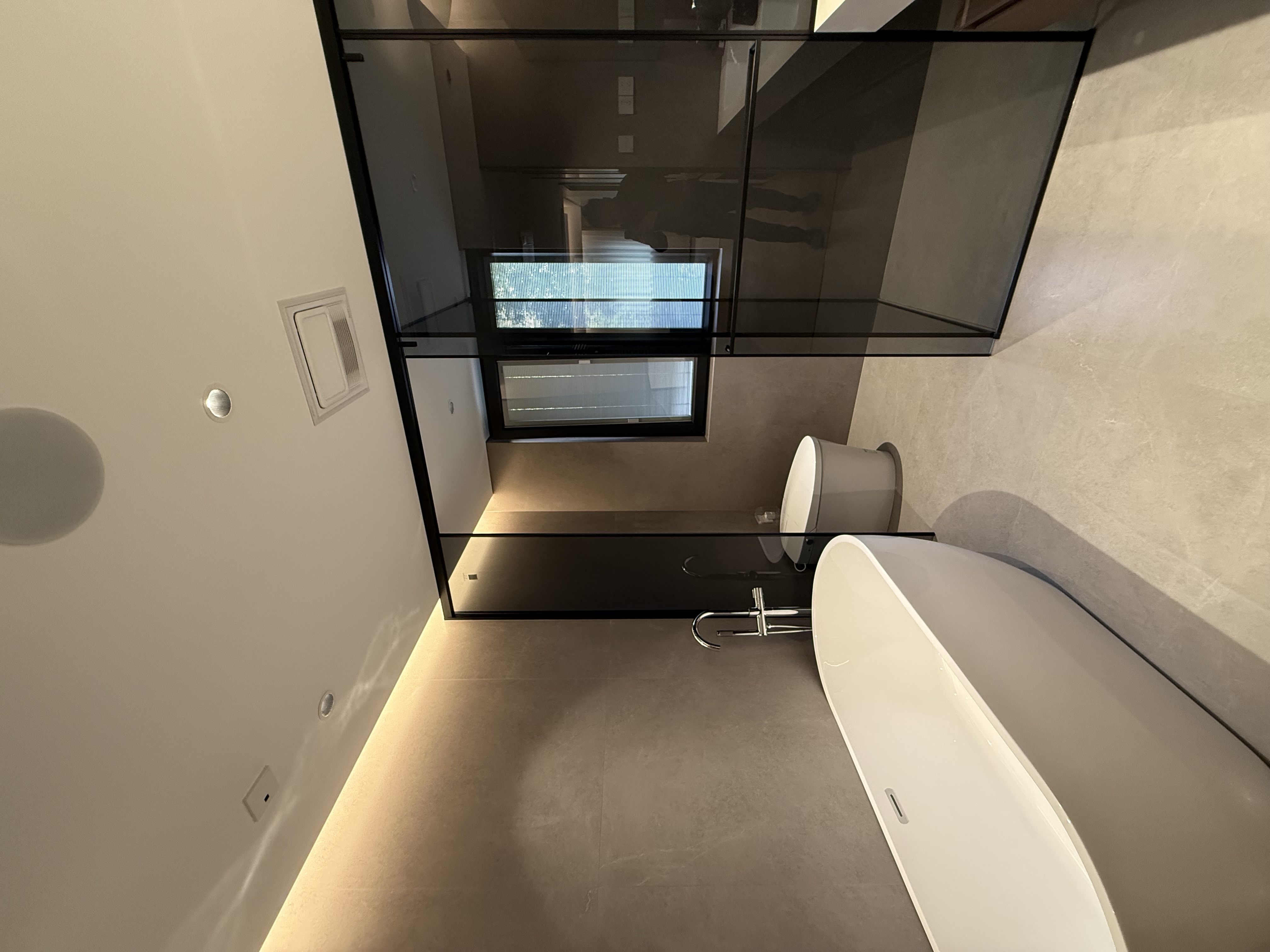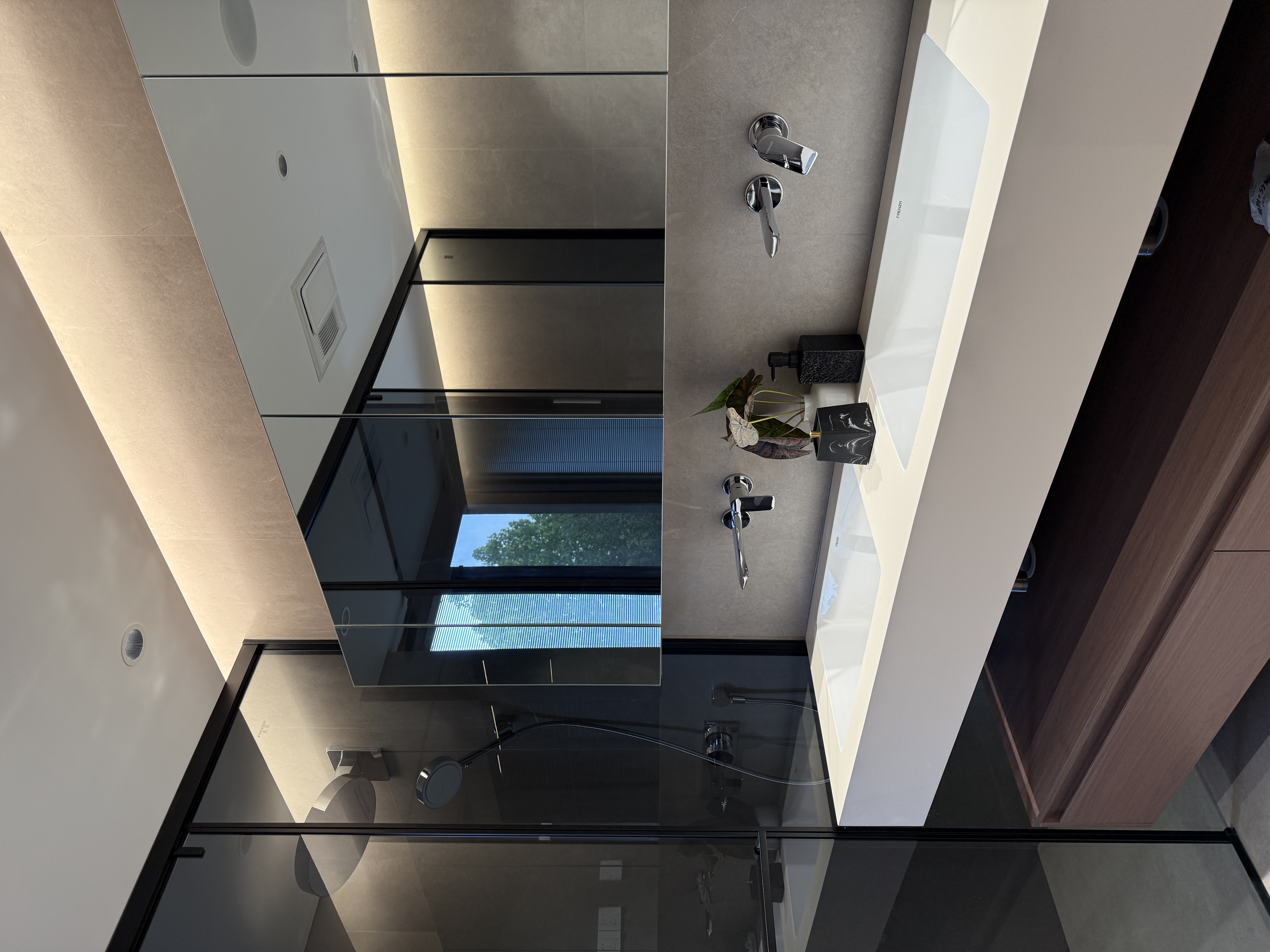 浴室以大镜面与暗藏灯带延伸视觉,玻璃隔断让空间通透,石材与木质搭配,在简约中营造出开阔且精致的卫浴氛围。 The bathroom uses a large mirror and concealed light strips to extend the visual space. Glass partitions enhance spatial transparency, while the combination of stone and wood creates an open and exquisite bathroom atmosphere within a minimalist style.