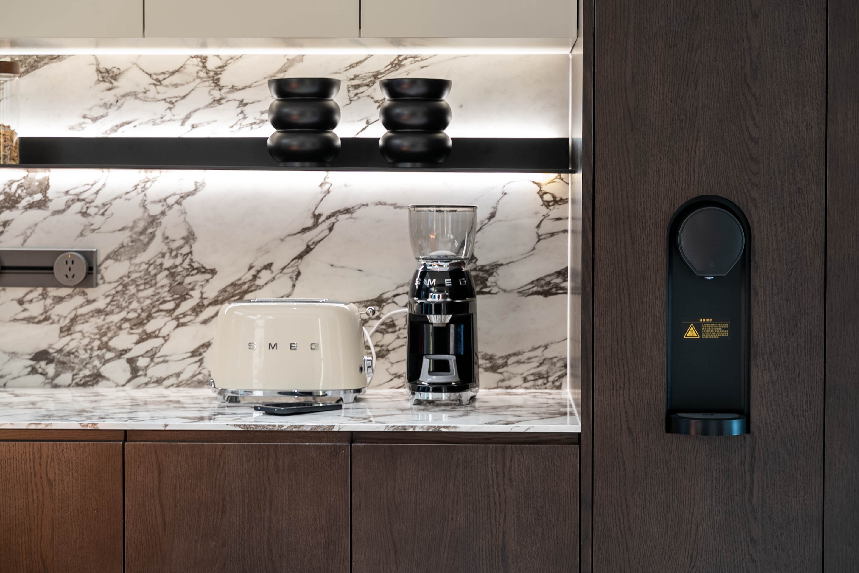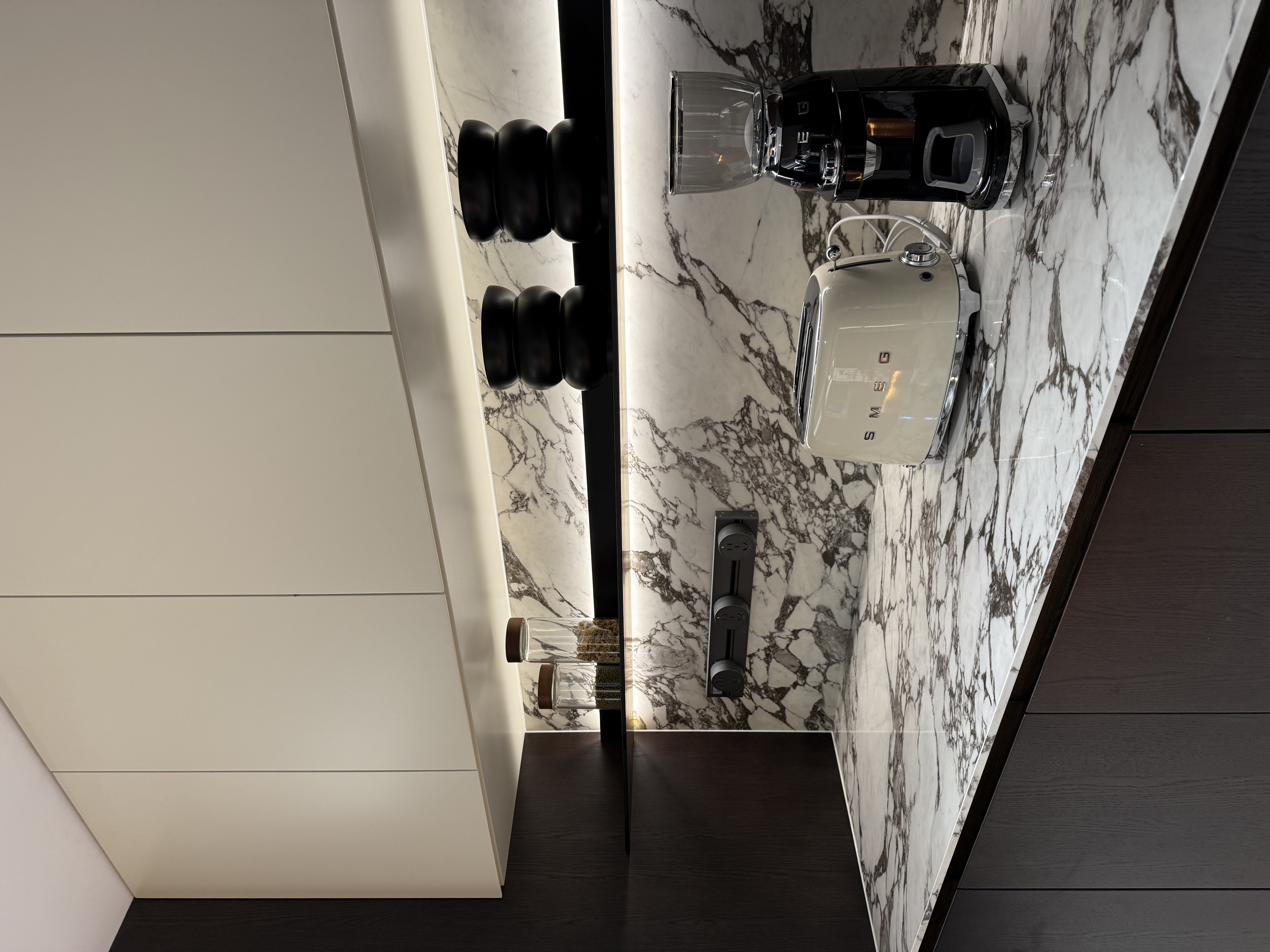餐边柜以大理石岩板呈现自然纹理,搭配暗藏灯带与黑白配饰品,在精致中凸显高级质感与空间层次。 The sideboard features natural textures with marble slabs, paired with concealed light strips and black-and-white accessories. It highlights a high-end texture and spatial hierarchy while maintaining an exquisite style.