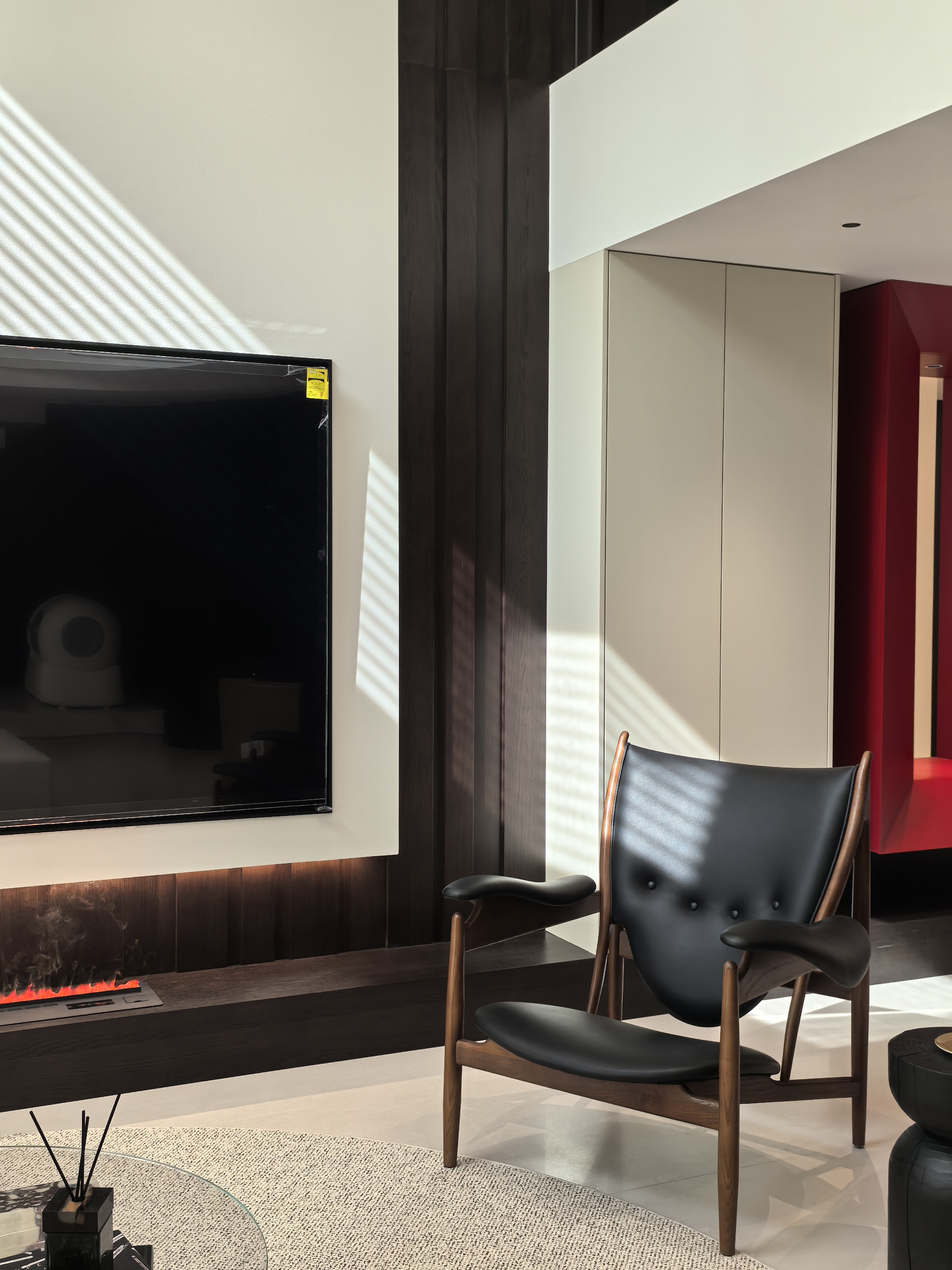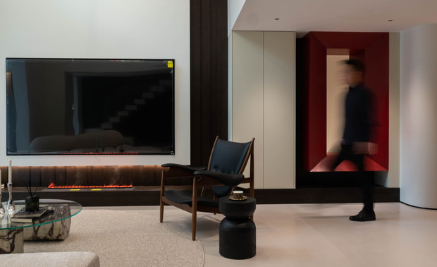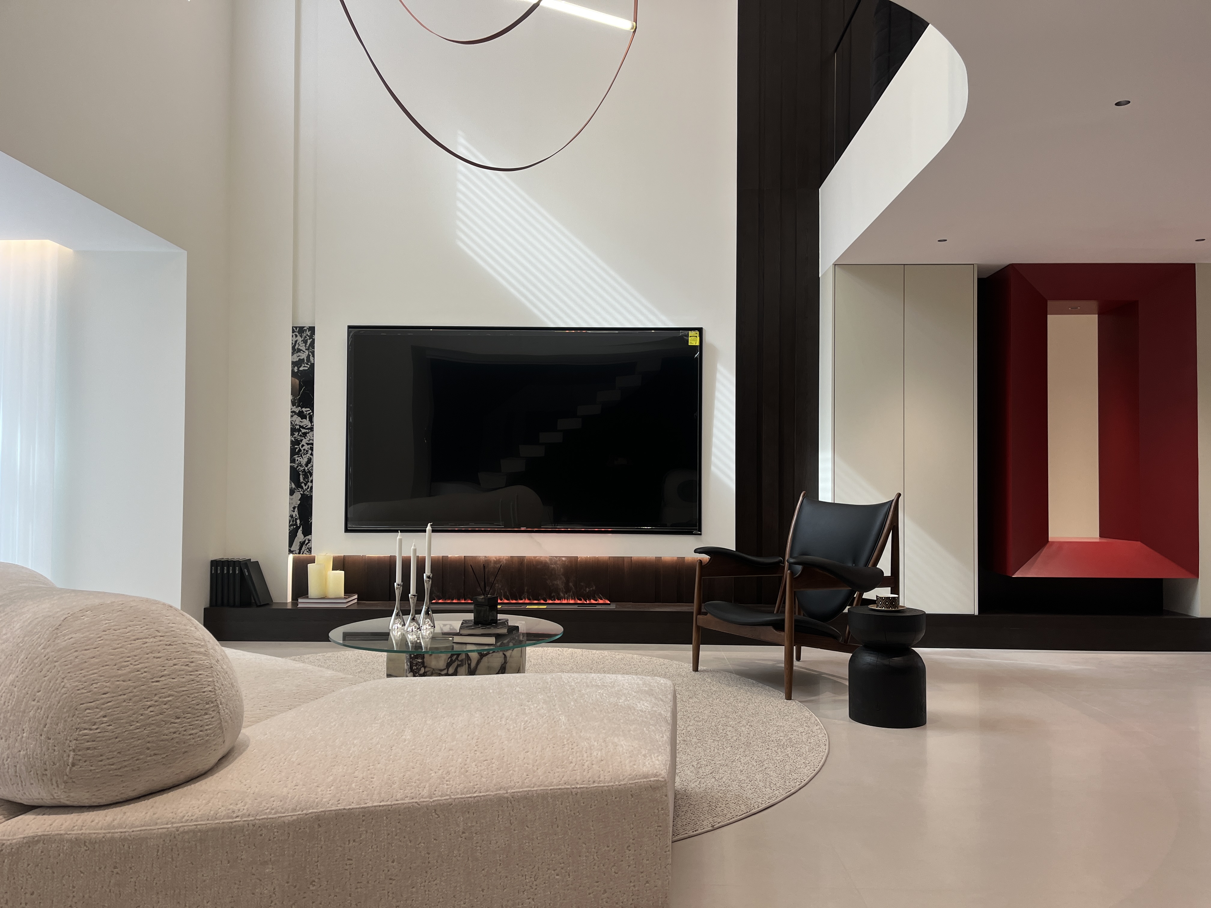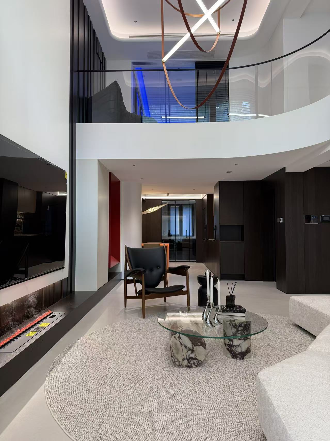 以挑空结构结合艺术吊灯,百叶光影与壁炉灯带交织,红框元素点睛,在开阔空间中营造出富有层次的光影艺术氛围。 By combining a double-height structure with an artistic chandelier, the design weaves the light and shadow of shutters with the light strips of the fireplace, and uses red-framed elements as focal accents—creating a layered light and shadow art atmosphere in the spacious space.