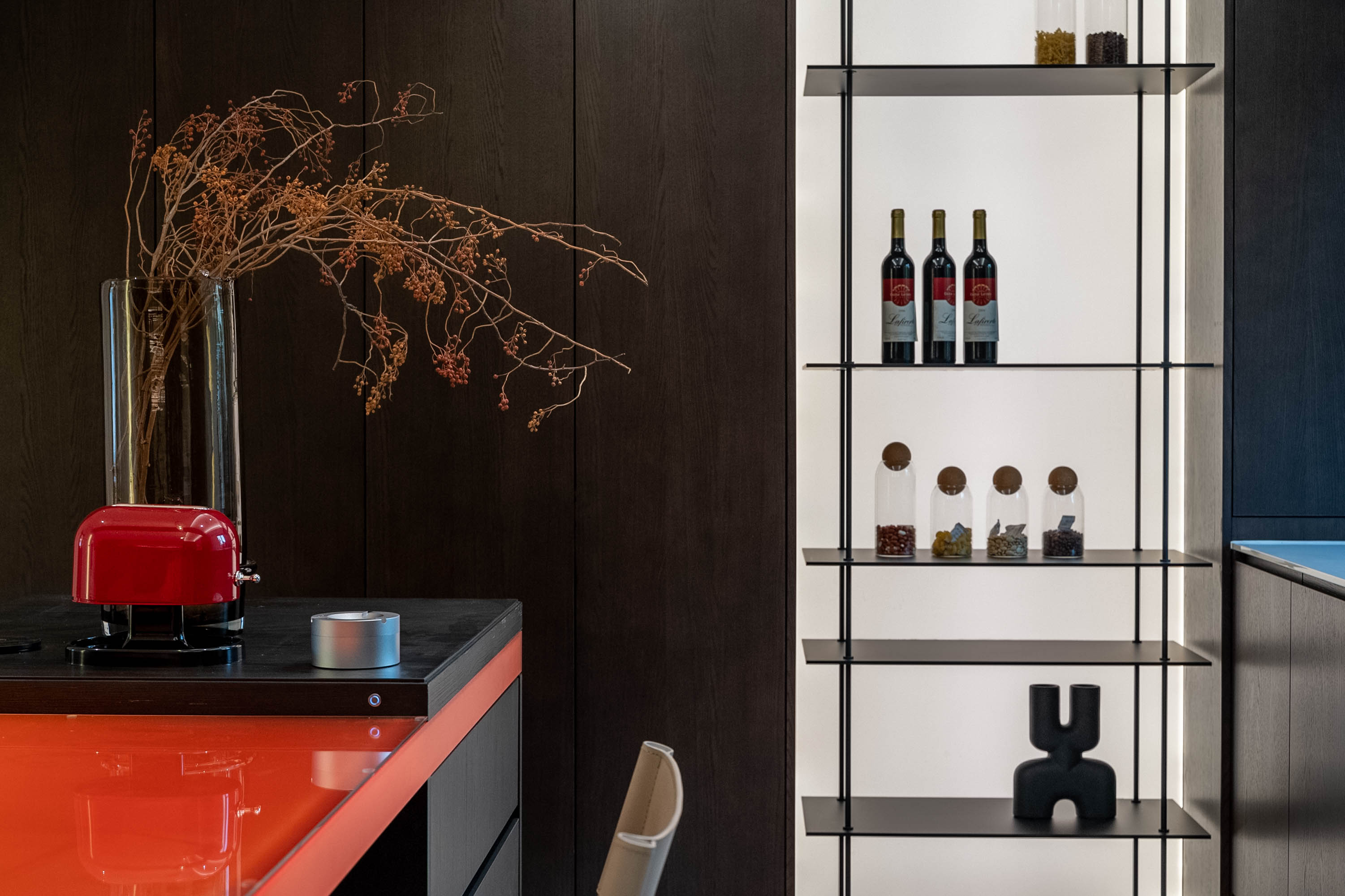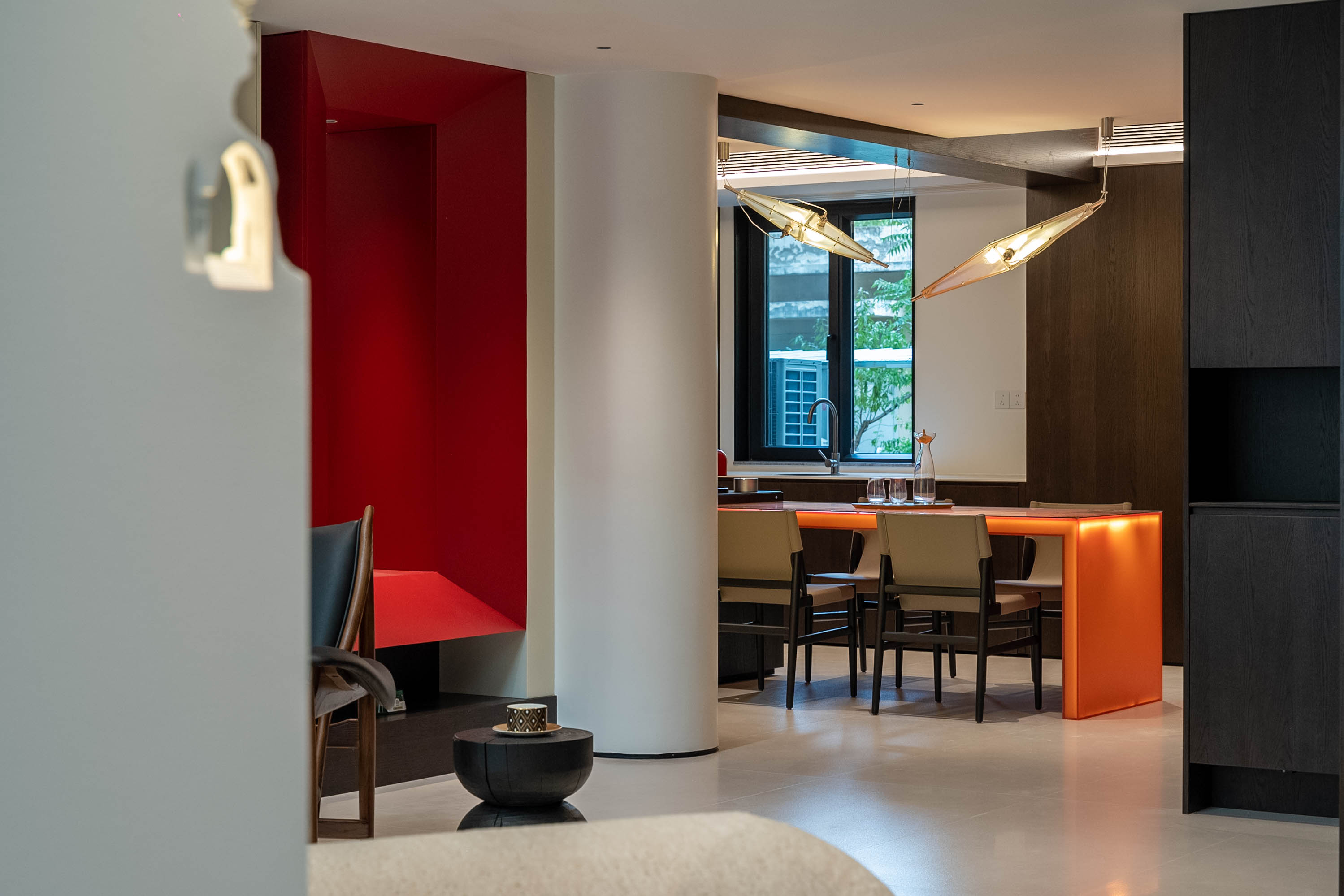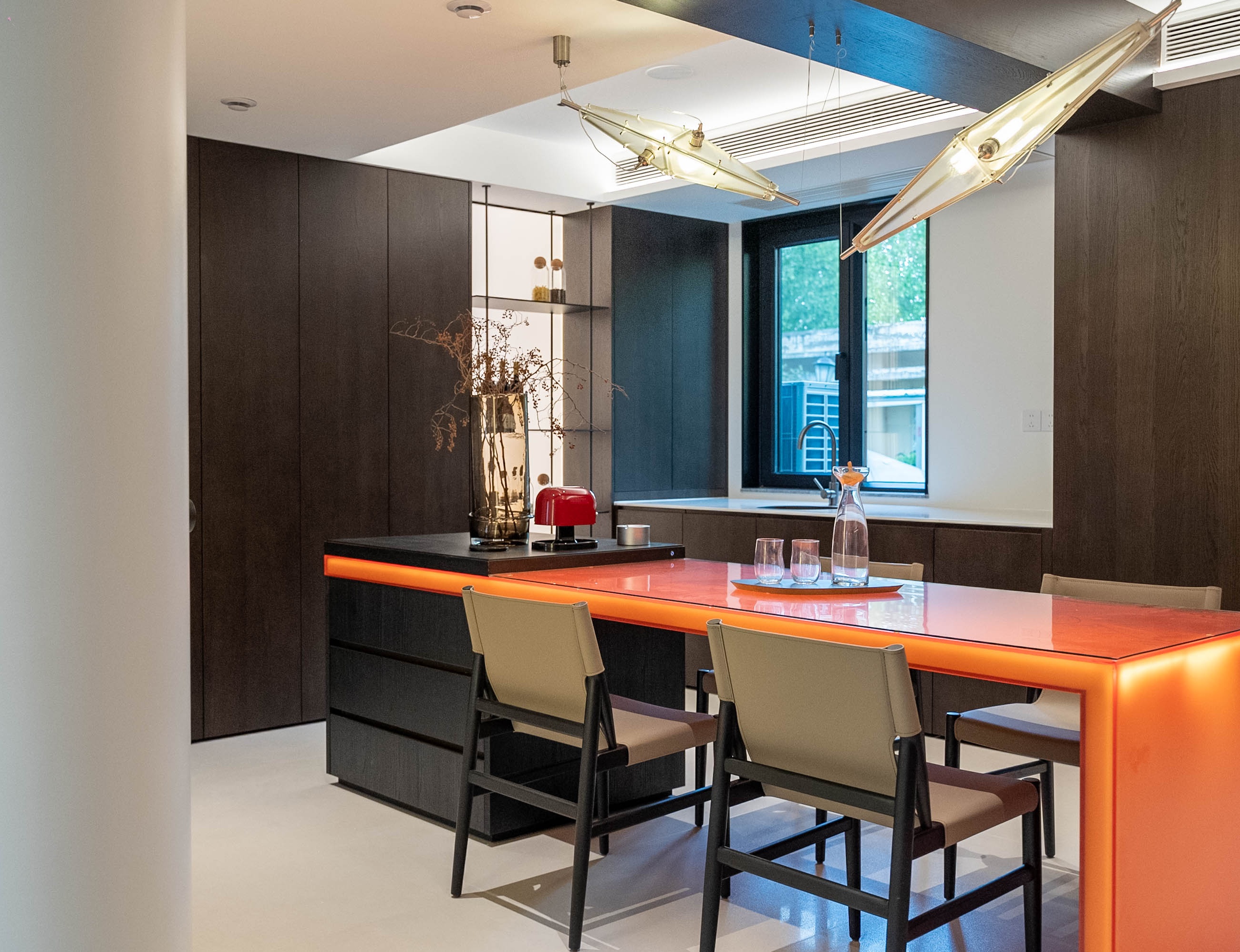 餐厨区以发光岛台打造视觉焦点,深色柜体与独特吊灯形成层次,窗景引入让空间在精致中兼具通透感。 The dining-kitchen area uses an illuminated island to create a visual focal point. Dark cabinetry and a unique chandelier form a sense of hierarchy, while the introduction of window views endows the space with both delicacy and transparency.