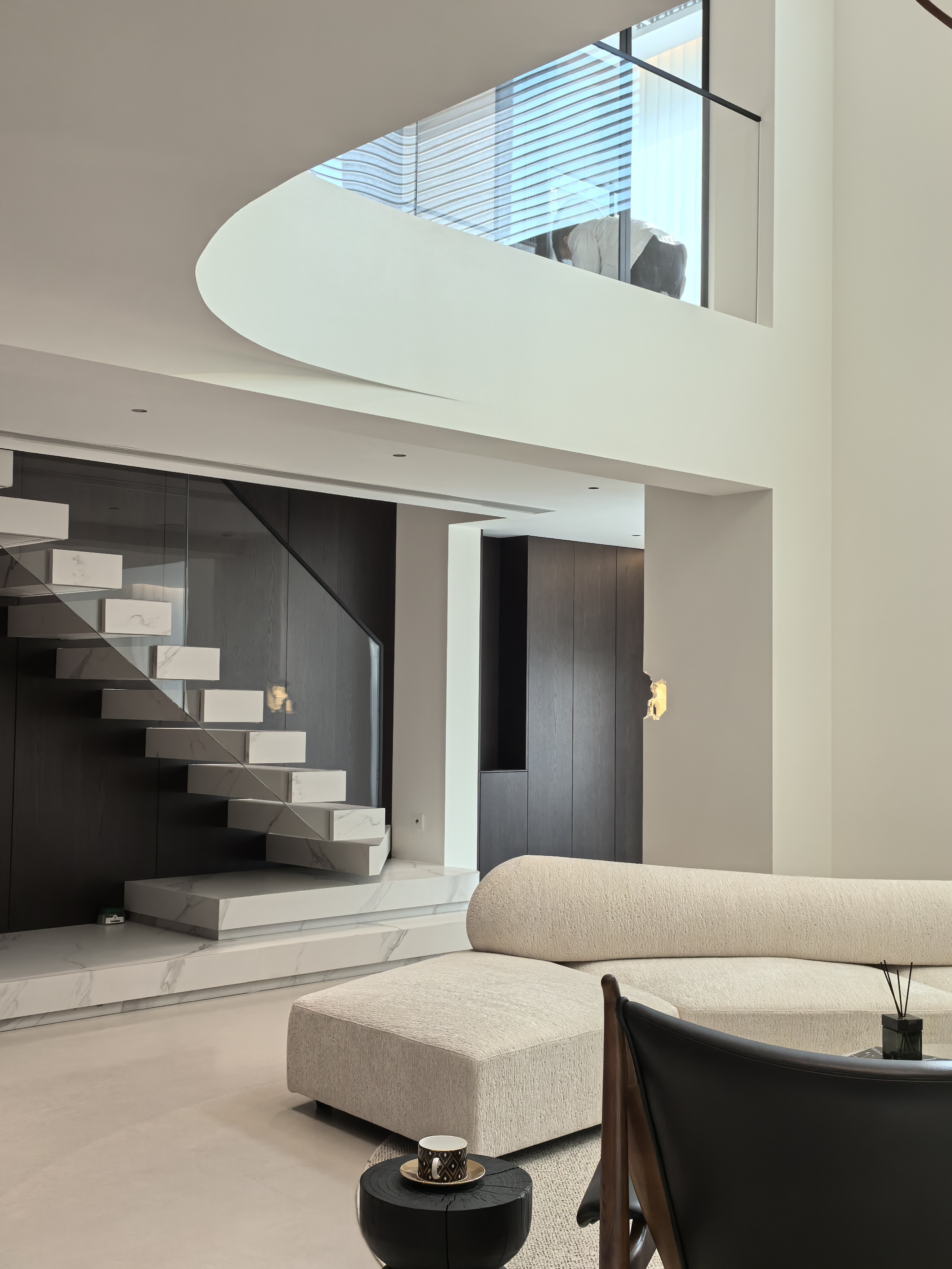 以挑空结构与弧形元素营造开阔感,玻璃护栏楼梯延伸纵向视觉,浅色调搭配简约家具,让空间大气通透且具艺术格调 The design uses a double-height structure and curved elements to create a sense of spaciousness, extends the vertical vision with a glass-railed staircase, and pairs light tones with minimalist furniture—resulting in a space that is grand, transparent, and endowed with artistic style.