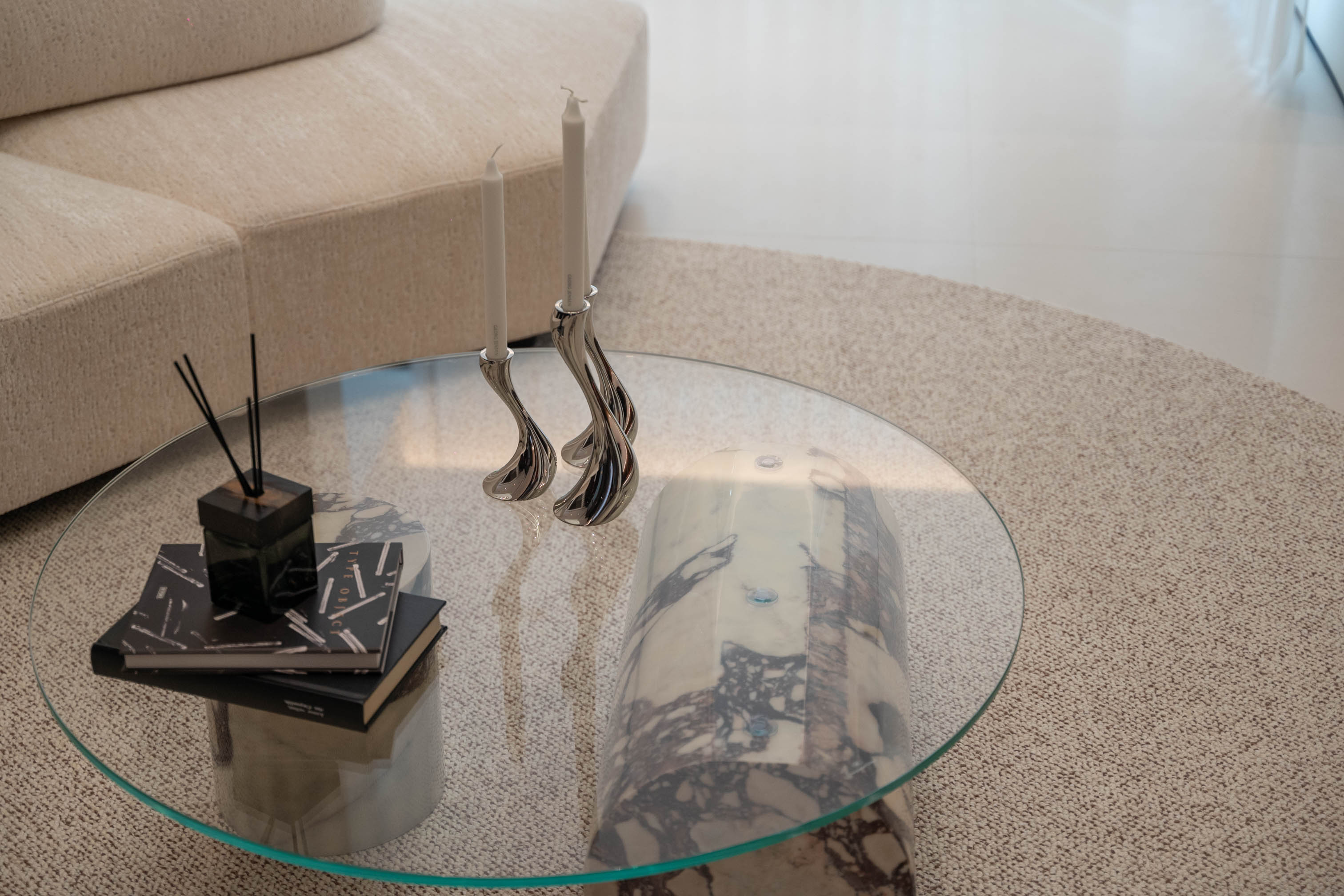 玻璃与大理石虚实结合,透明材质衬出石材纹理的质感。 Glass and marble are combined in a virtual-real interplay, with transparent materials highlighting the texture of the stone grain.