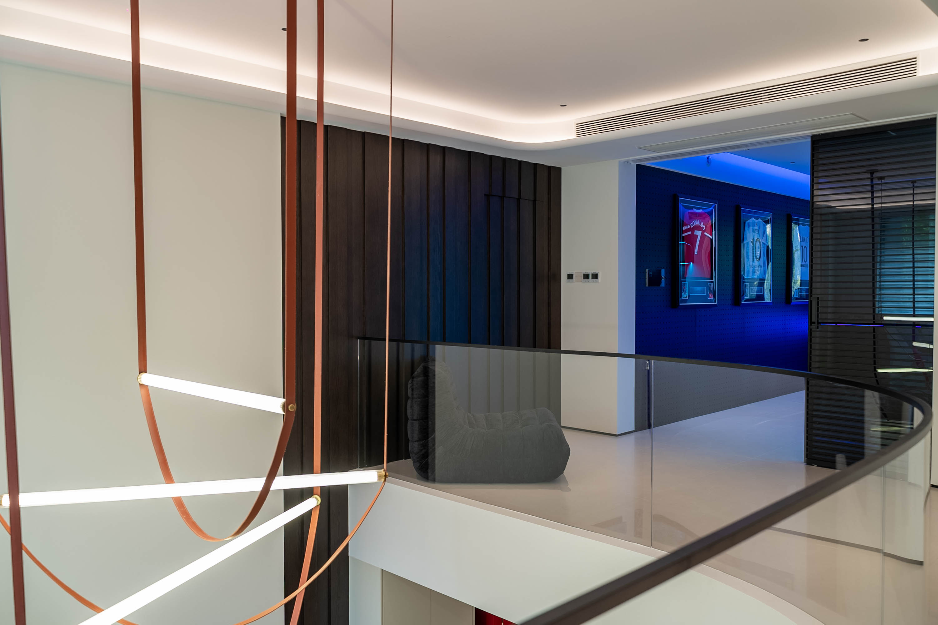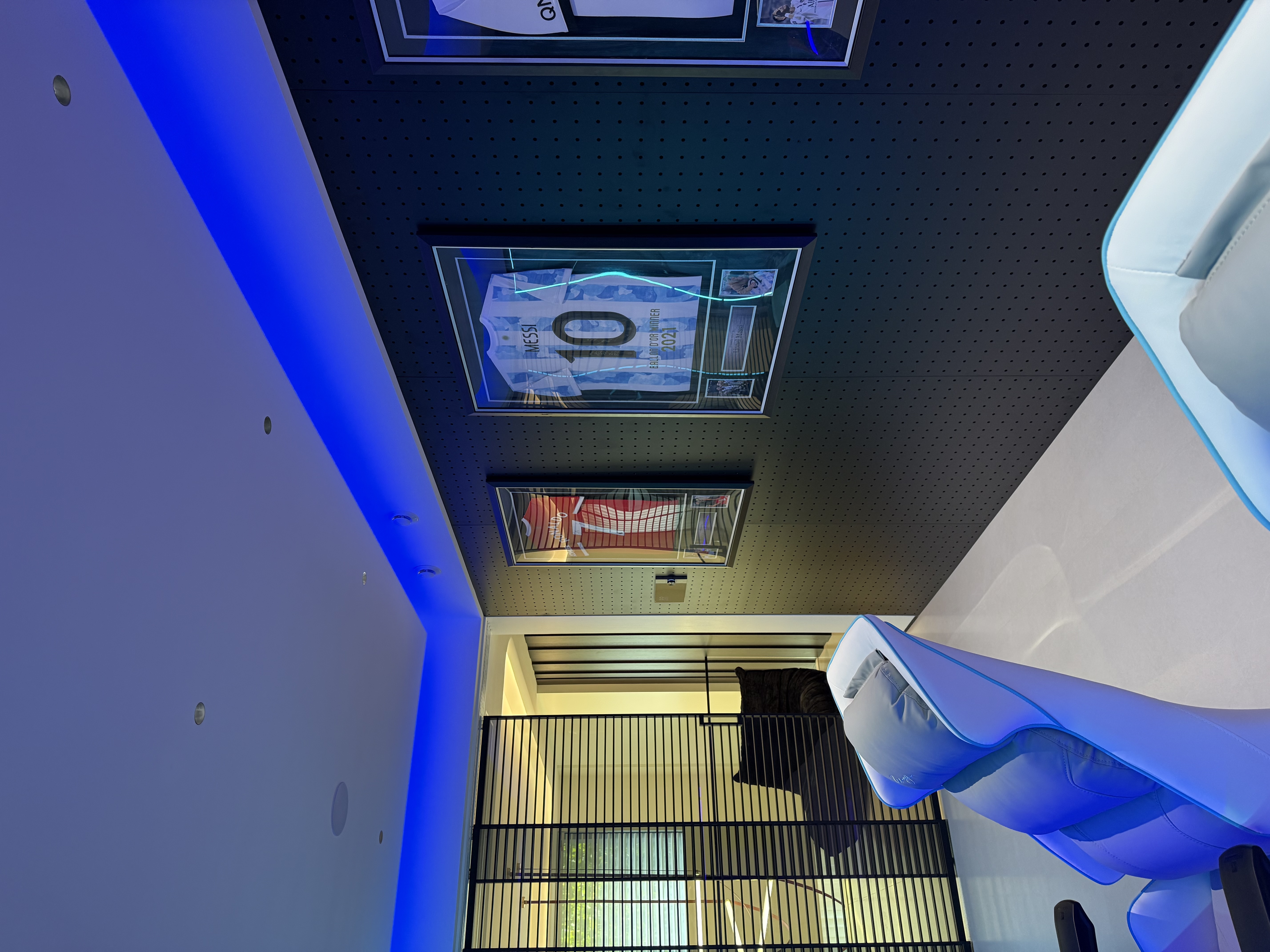 该电竞房以蓝色灯光为主调,穿孔墙展示球衣,搭配电竞椅,打造出科技感与运动氛围兼具的沉浸式空间。 The gaming room features blue lighting as its main tone, with a perforated wall for displaying jerseys and a matching gaming chair—creating an immersive space that combines a tech-savvy feel and a sports atmosphere.
