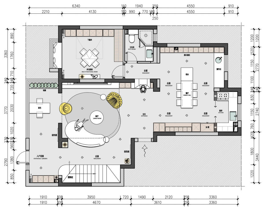 空间布局:针对原建筑南北不通透、楼梯局促昏暗的痛点,我们通过重构楼梯系统,使其成为兼具功能与艺术展示的空间焦点;拆除一层卧室,拓就开阔客厅形成小横厅格局,同时打造开放式厨房,彻底打通南北动线,让空间在通透感与视觉层次上实现双重跃升,重塑奢适居住体验。