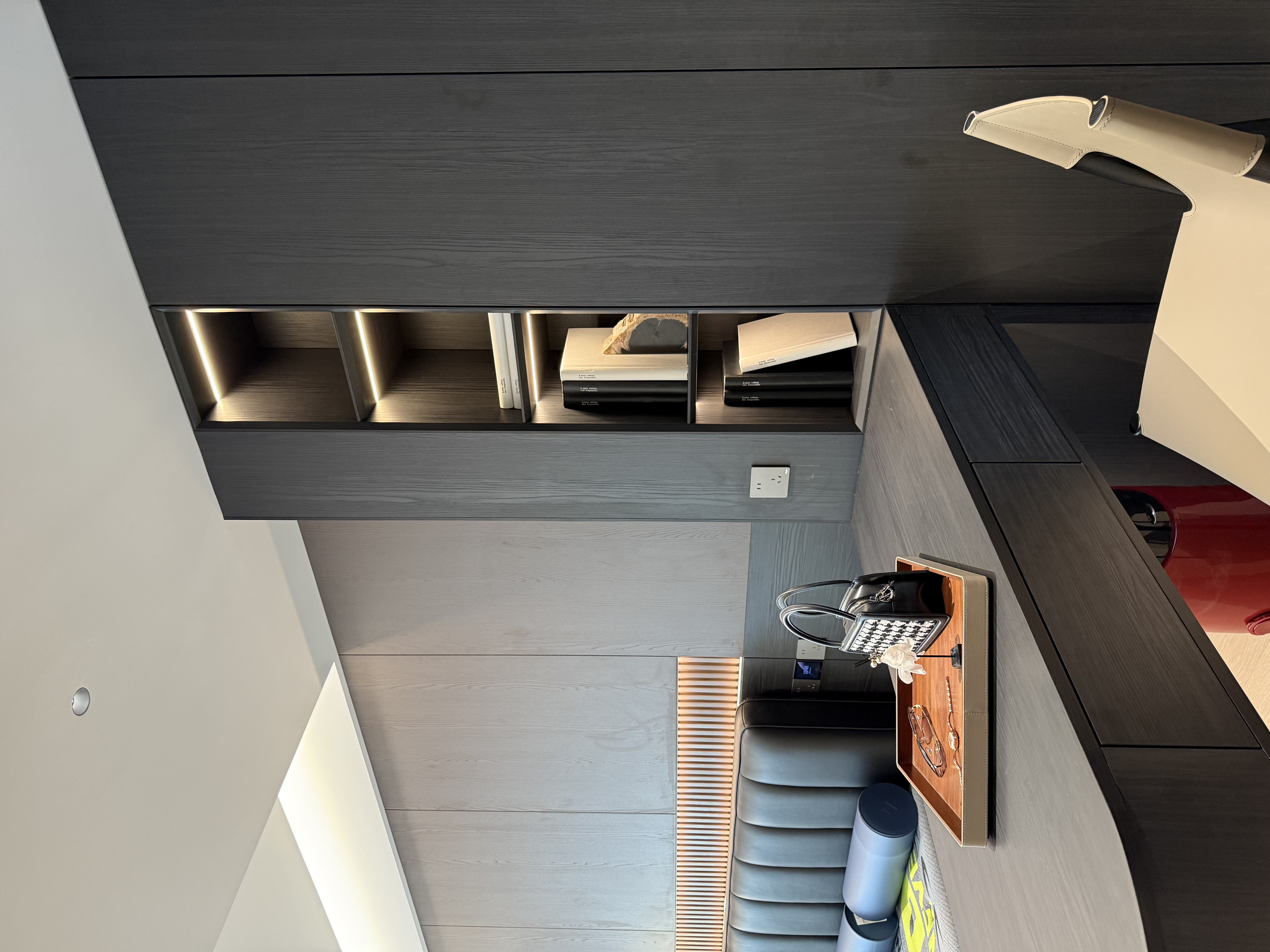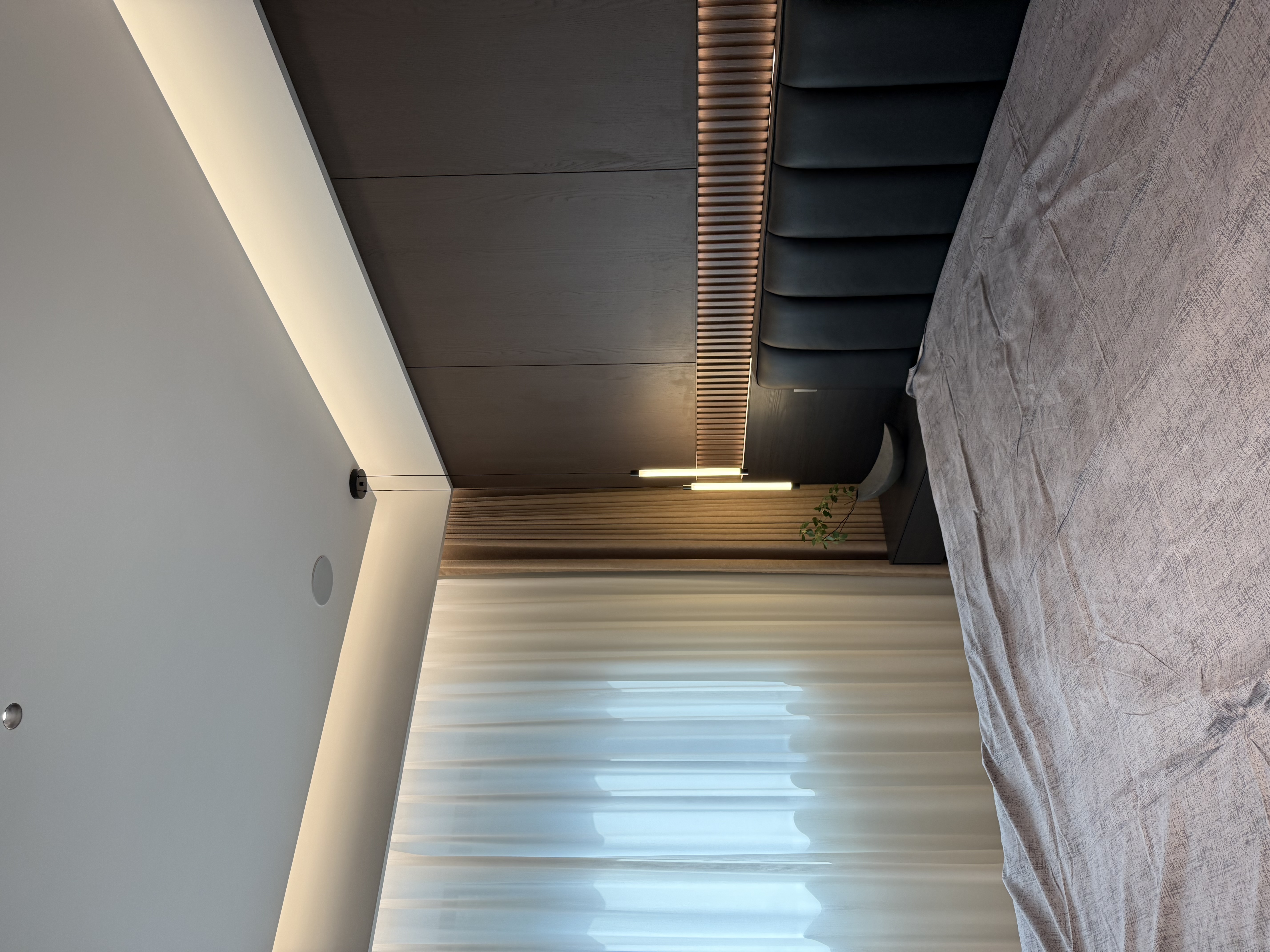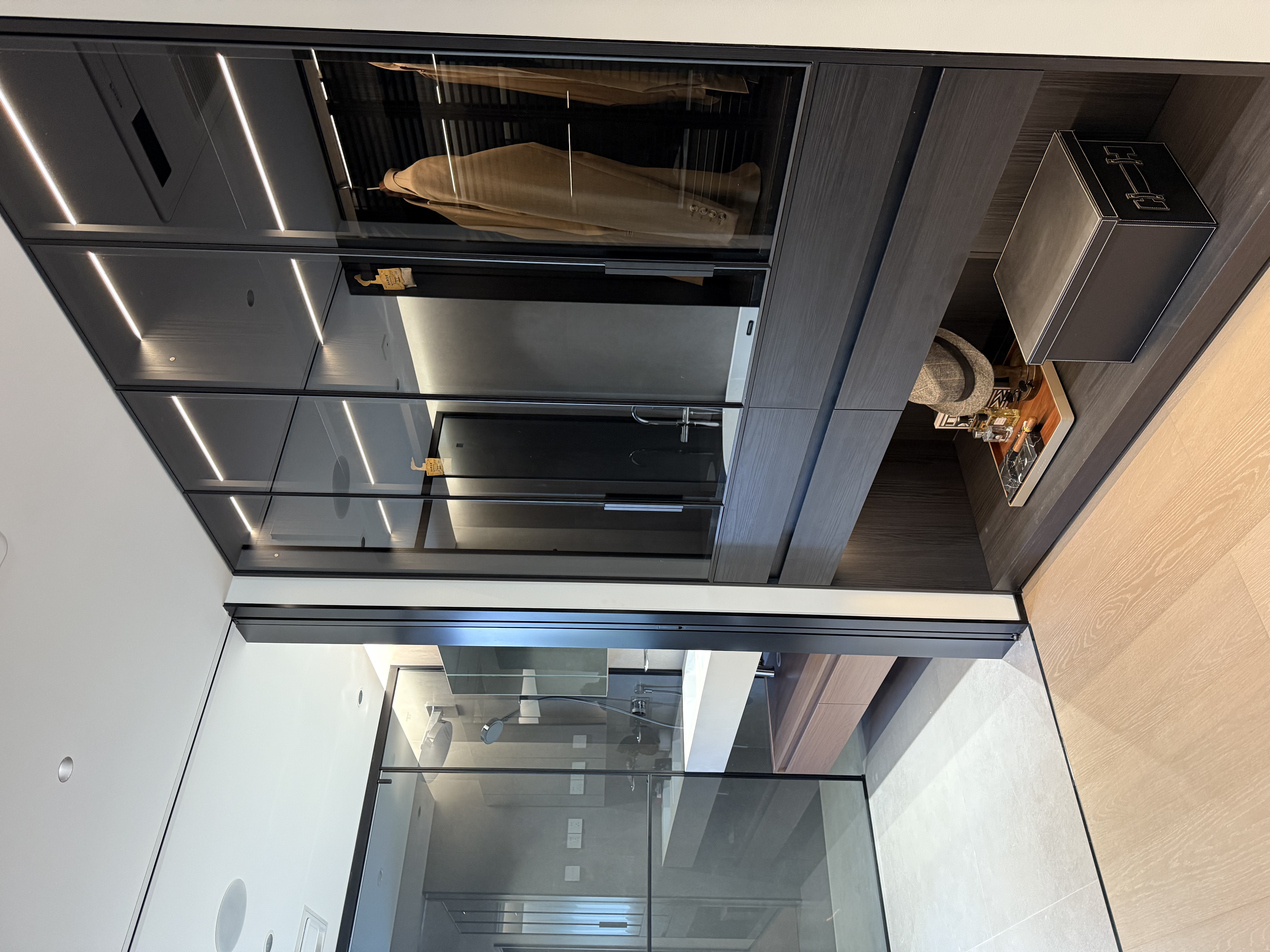 该设计以深色系营造精致感,嵌入式灯带与玻璃材质增强层次,卧室与衣帽间的功能分区让空间既具格调又显通透。 The design uses dark color schemes to create a sense of refinement. Recessed light strips and glass materials enhance the sense of hierarchy, while the functional division between the bedroom and walk-in closet makes the space both stylish and transparent.