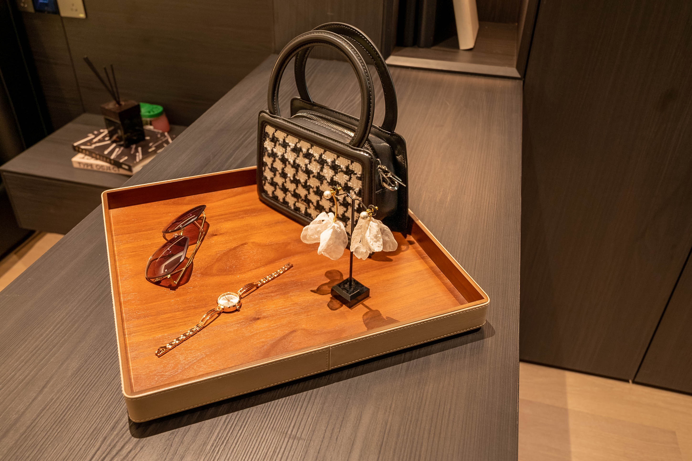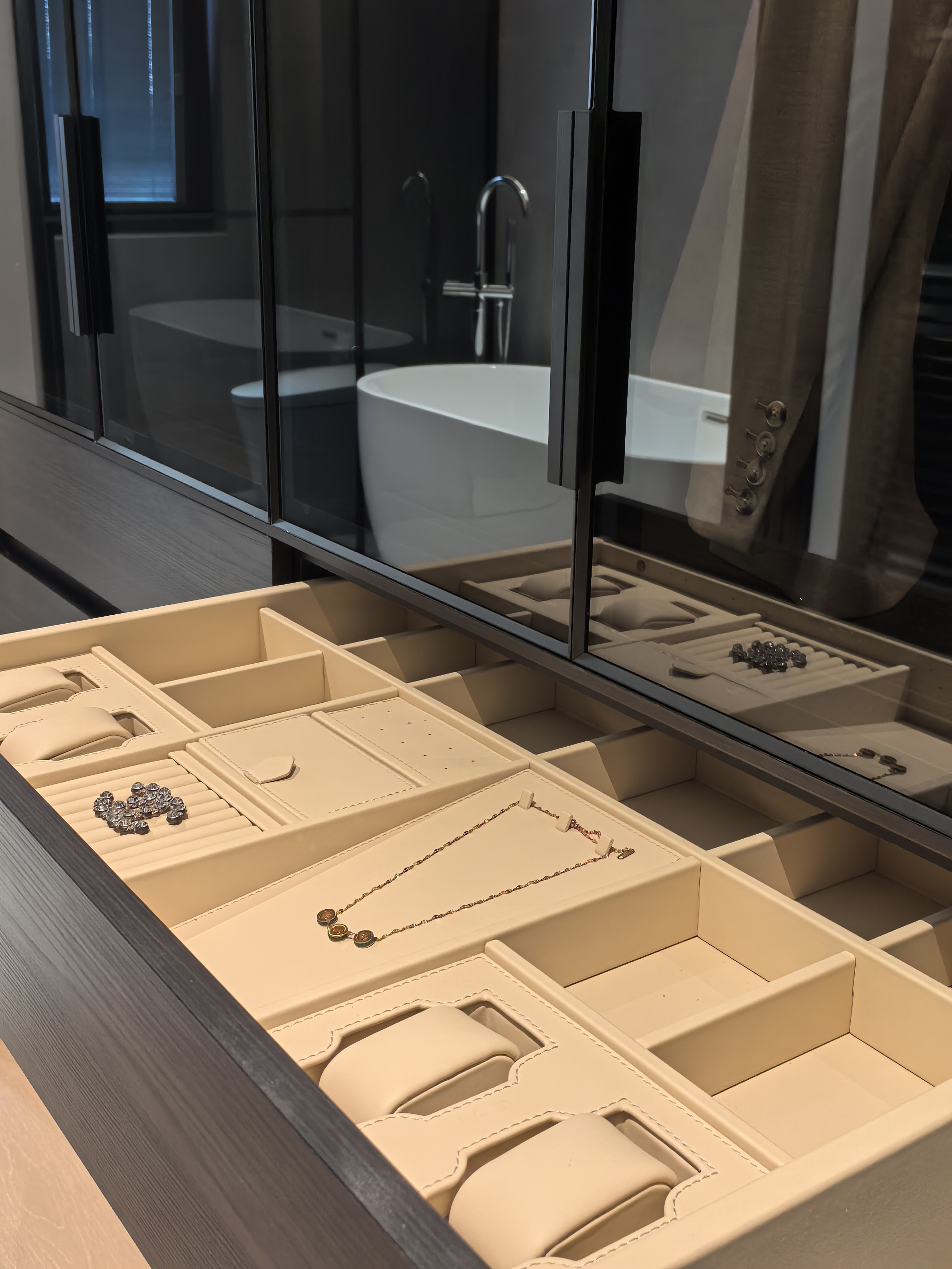 衣帽柜以皮革分区收纳珠宝,玻璃柜门兼具展示性,在精致细节中彰显收纳与美学的双重质感。 The wardrobe uses leather to partition and store jewelry, with glass cabinet doors that serve a display function. It showcases the dual texture of storage and aesthetics through exquisite details.