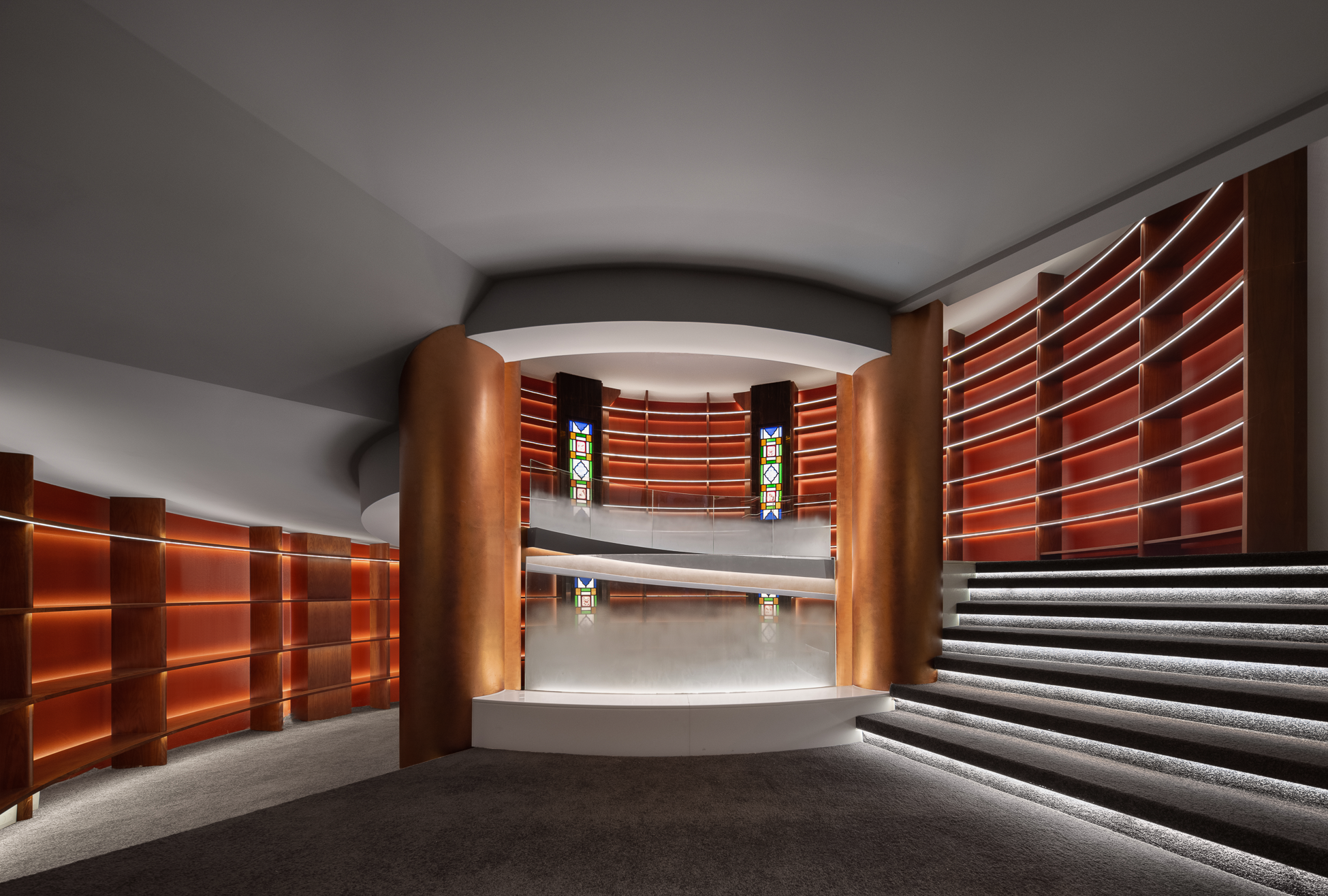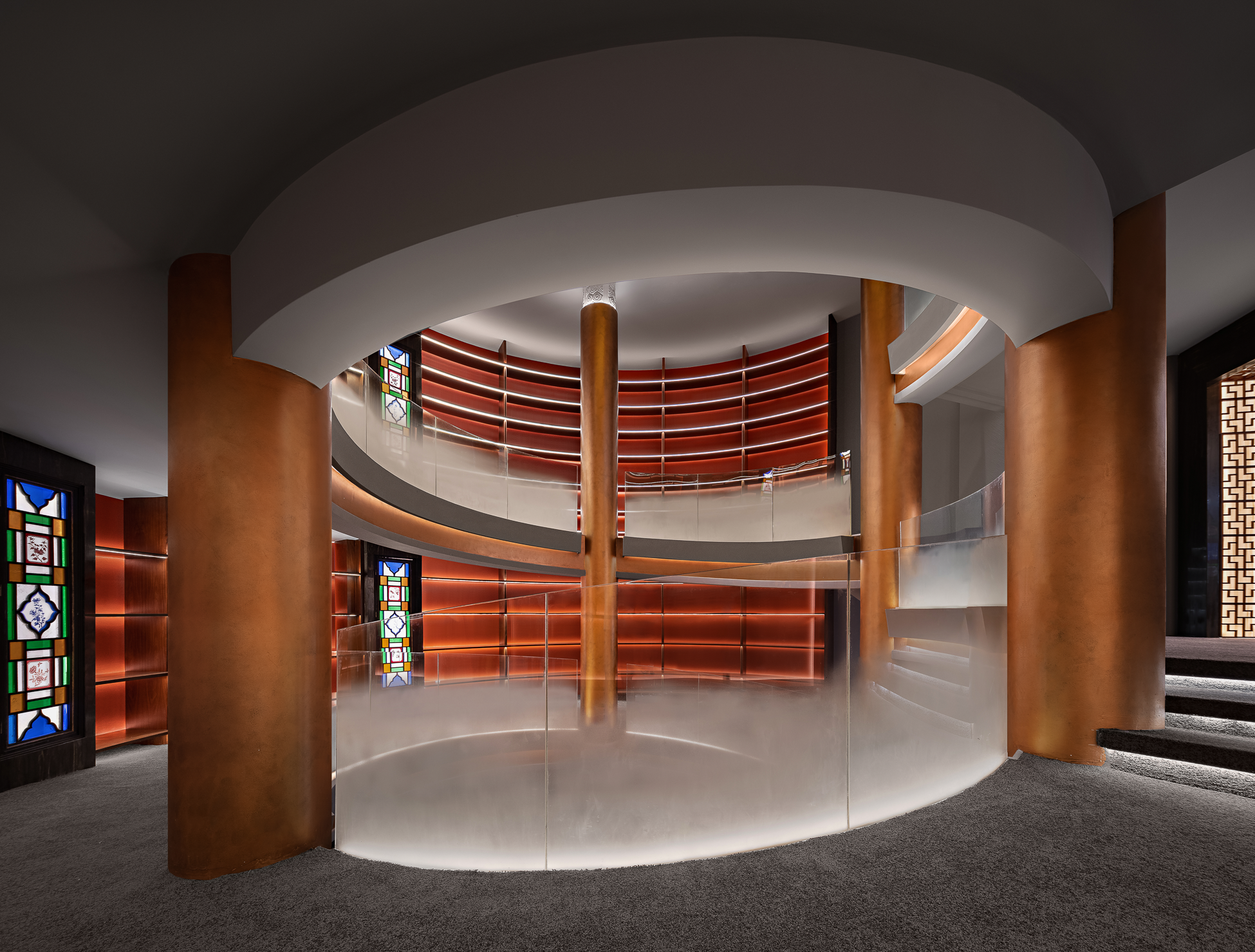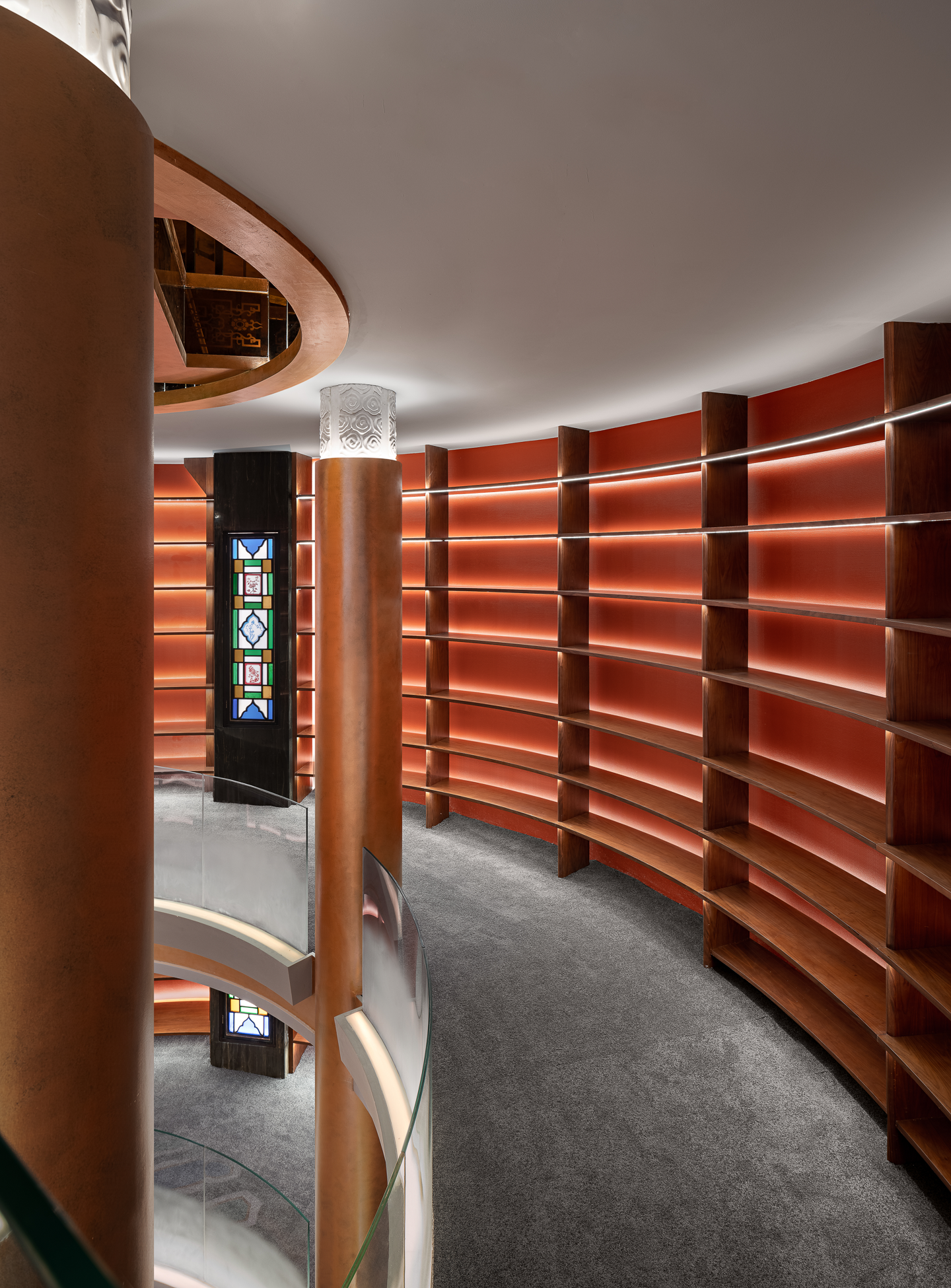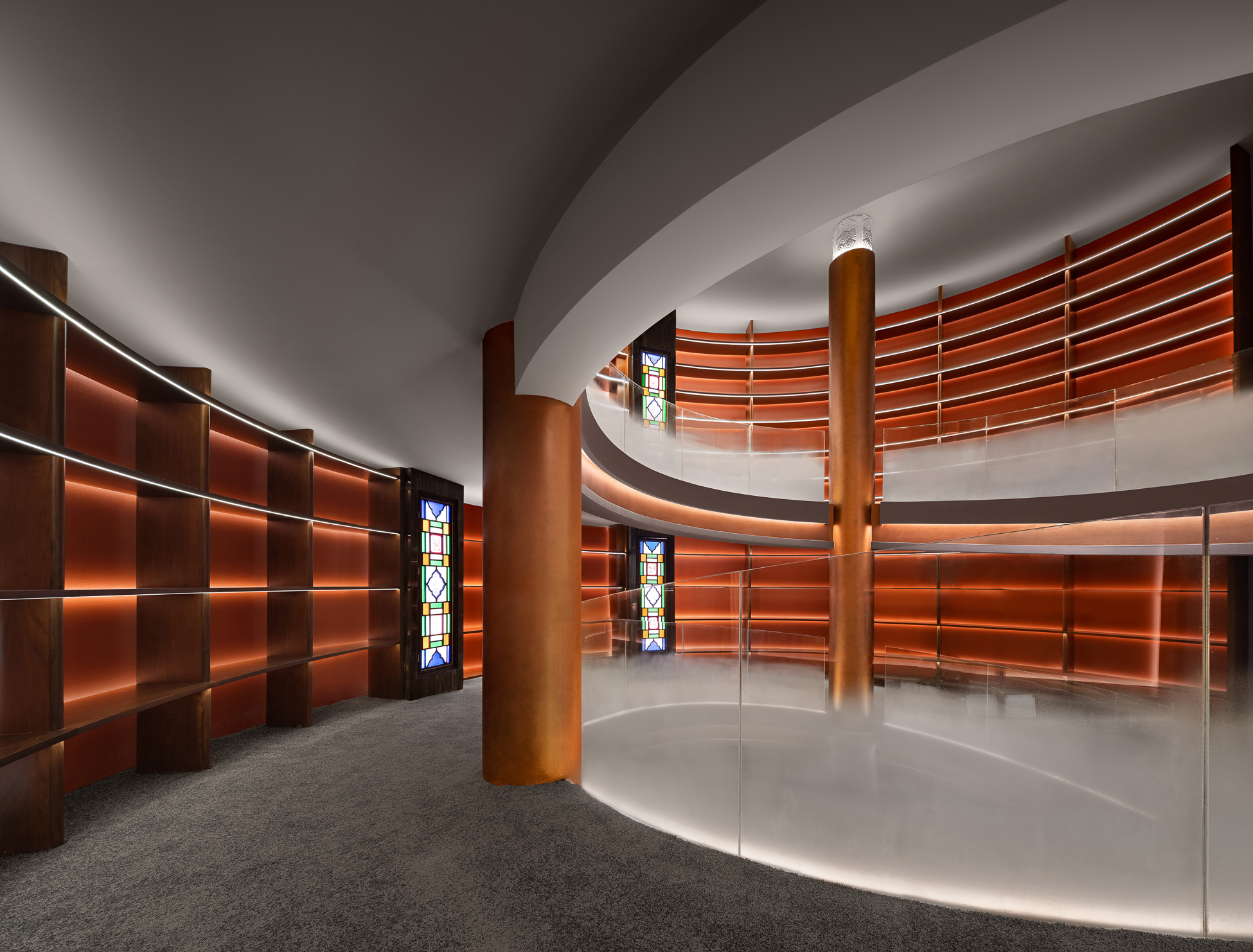 设计从东方意境中汲取灵感,以“螺旋上升”象征知识的延展与传承。空间以圆柱形结构为核心,形成围合而流动的阅读场景。主色调“故宫红”与中灰、浅灰的层次对比,展现出内敛又庄重的气质。民国窗花、渐变玻璃与柔光灯带共同构成了一个具有东方精神与当代审美平衡的艺术空间。 -