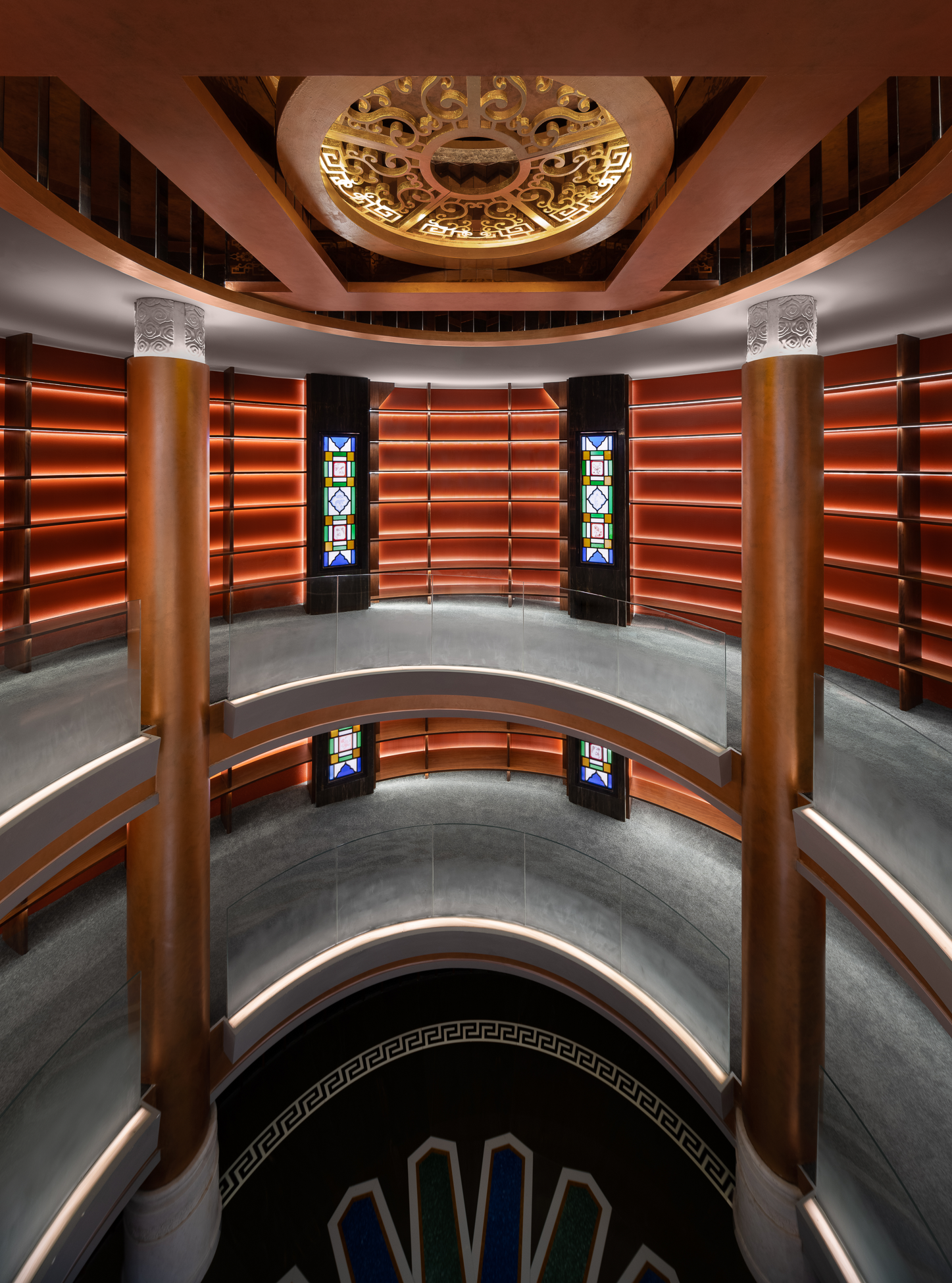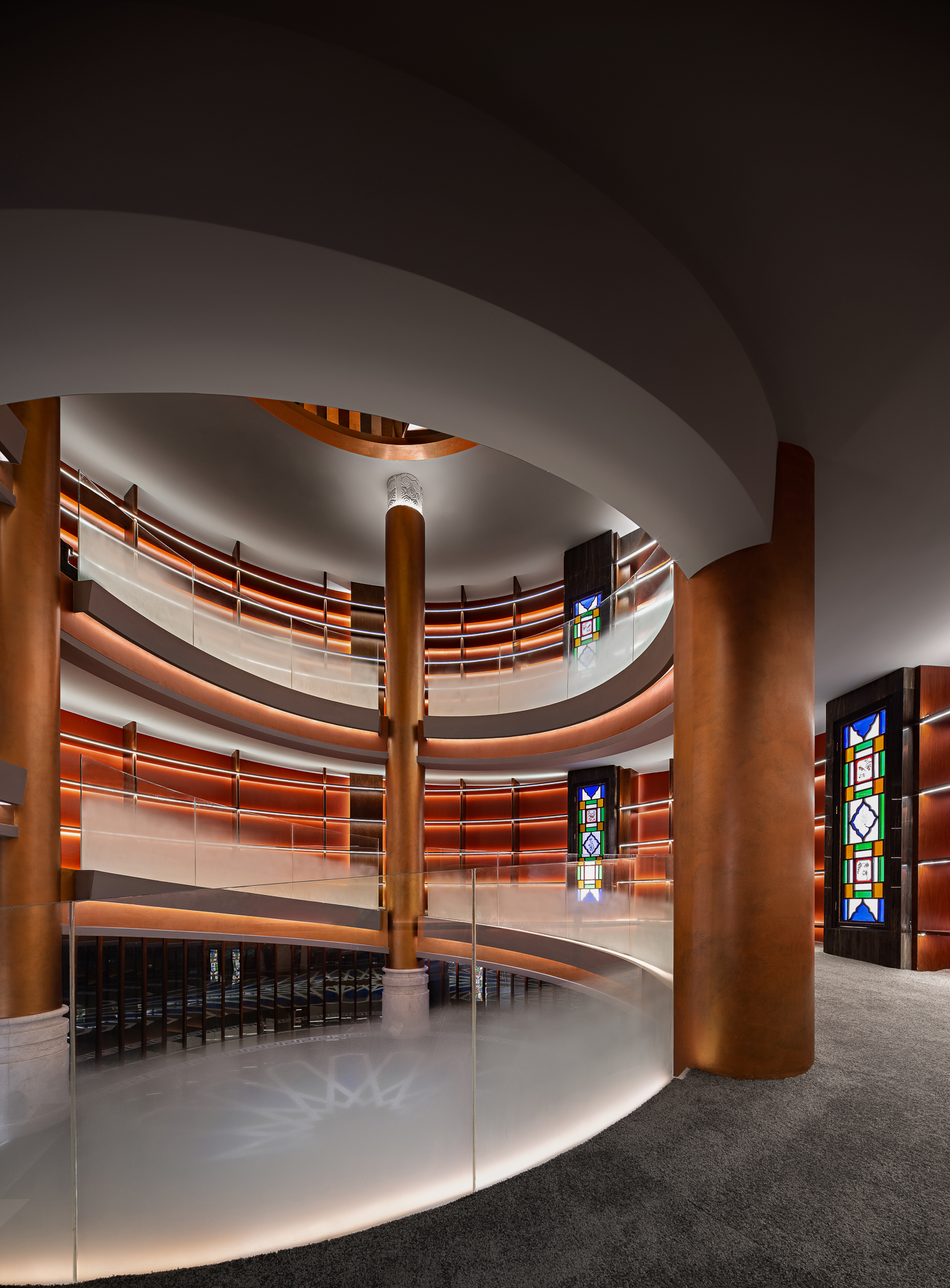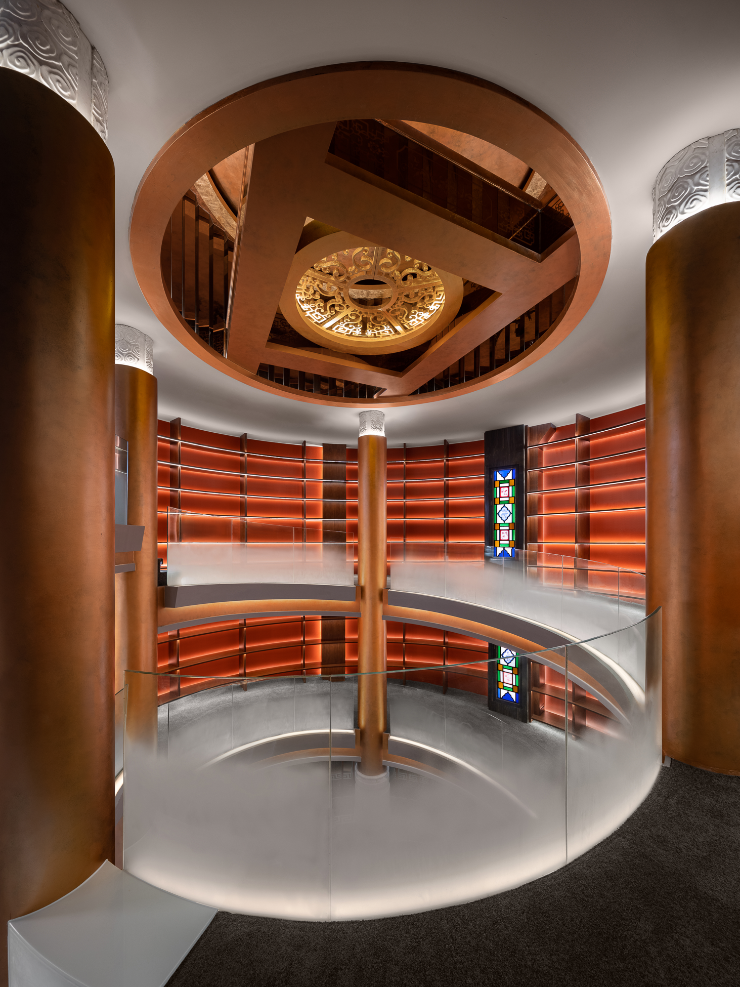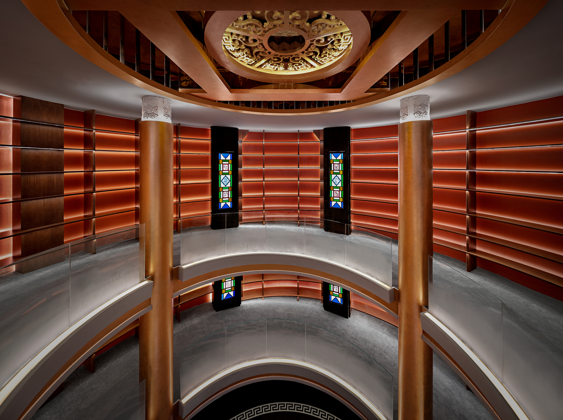 设计从东方意境中汲取灵感,以“螺旋上升”象征知识的延展与传承。空间以圆柱形结构为核心,形成围合而流动的阅读场景。主色调“故宫红”与中灰、浅灰的层次对比,展现出内敛又庄重的气质。民国窗花、渐变玻璃与柔光灯带共同构成了一个具有东方精神与当代审美平衡的艺术空间。 -