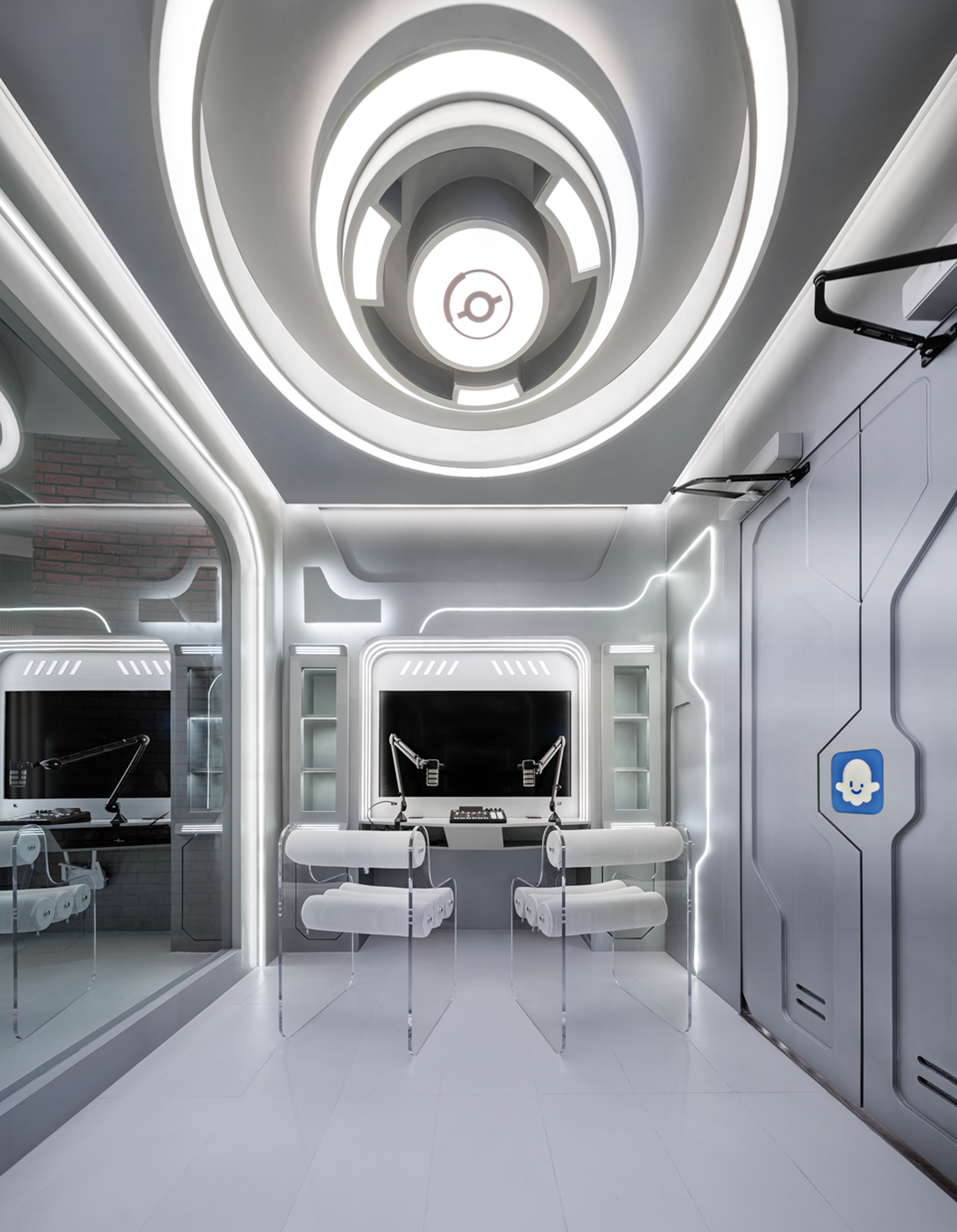 动线由“现实的客厅”延伸至“未来的声场”,通过光影、镜面与空间比例的递进变化,完成一次视觉与心理的穿越。