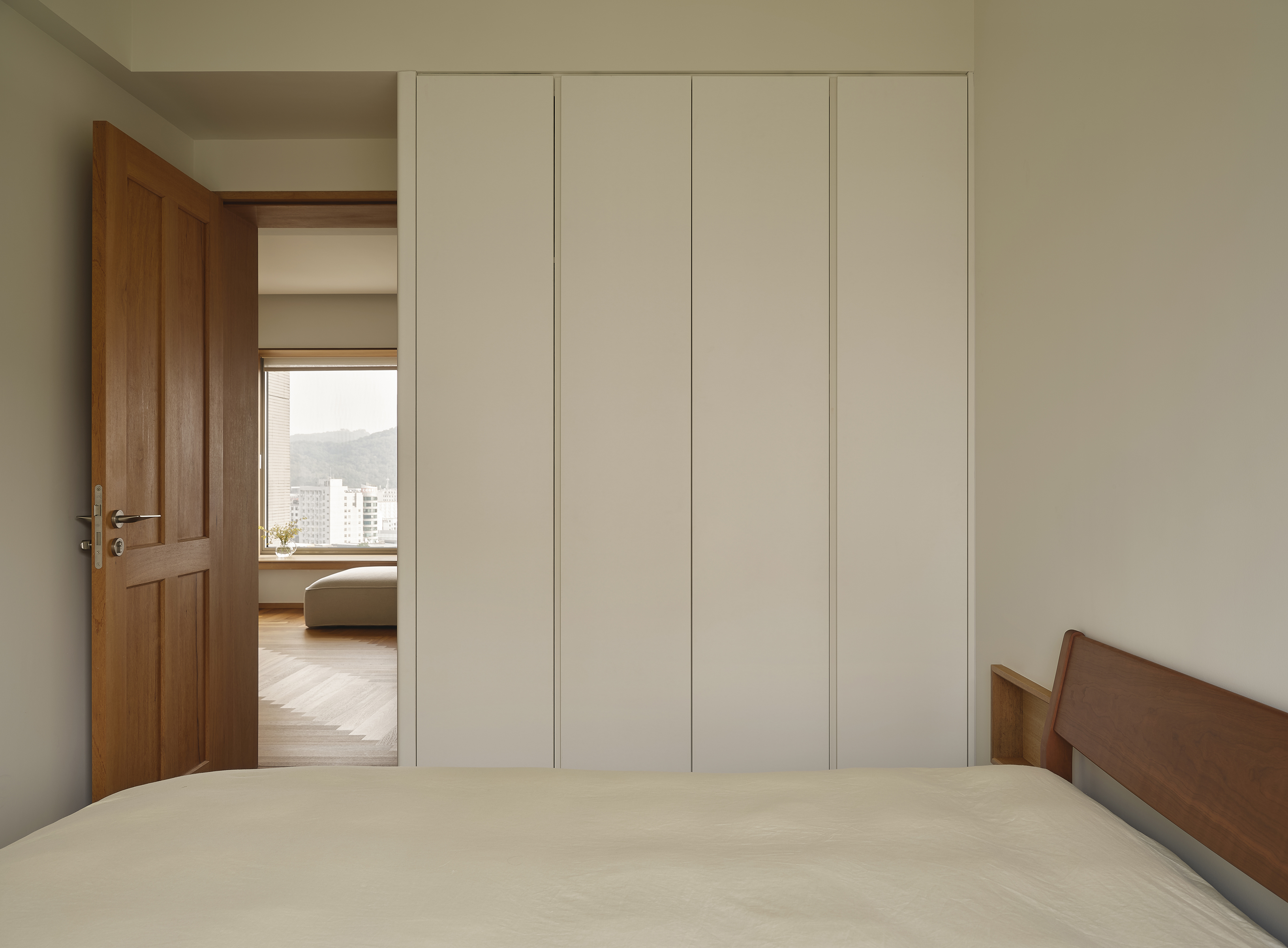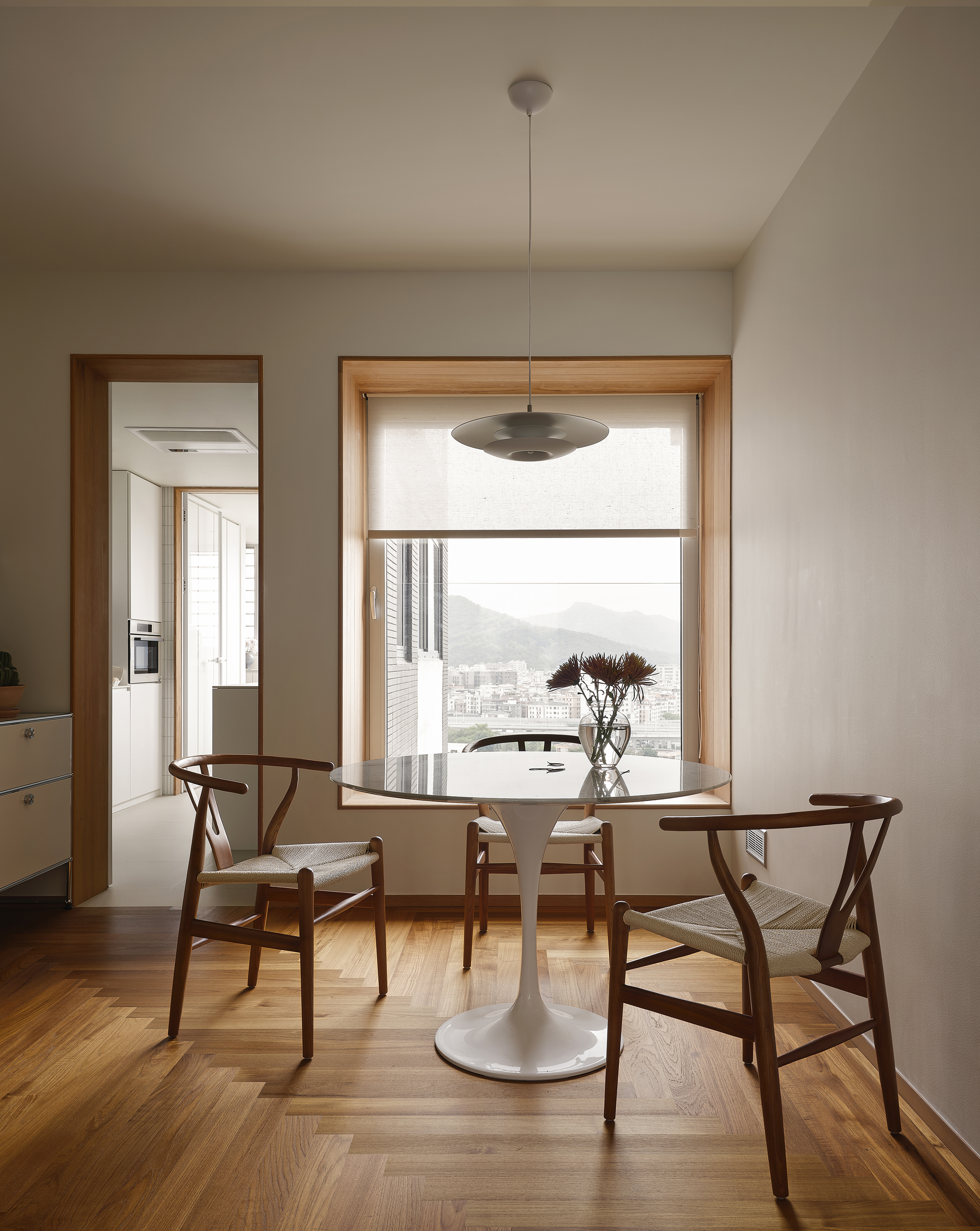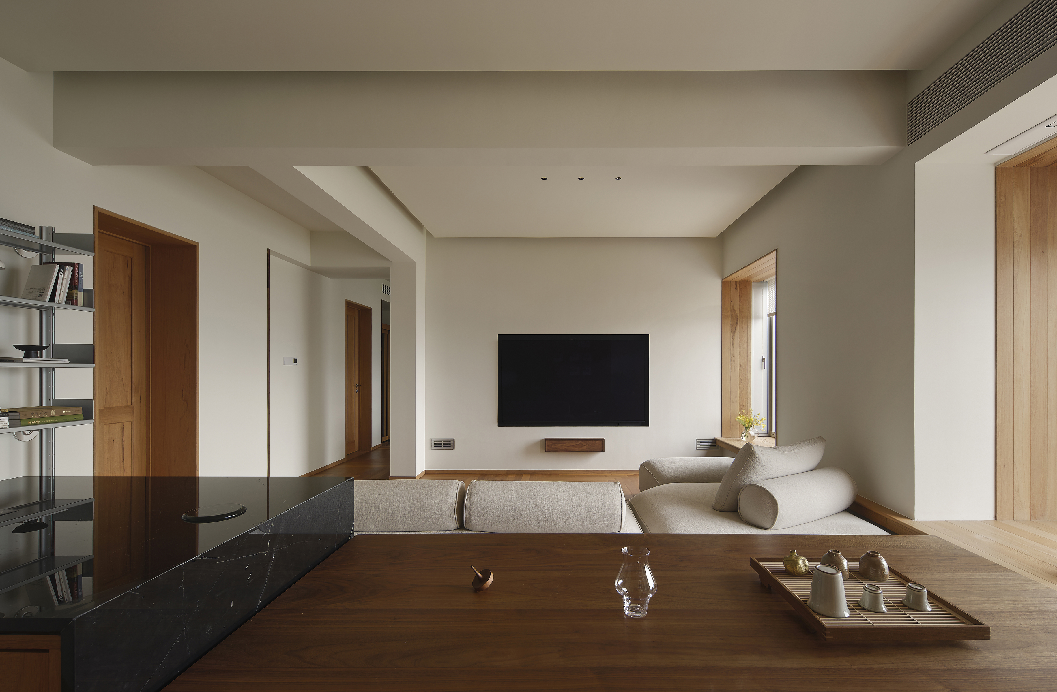 基于对空间尺度、通风采光、及室内外景观的综合考量,设计师大胆地改动原格局,将原「客厅」和「卧室」位置调换,获得采光优越的南向大横厅,将白云山景与城市景观“框”入起居空间,真正发挥出“山景房”的优势。
