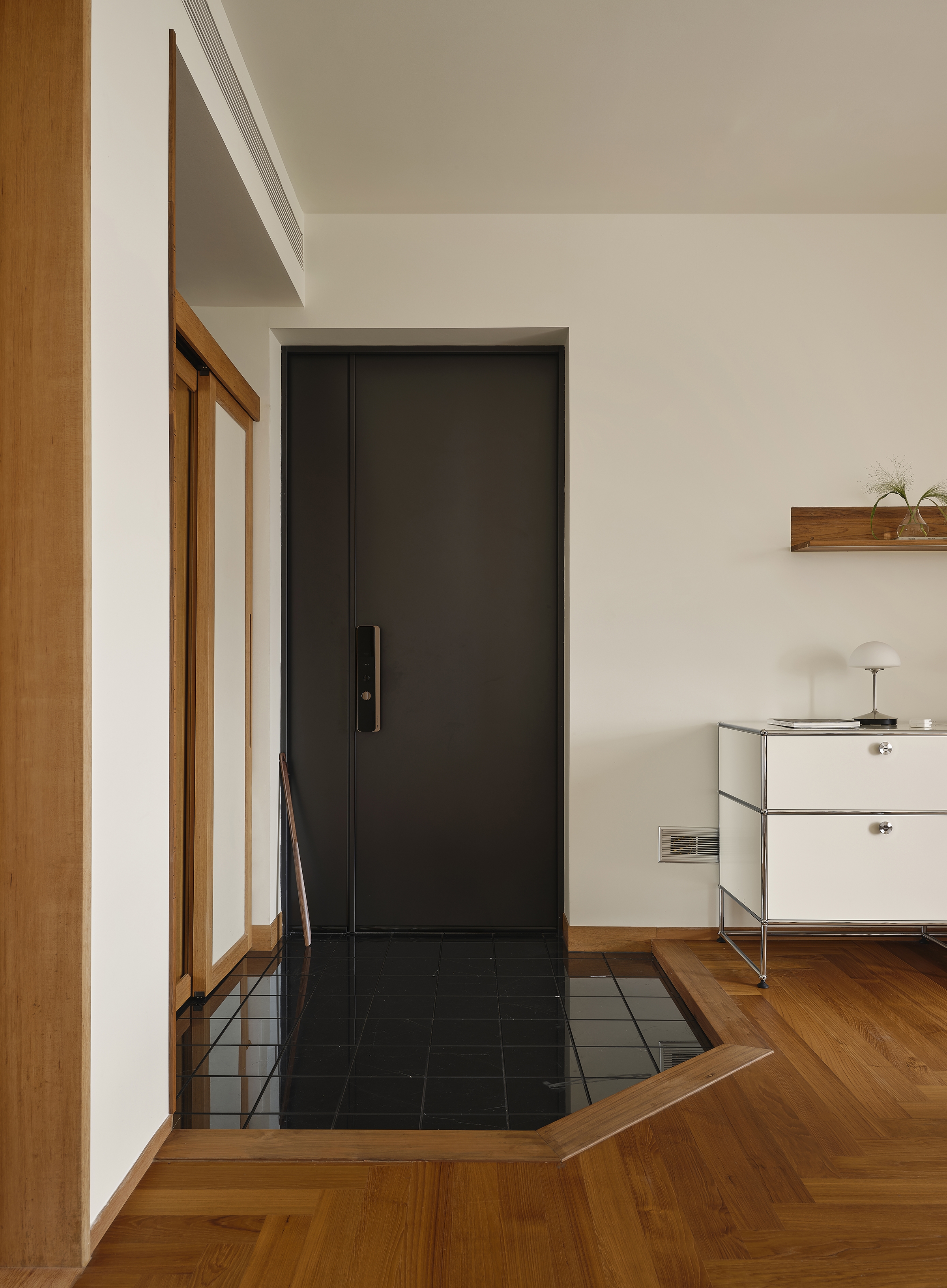 设计师改变原本的无玄关现状,打龙骨做出玄关落尘区,从入户门厅到核心起居空间,形成逐步展开的空间叙事,打破原户型一览无余的视觉模式,也给居住者更强的空间安全感。 -