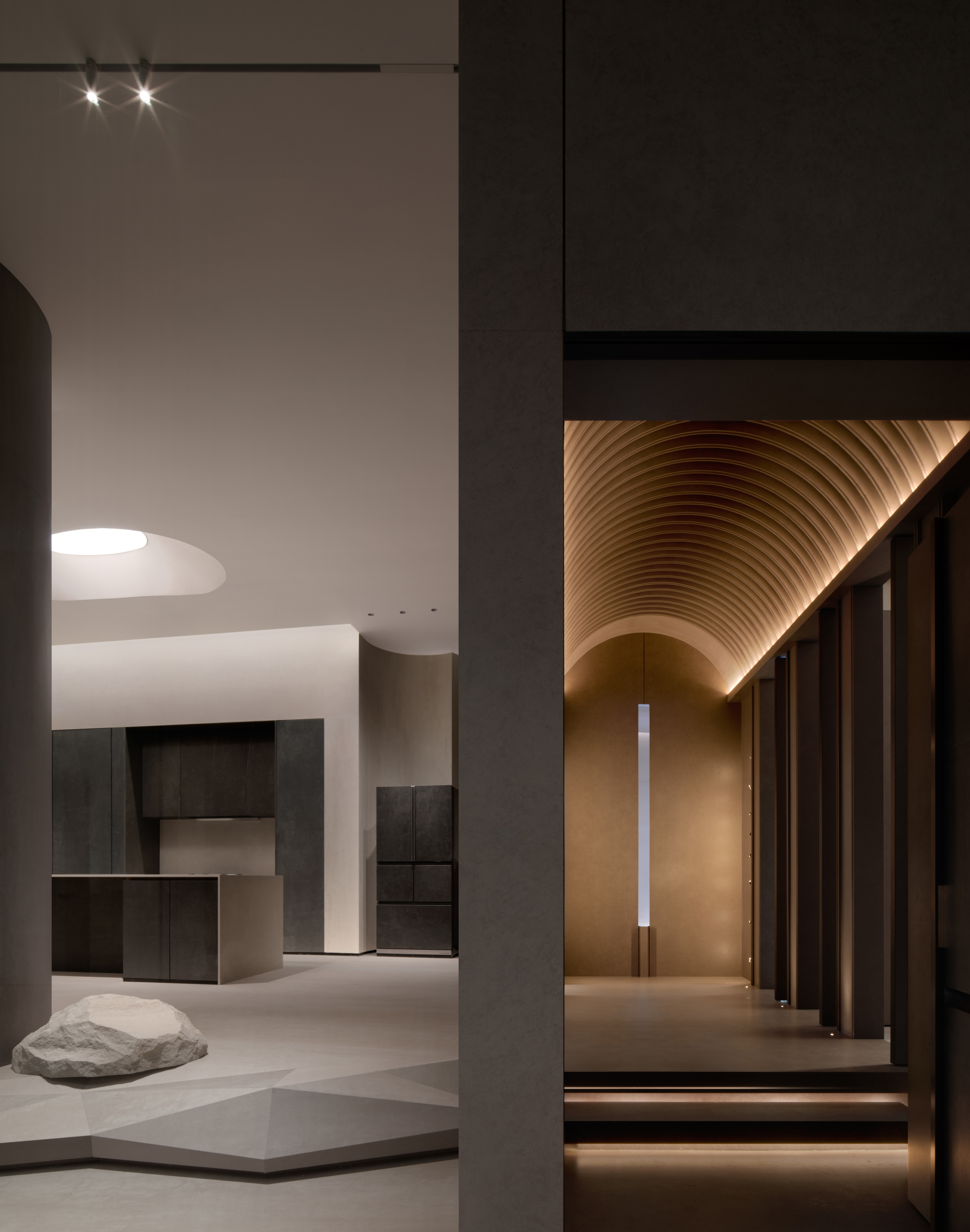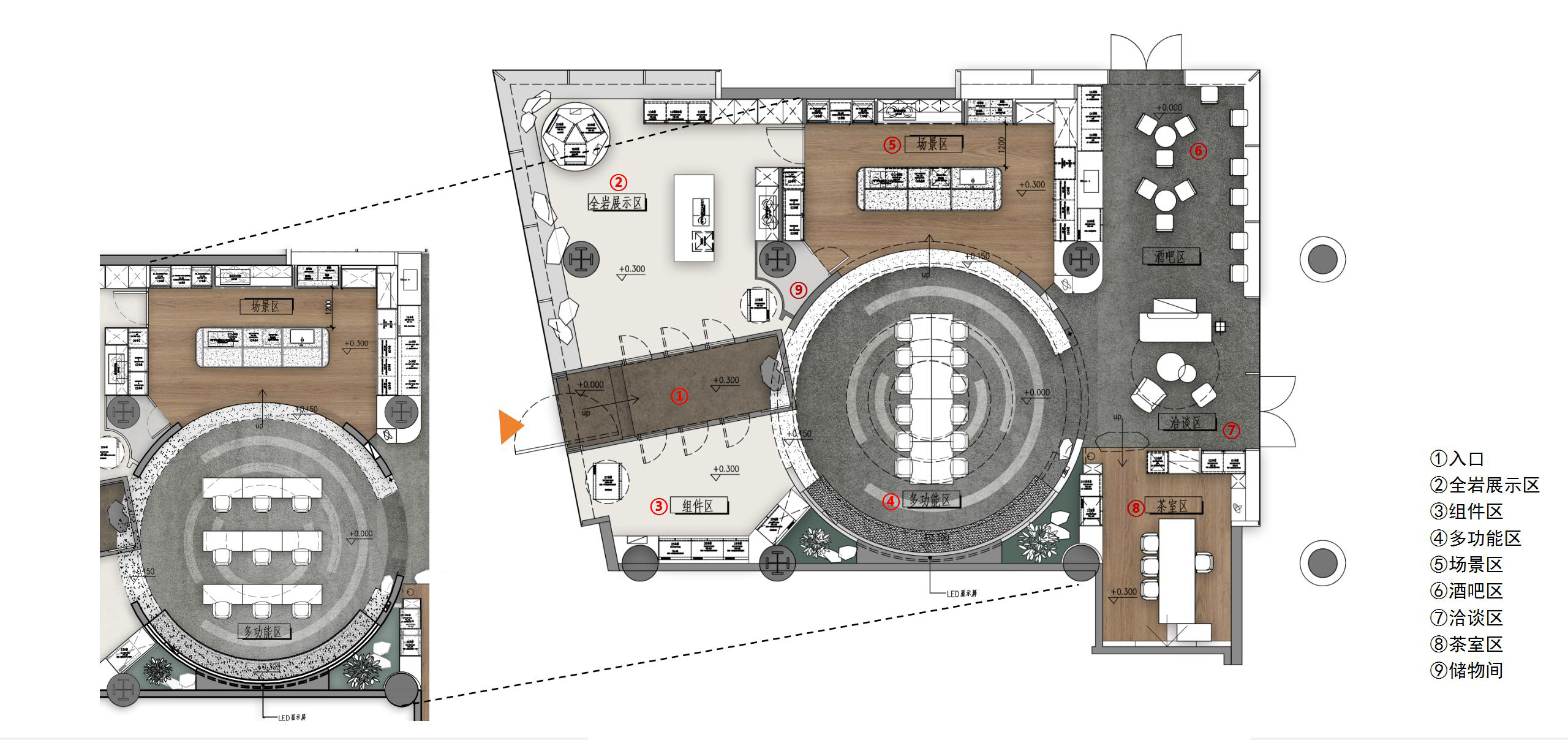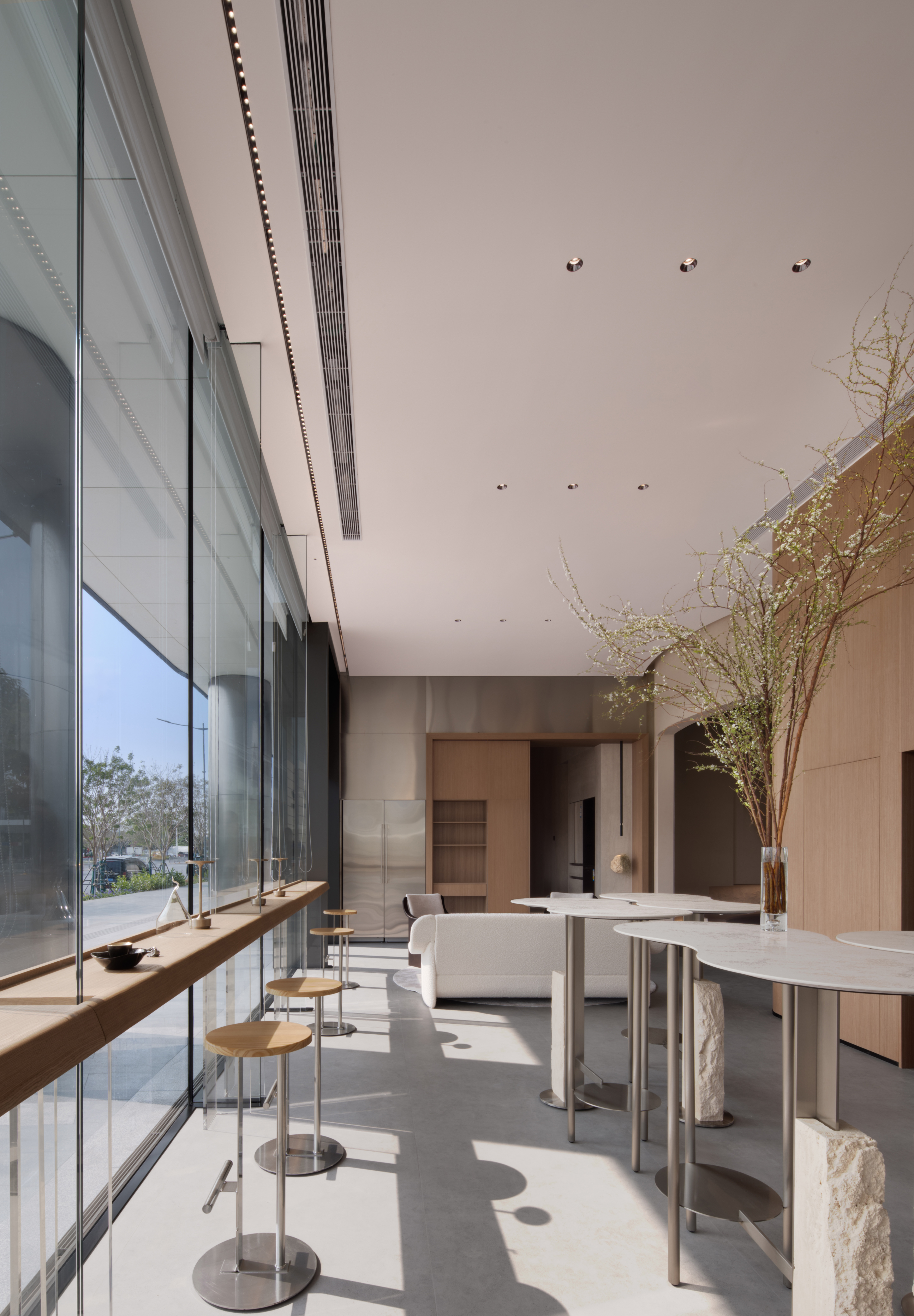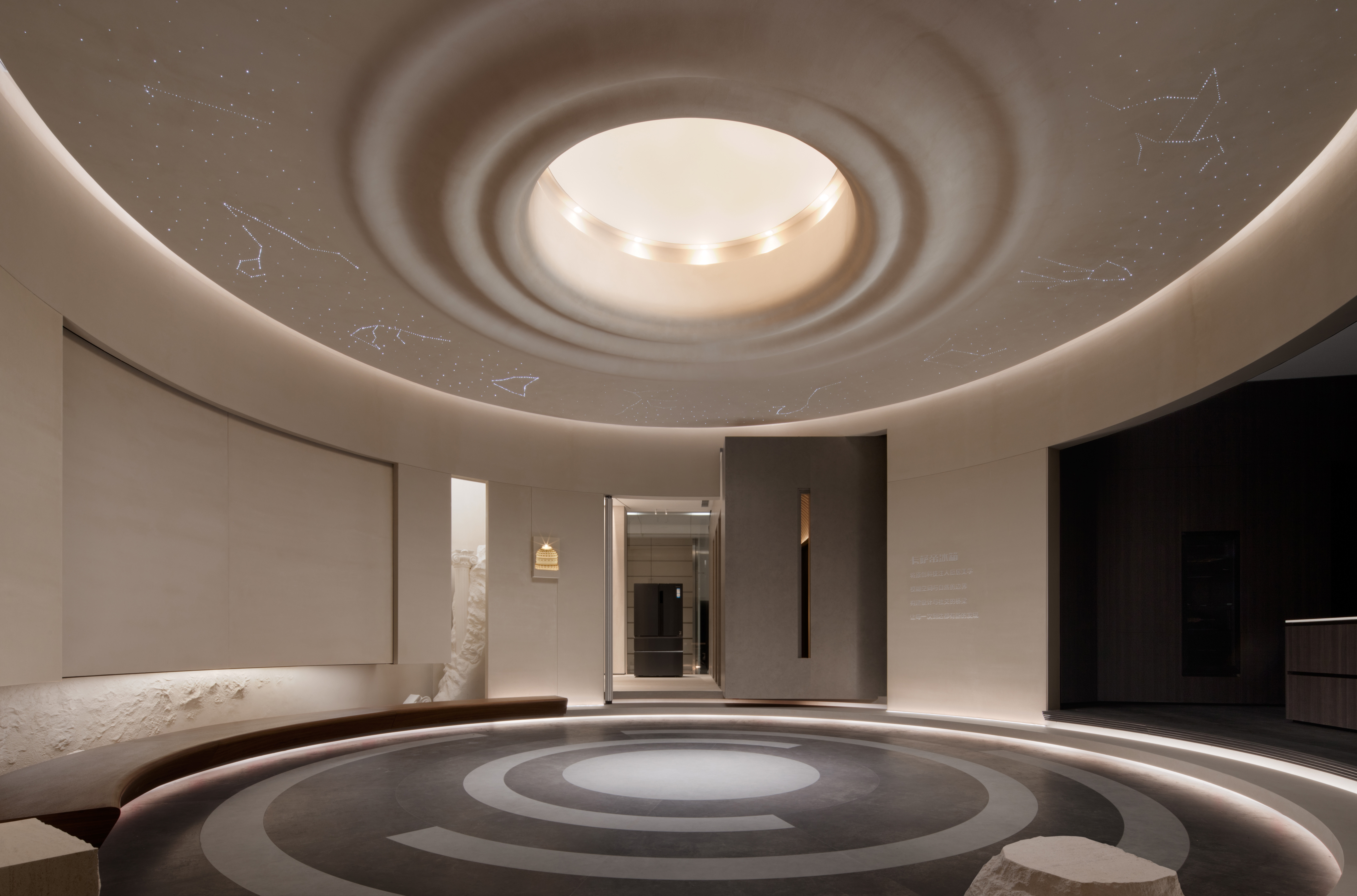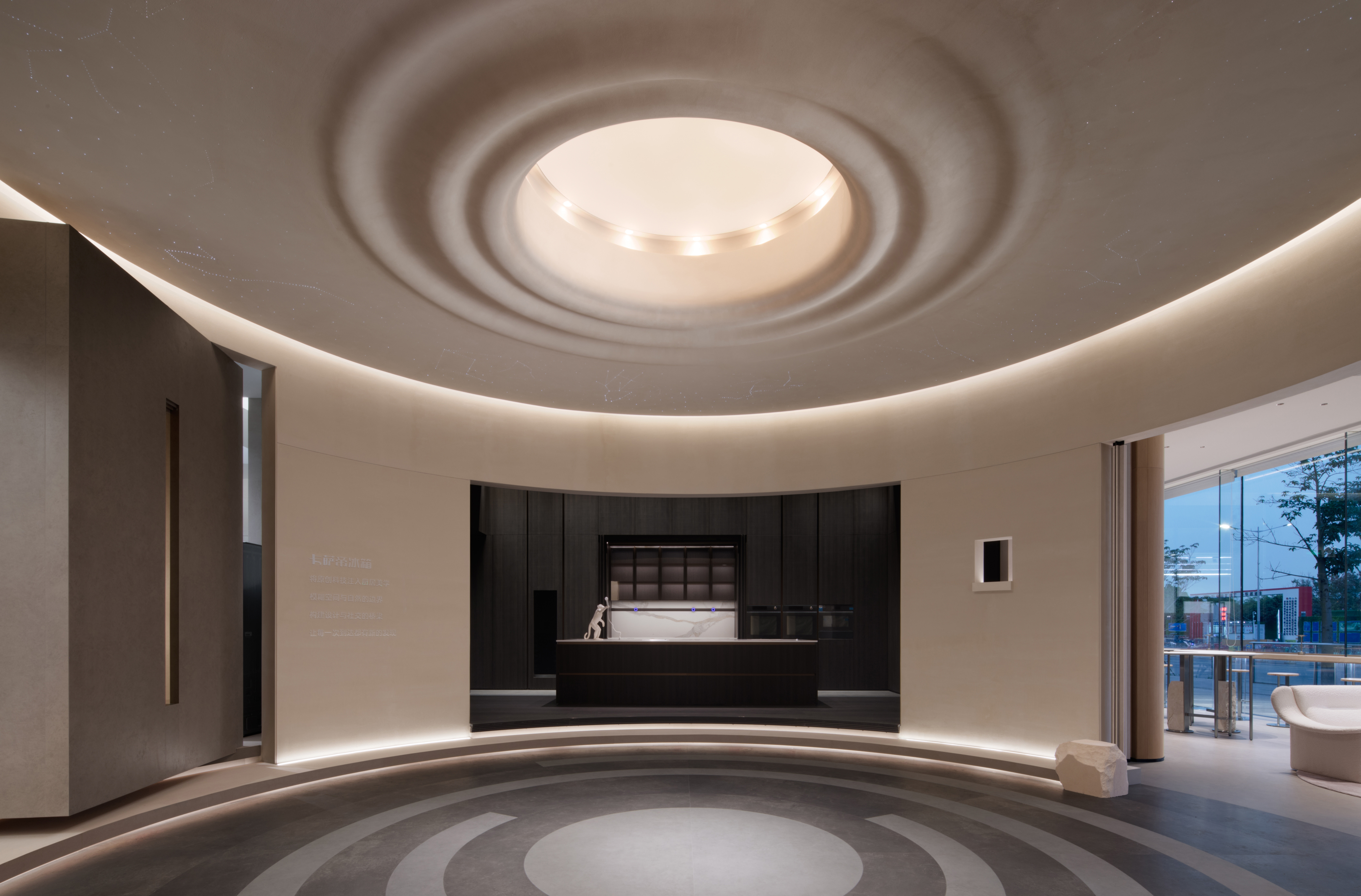 空间意境:从入口门廊到展厅,到圆形“广场”,到休闲区,以尺度、色彩、照明的精准控制,构建出层次分明的情绪与动线,并自然嵌入不同的生活体验场景。