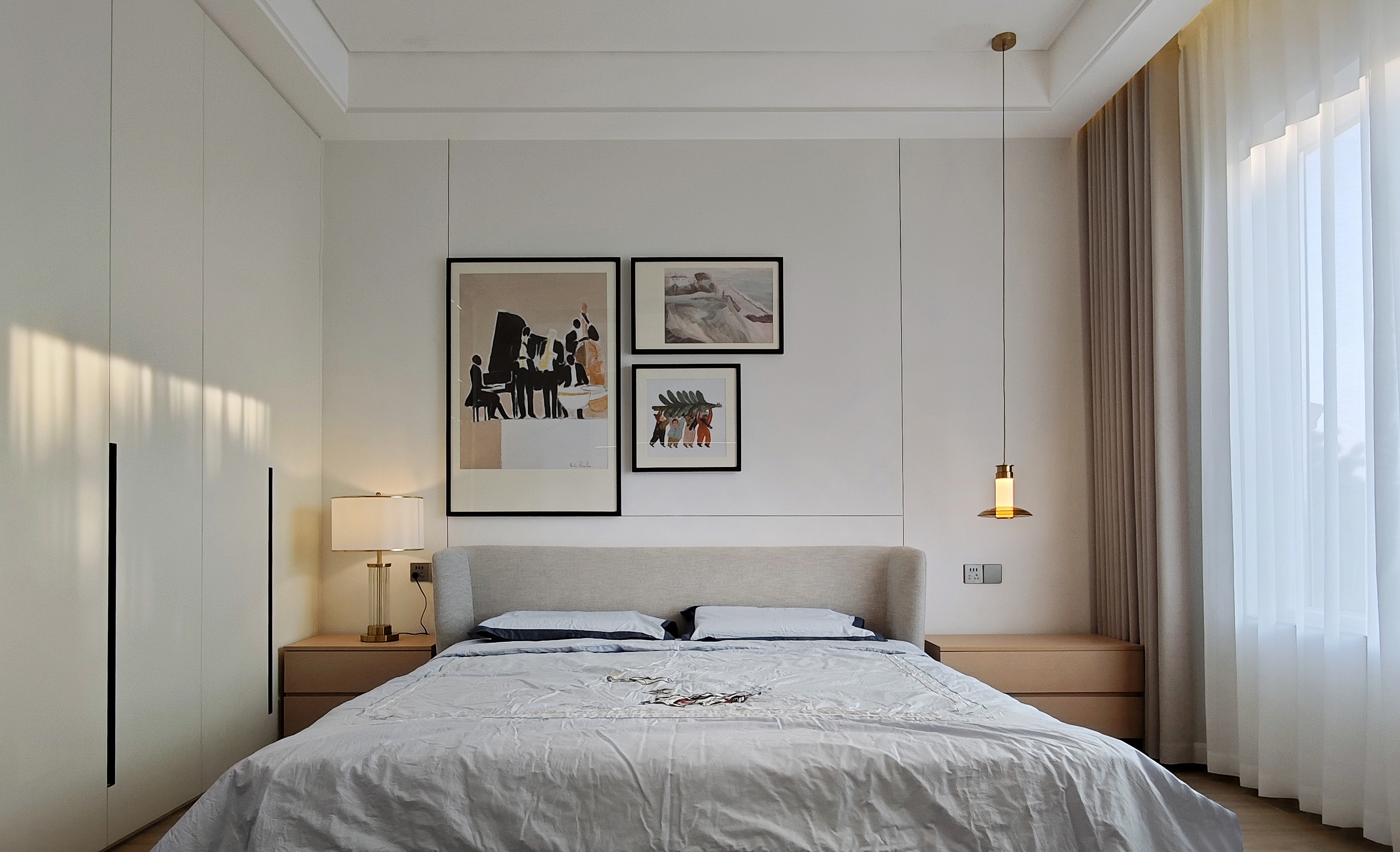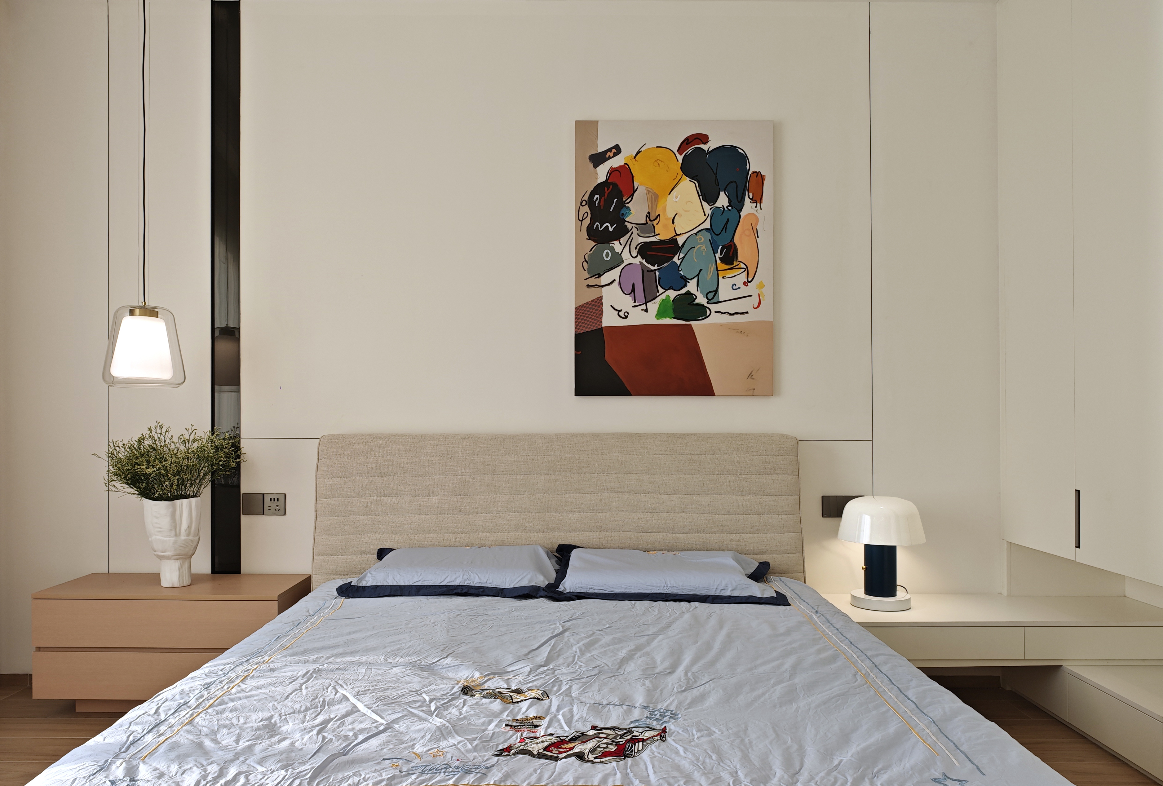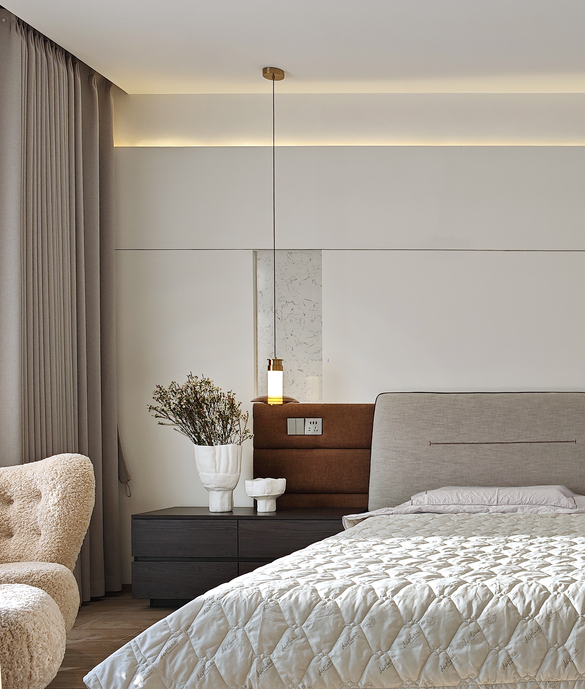 主卧室干净简练的明朗线条营造着沉着克制的空间基调,搭以艺术的软装配饰,柔与刚,含蓄与迸溢,兼收并蓄。