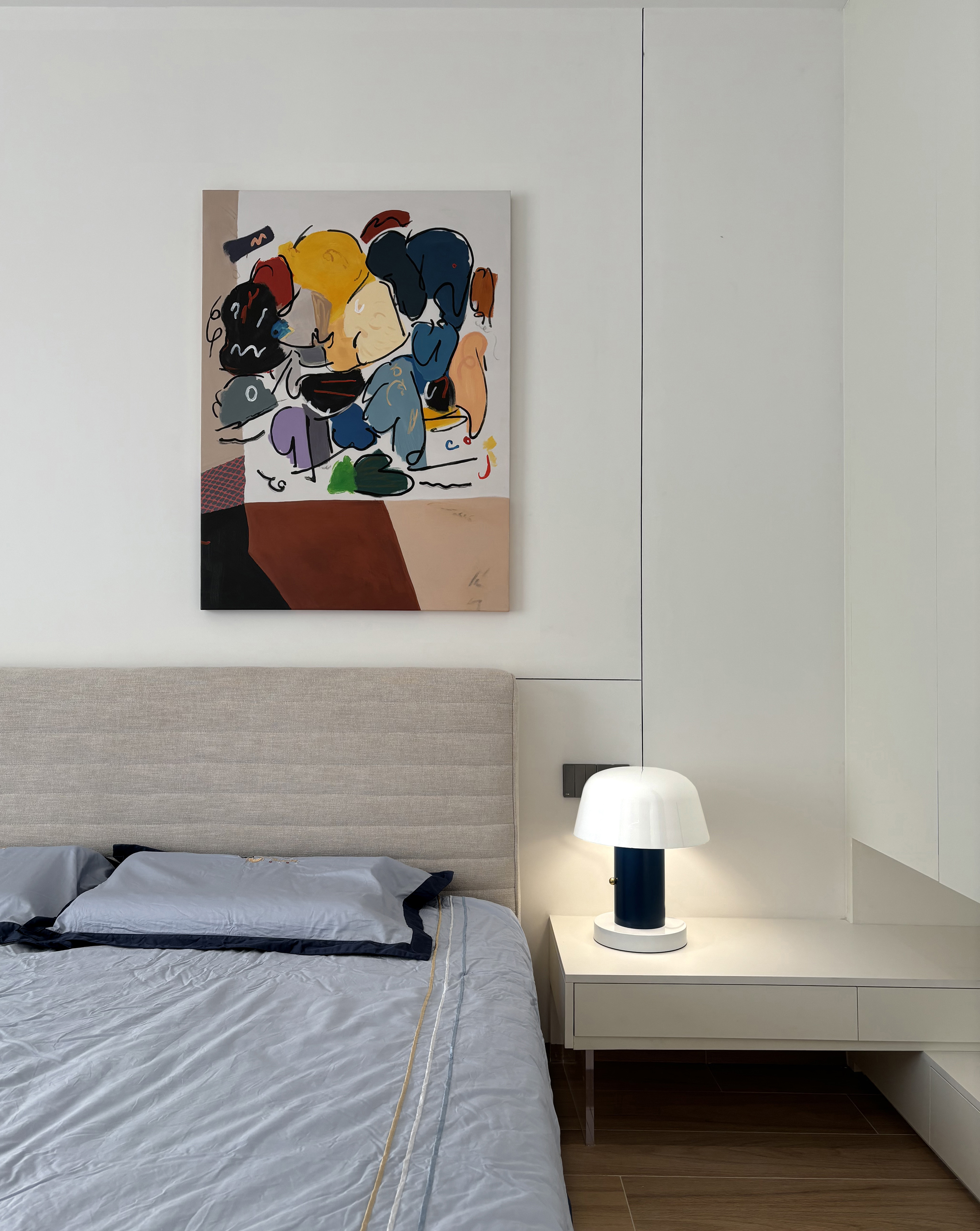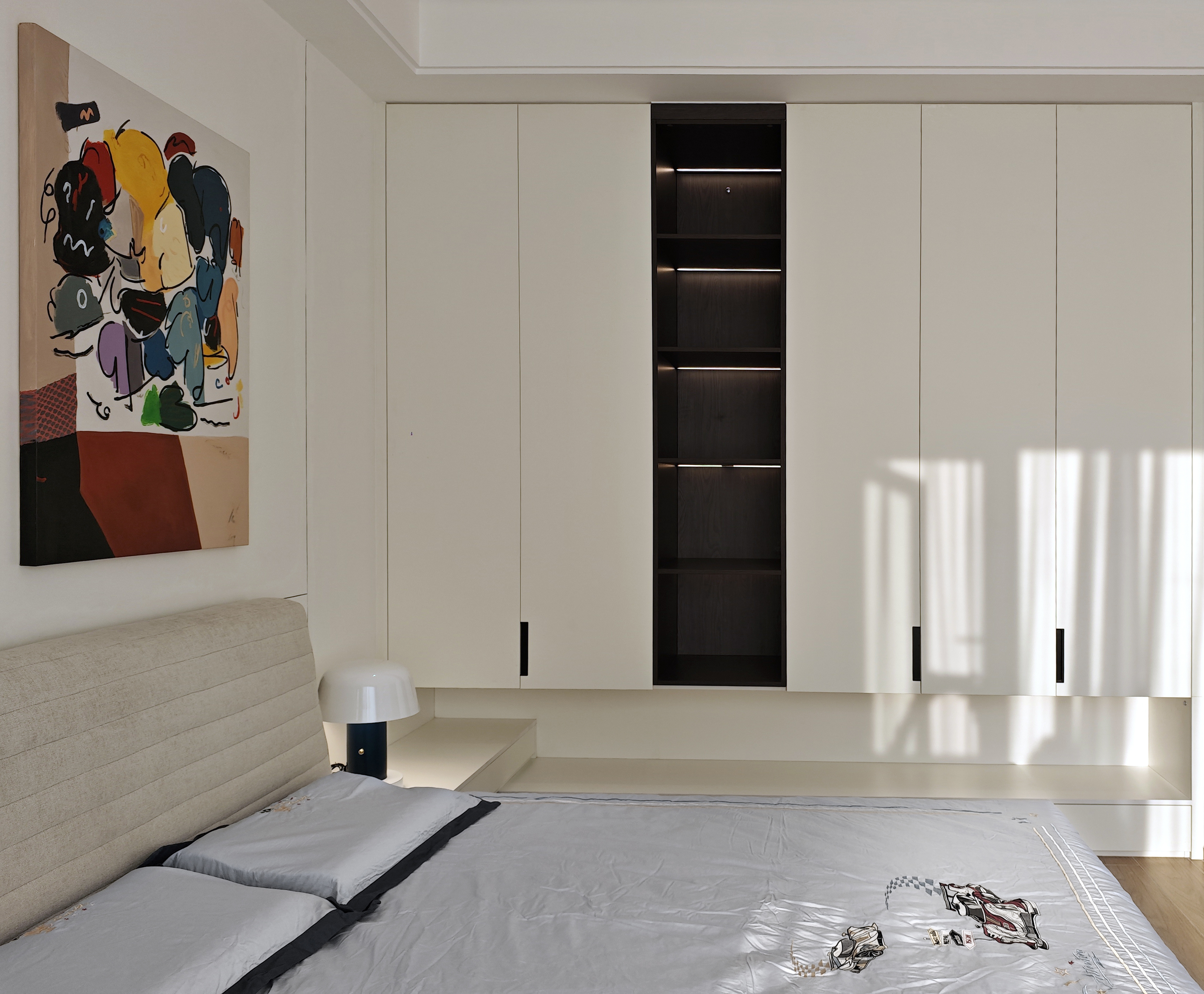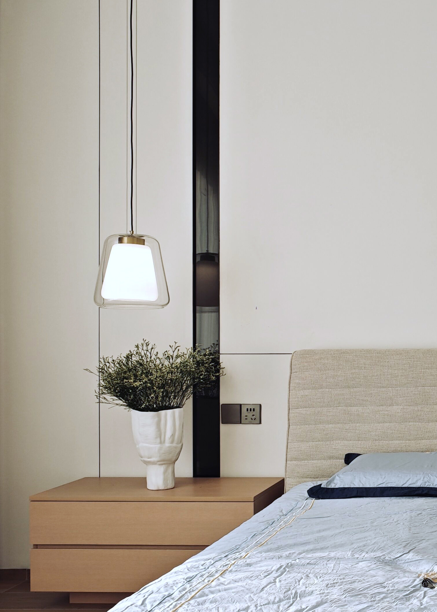 主卧室干净简练的明朗线条营造着沉着克制的空间基调,搭以艺术的软装配饰,柔与刚,含蓄与迸溢,兼收并蓄。