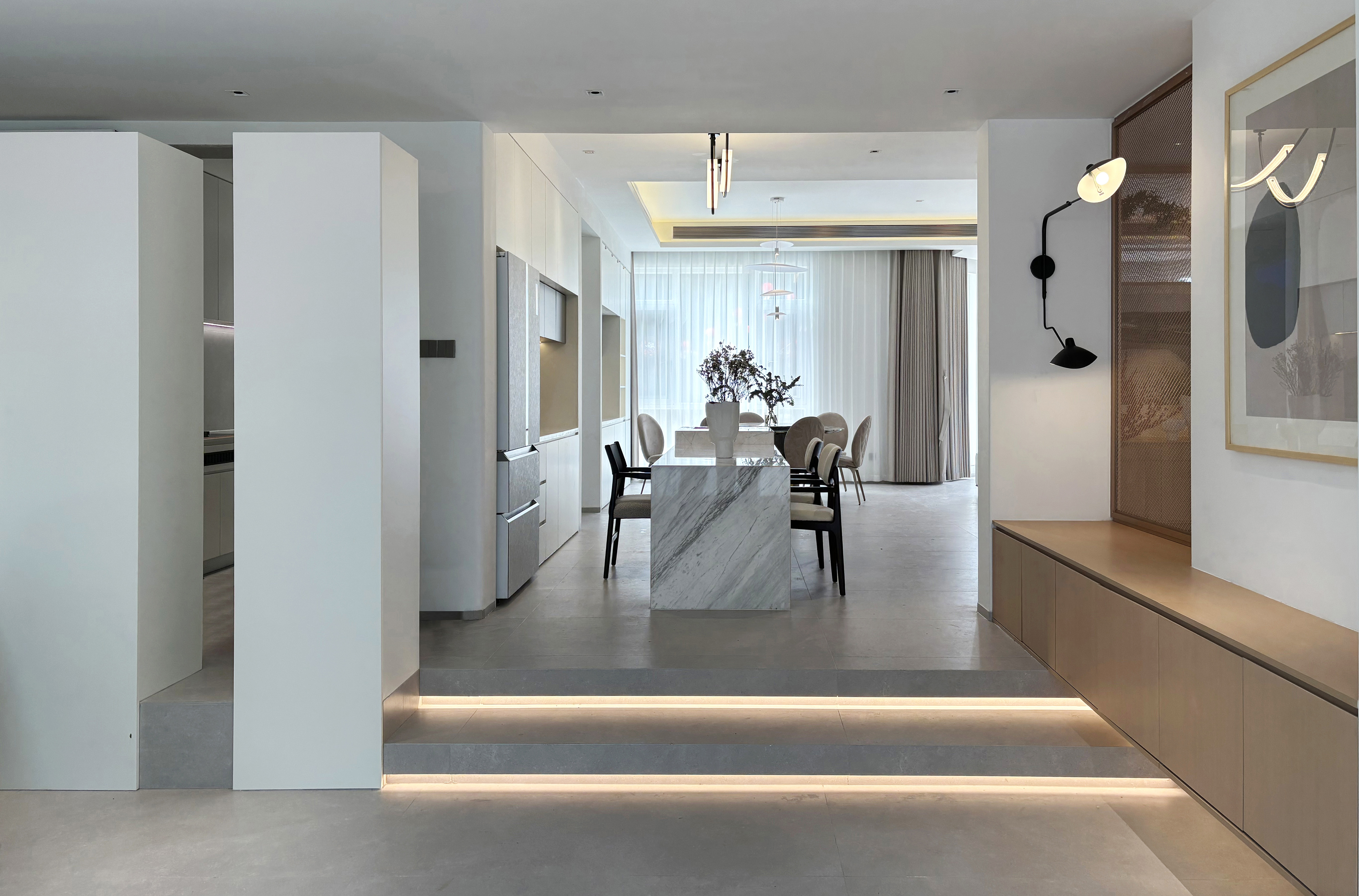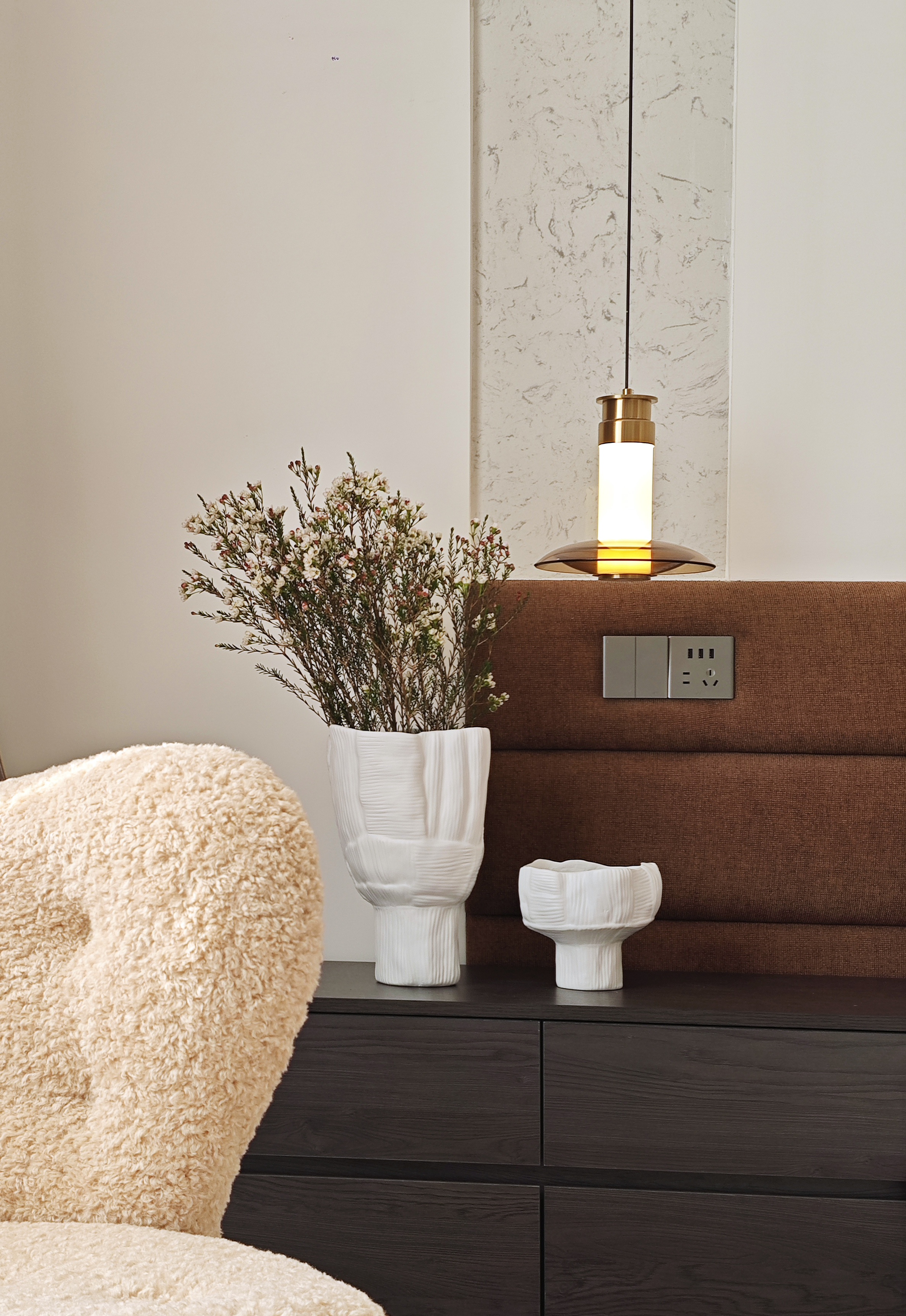 光与影,白色空间基调,穿插简练的块面关系,搭以温润的咖色木饰面和肌理感的大理石。具有凝聚力的现代气息,细腻而丰富不凡。 光里有温情,影里有画意,生命之外还有生活。加以自然,便有了光感,生活多了份柔情与温馨。