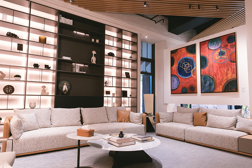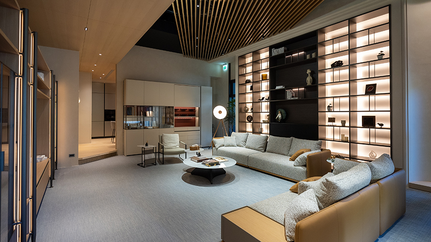 ▲李羽芝总监(左)、黄翊峰总监(右)于展厅亲自体验RARA系统家具的实用性,并研究细处工艺和质感五金的应用方式,把握每次扩大眼界的机会。