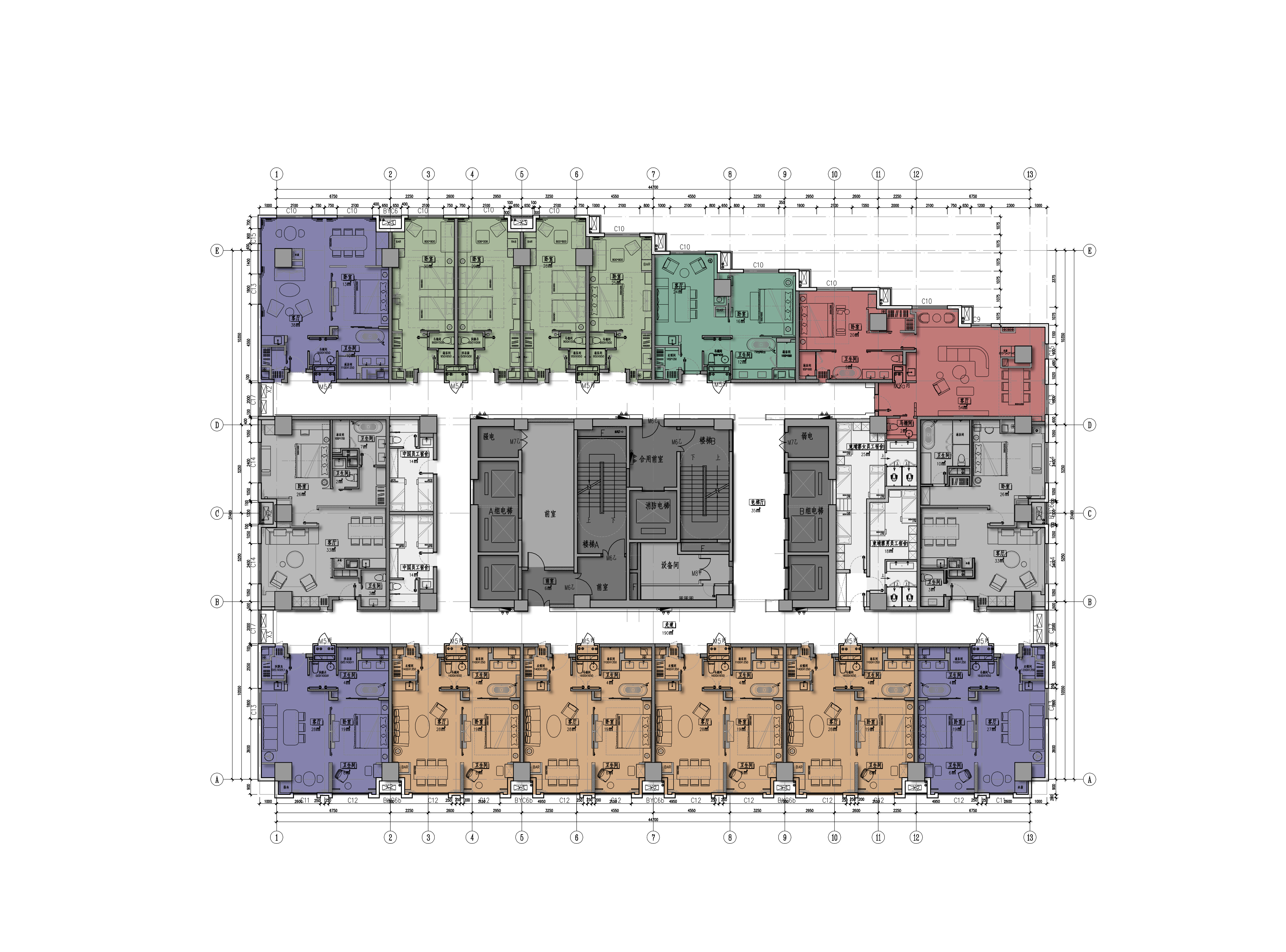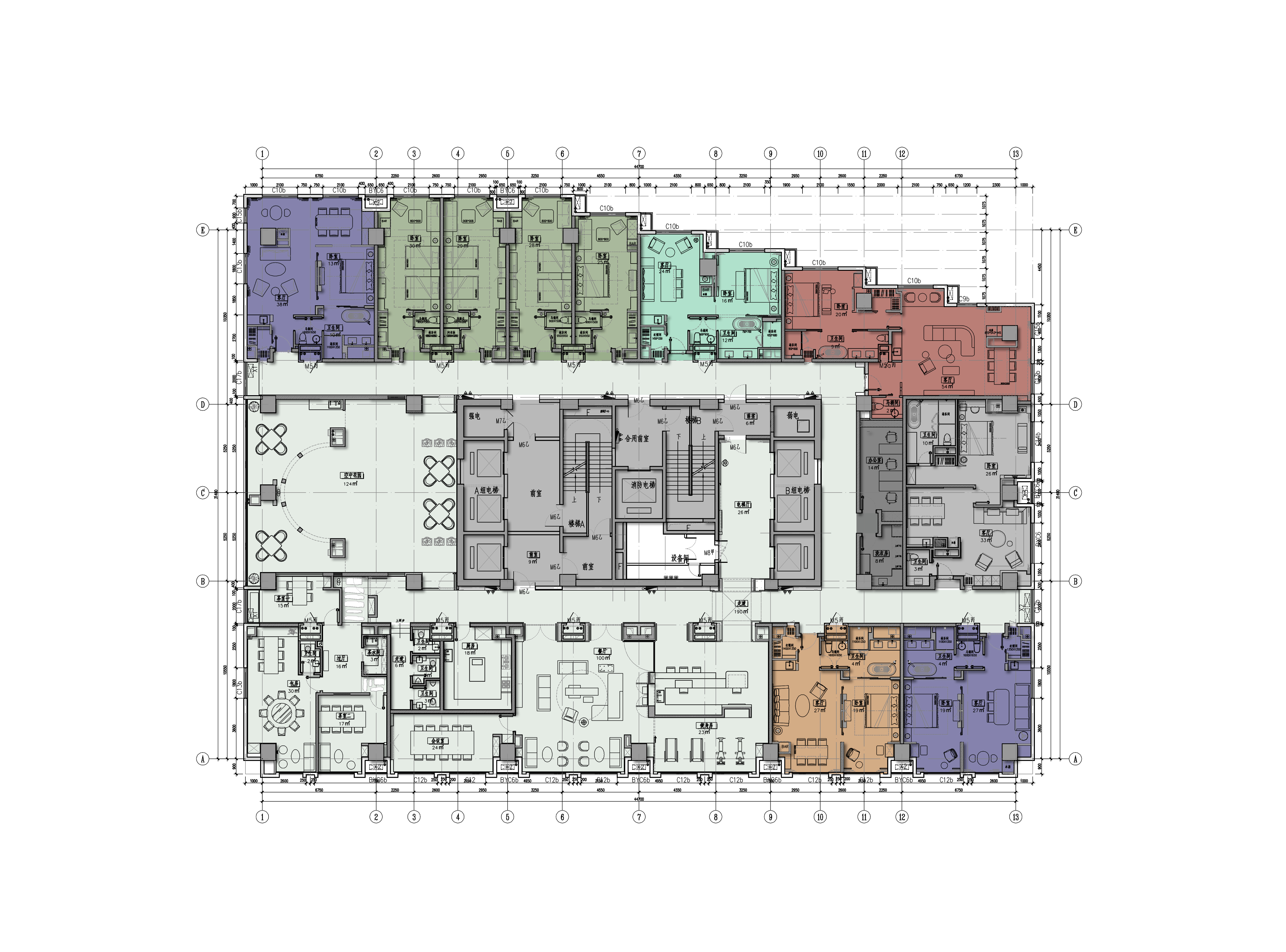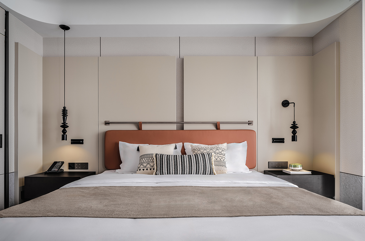 空间布局:25间客房灵活多变,融合中国六大古典建筑派别精髓,实现睡眠、办公与社交功能自由切换。各派客房以结构、色彩与文化符号为灵感,营造多样风格体验,体现空间功能与美学的统一。