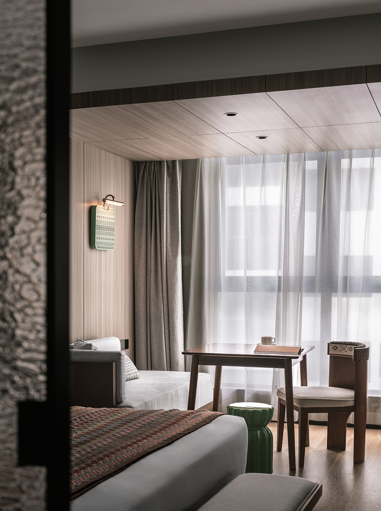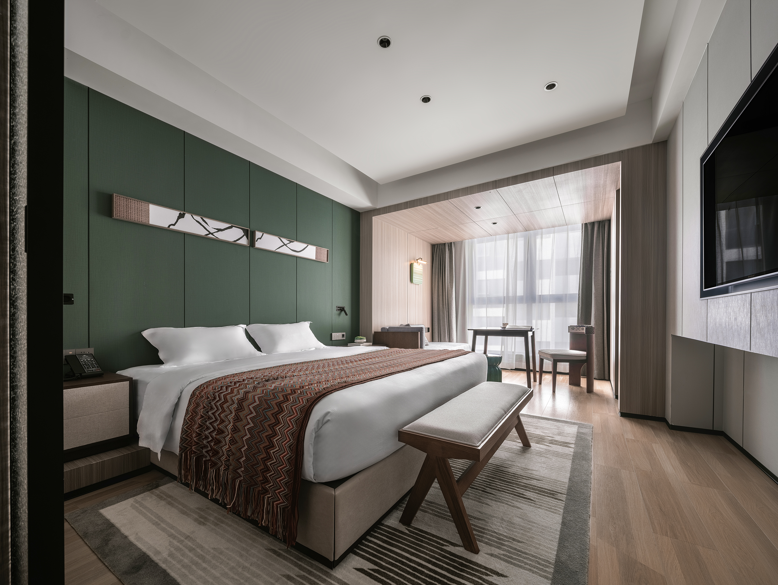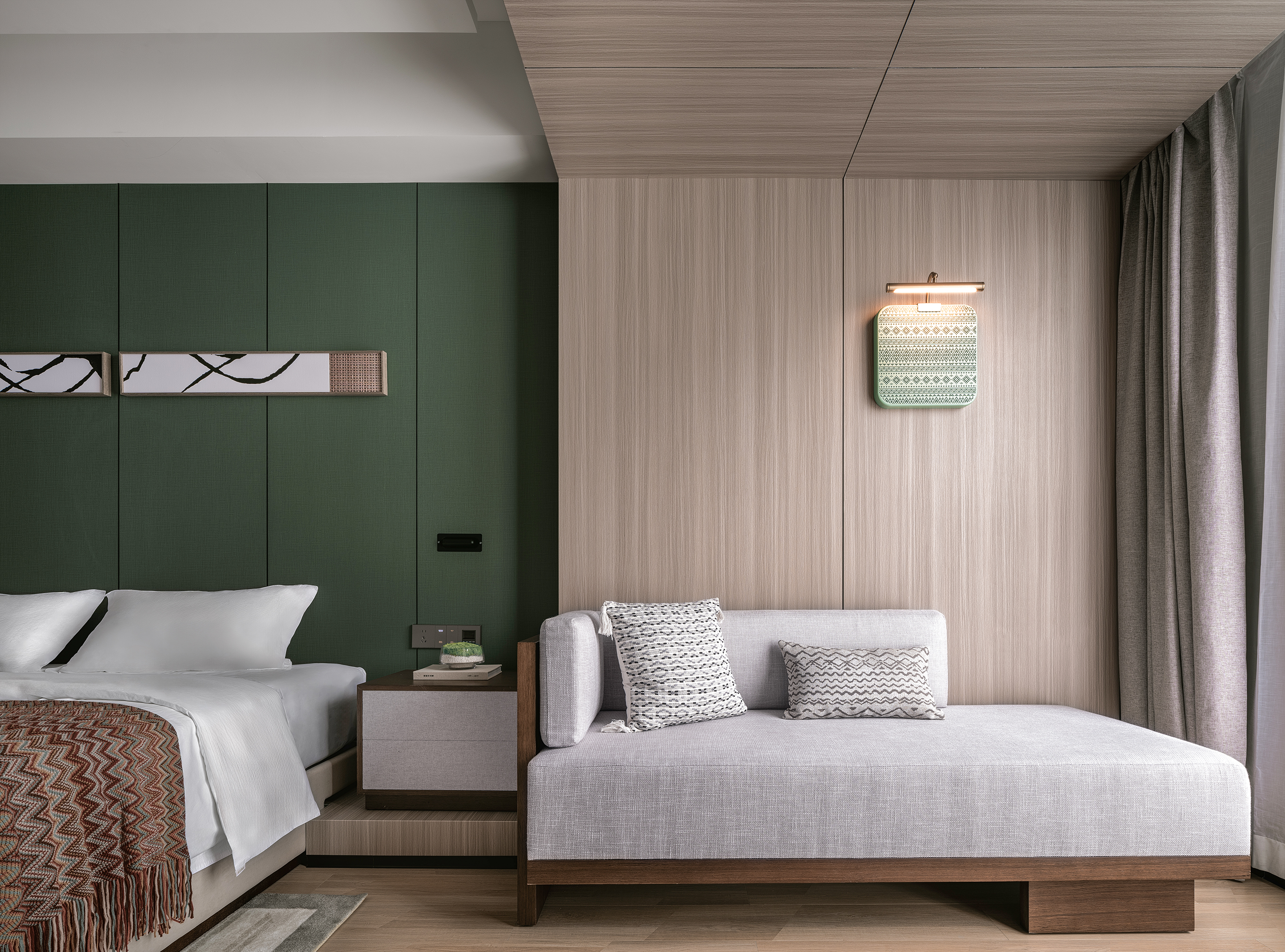 设计选材:墙面、地砖与装饰中融入传统纹样,色彩上选用翡翠绿与佛寺金作为主调,体现地域文化特征。客房设计深入提取中国各地建筑形态与美学元素,实现文化符号的现代转译与空间适配。