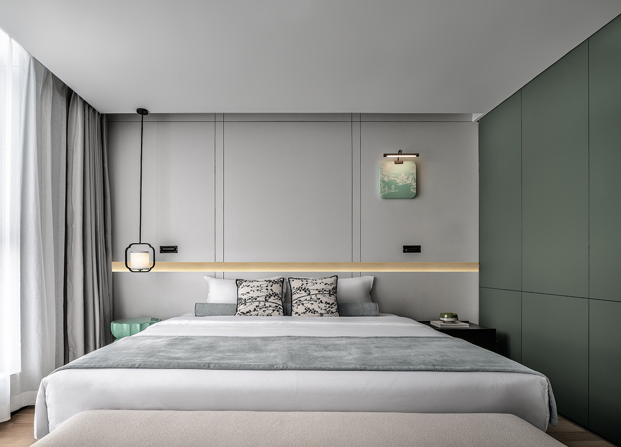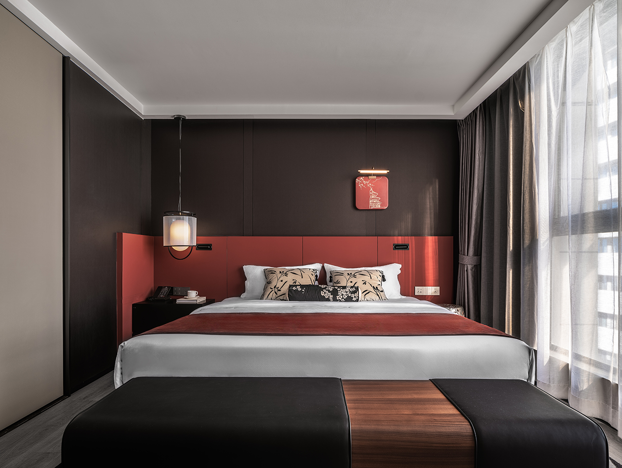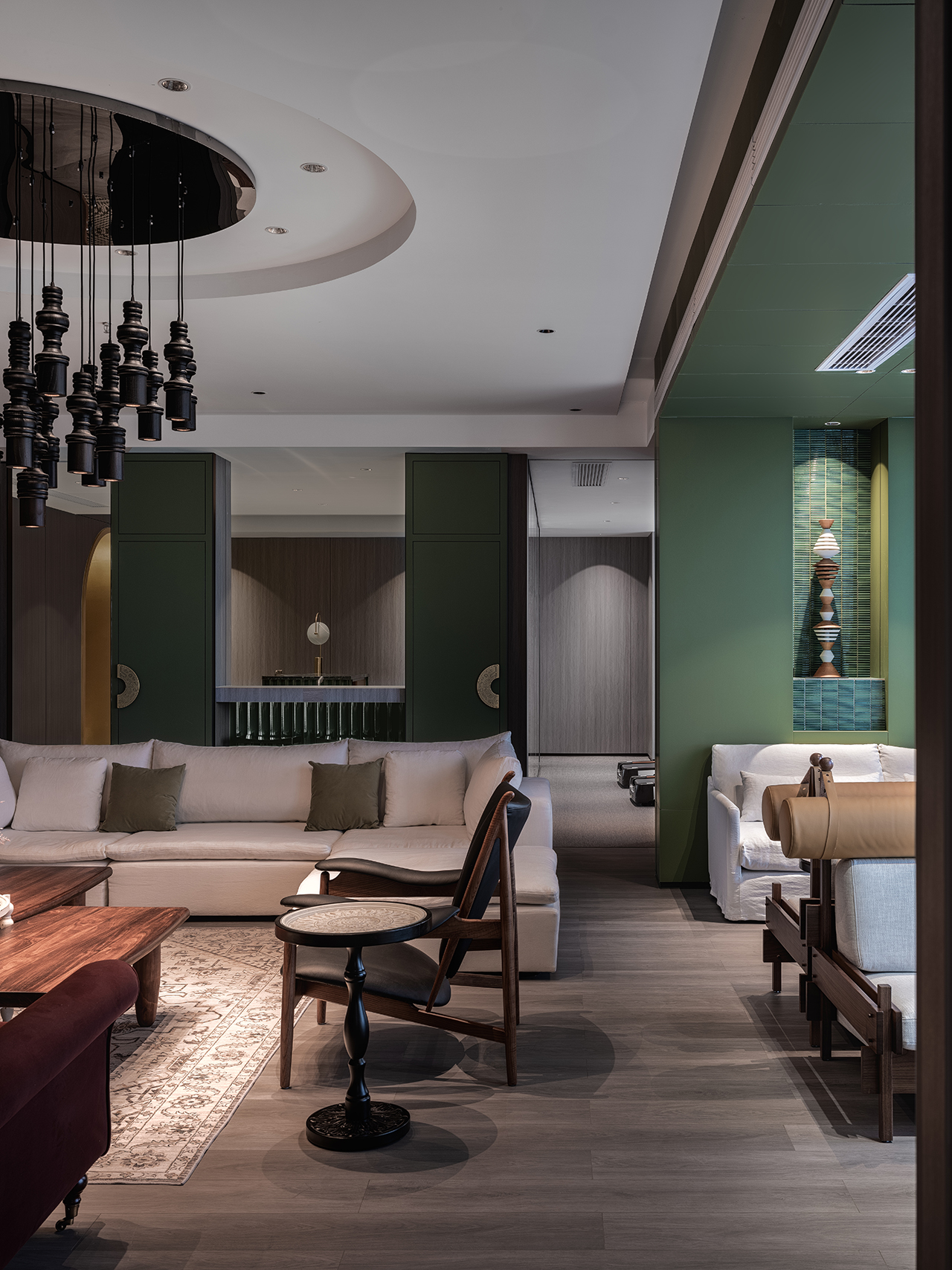 设计选材:墙面、地砖与装饰中融入传统纹样,色彩上选用翡翠绿与佛寺金作为主调,体现地域文化特征。客房设计深入提取中国各地建筑形态与美学元素,实现文化符号的现代转译与空间适配。