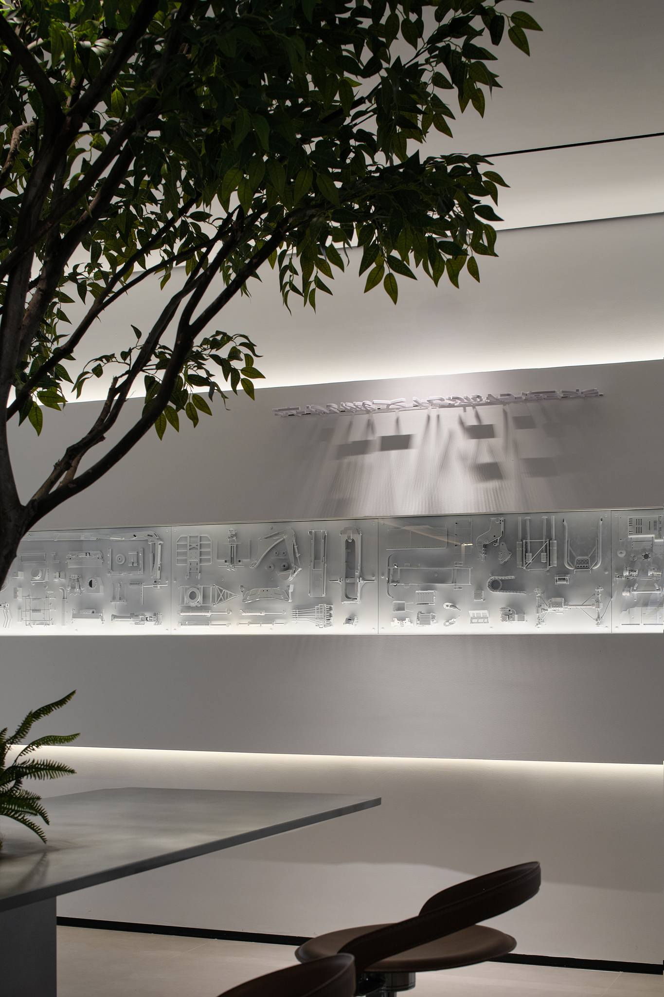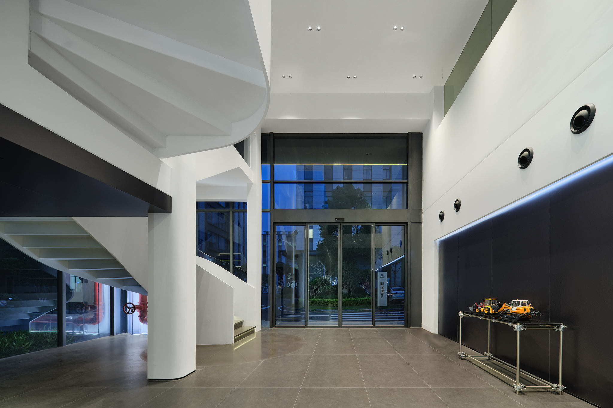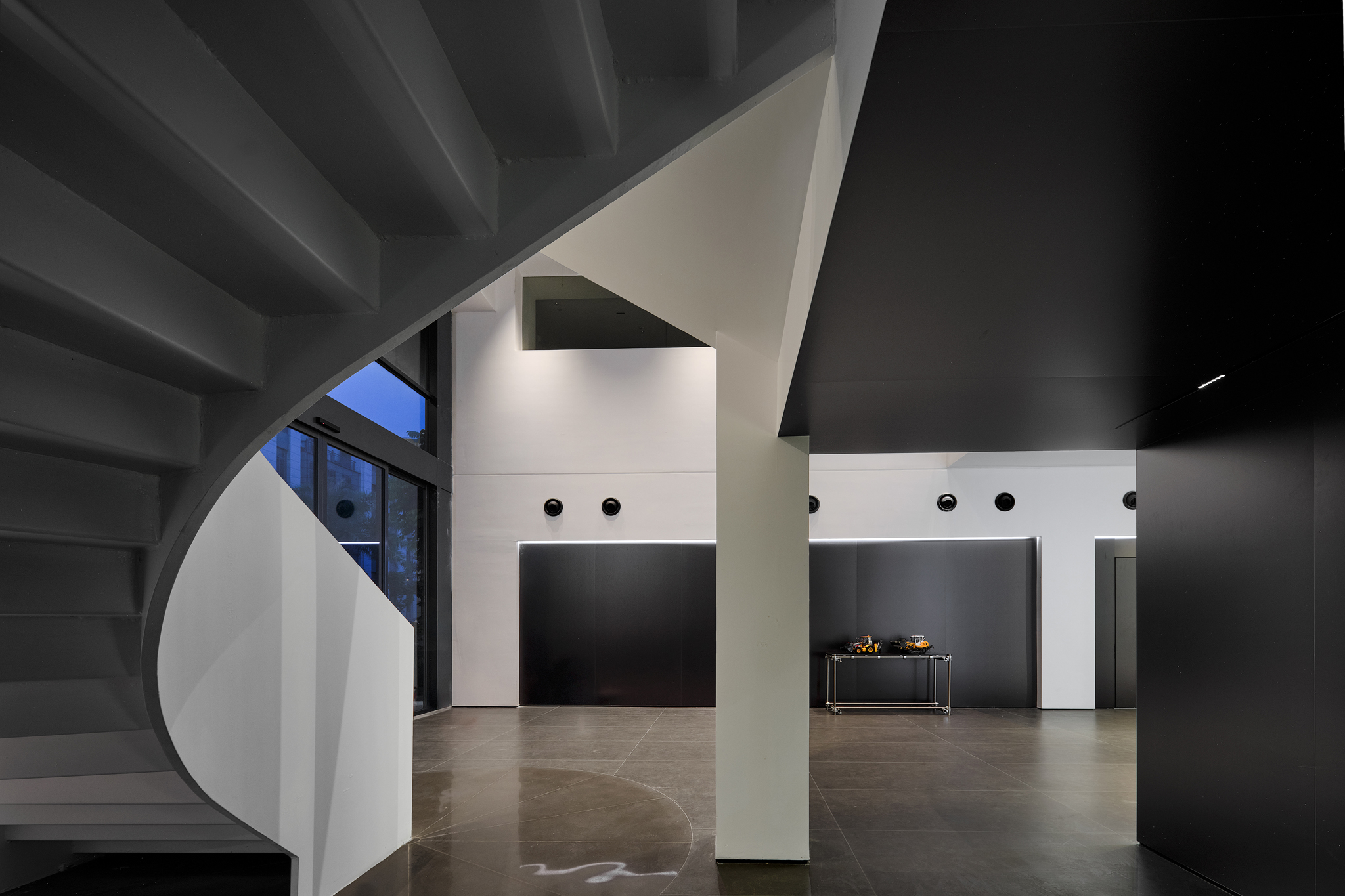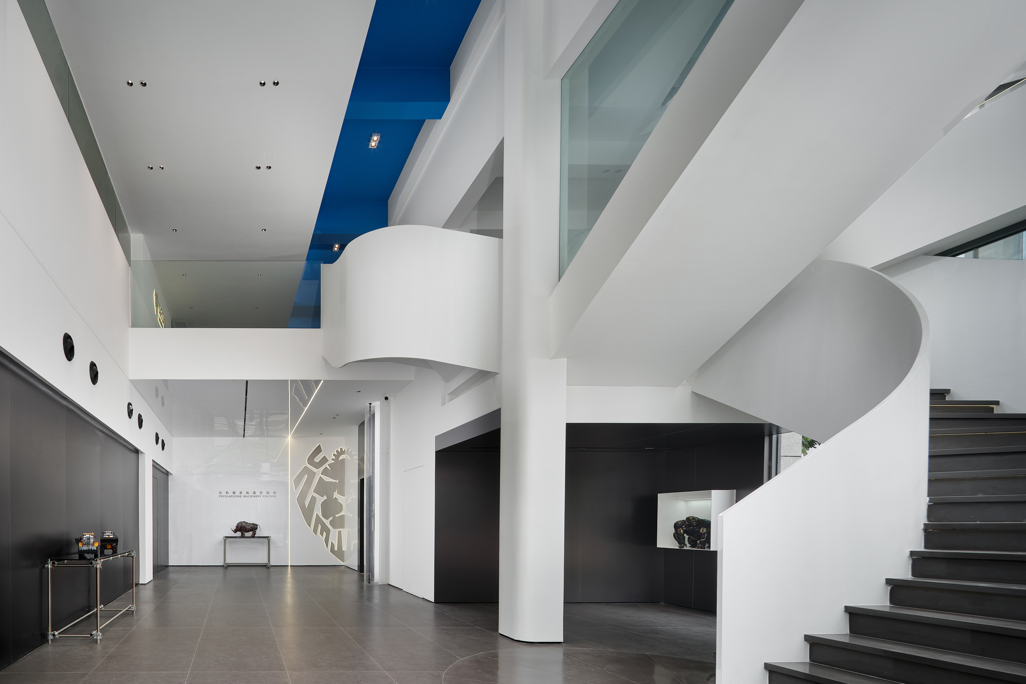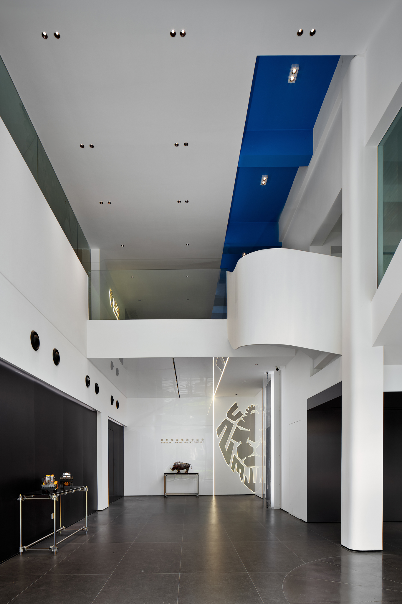 空间意境:纯白色基地的大厅内,裸露的科技蓝横梁直线贯穿直引内部以及车间的黑色门与右侧的黑色墙体与之呼应,沉淀工业底色;曲线突兀的旋转楼梯使得一层与二层与之互动,适当打破规则,让空间结构活跃,充斥未来的各种可能,细节语言上无不说着机械文化。