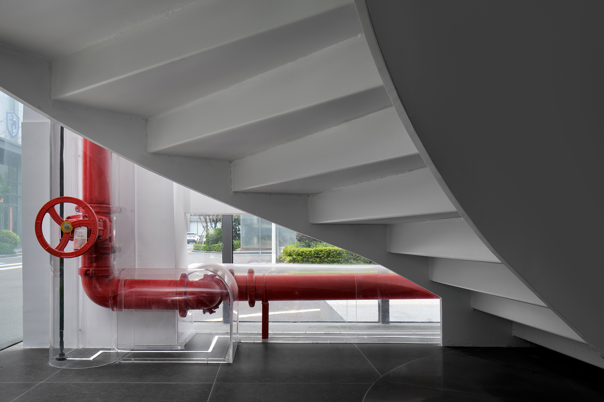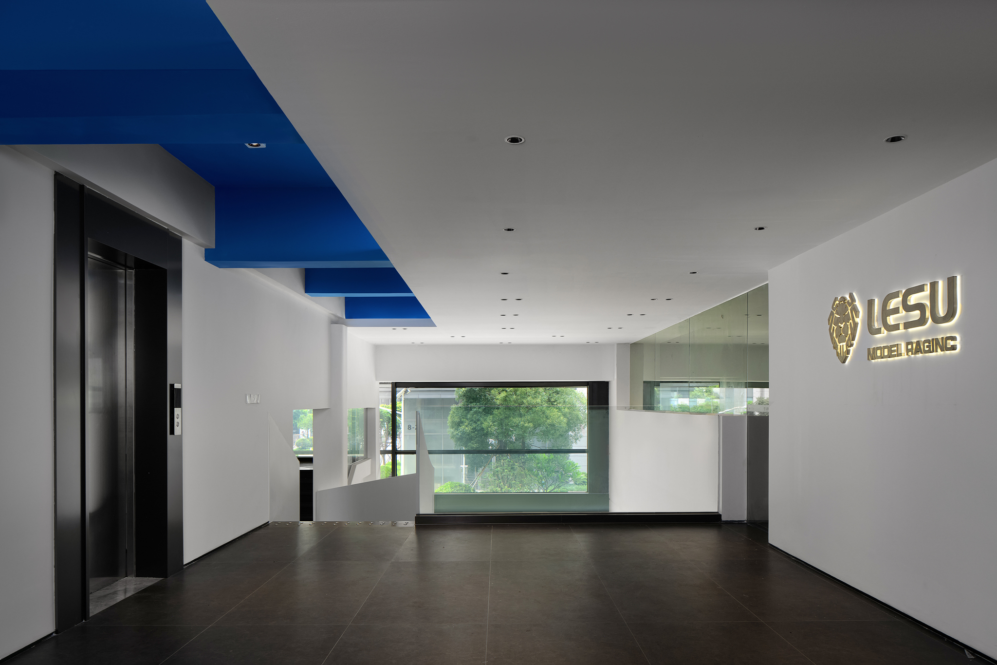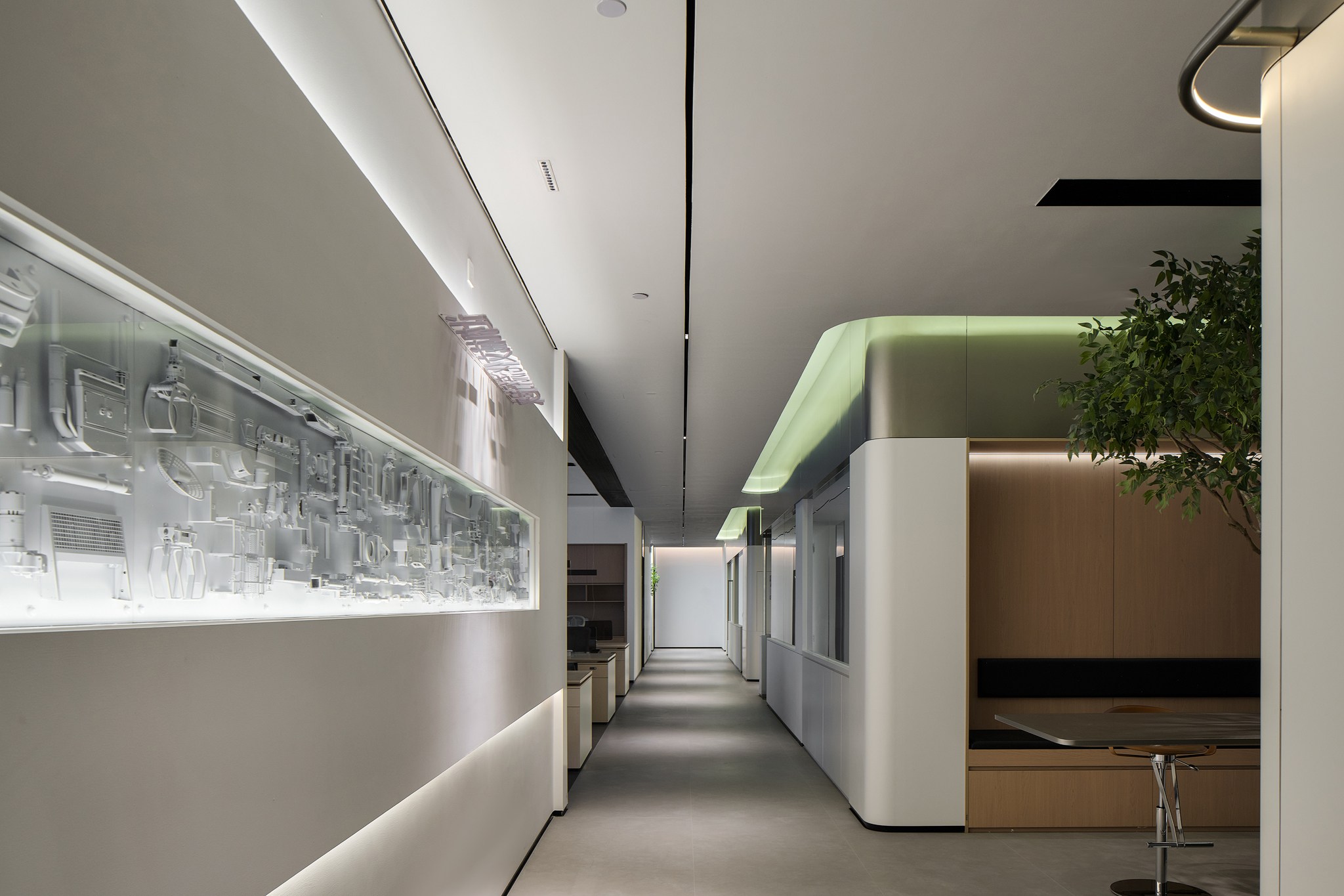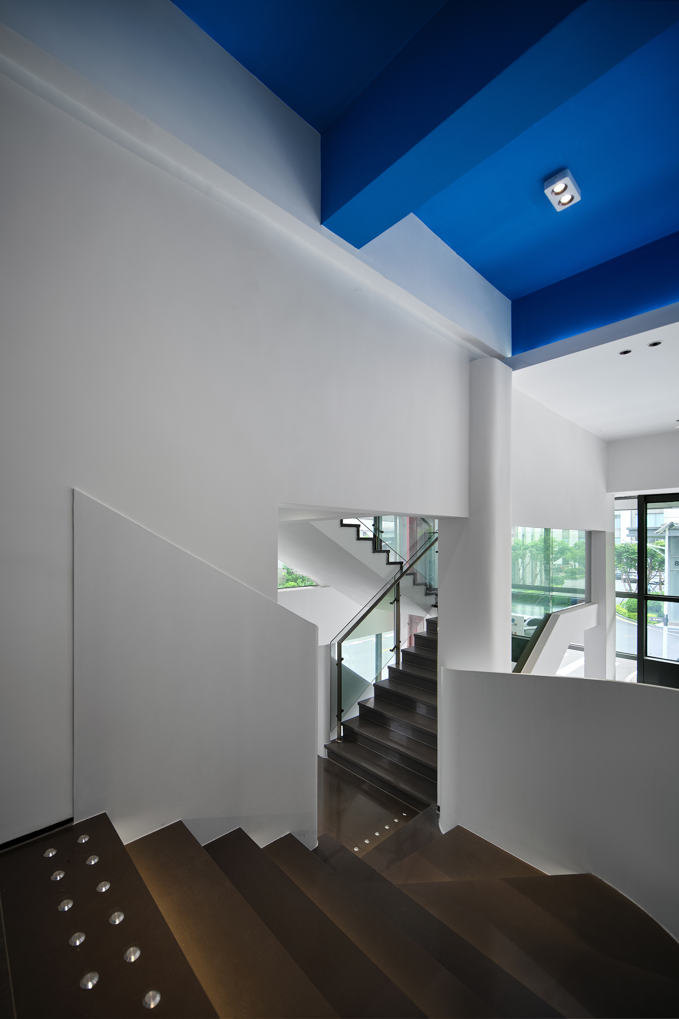 空间意境:纯白色基地的大厅内,裸露的科技蓝横梁直线贯穿直引内部以及车间的黑色门与右侧的黑色墙体与之呼应,沉淀工业底色;曲线突兀的旋转楼梯使得一层与二层与之互动,适当打破规则,让空间结构活跃,充斥未来的各种可能,细节语言上无不说着机械文化。