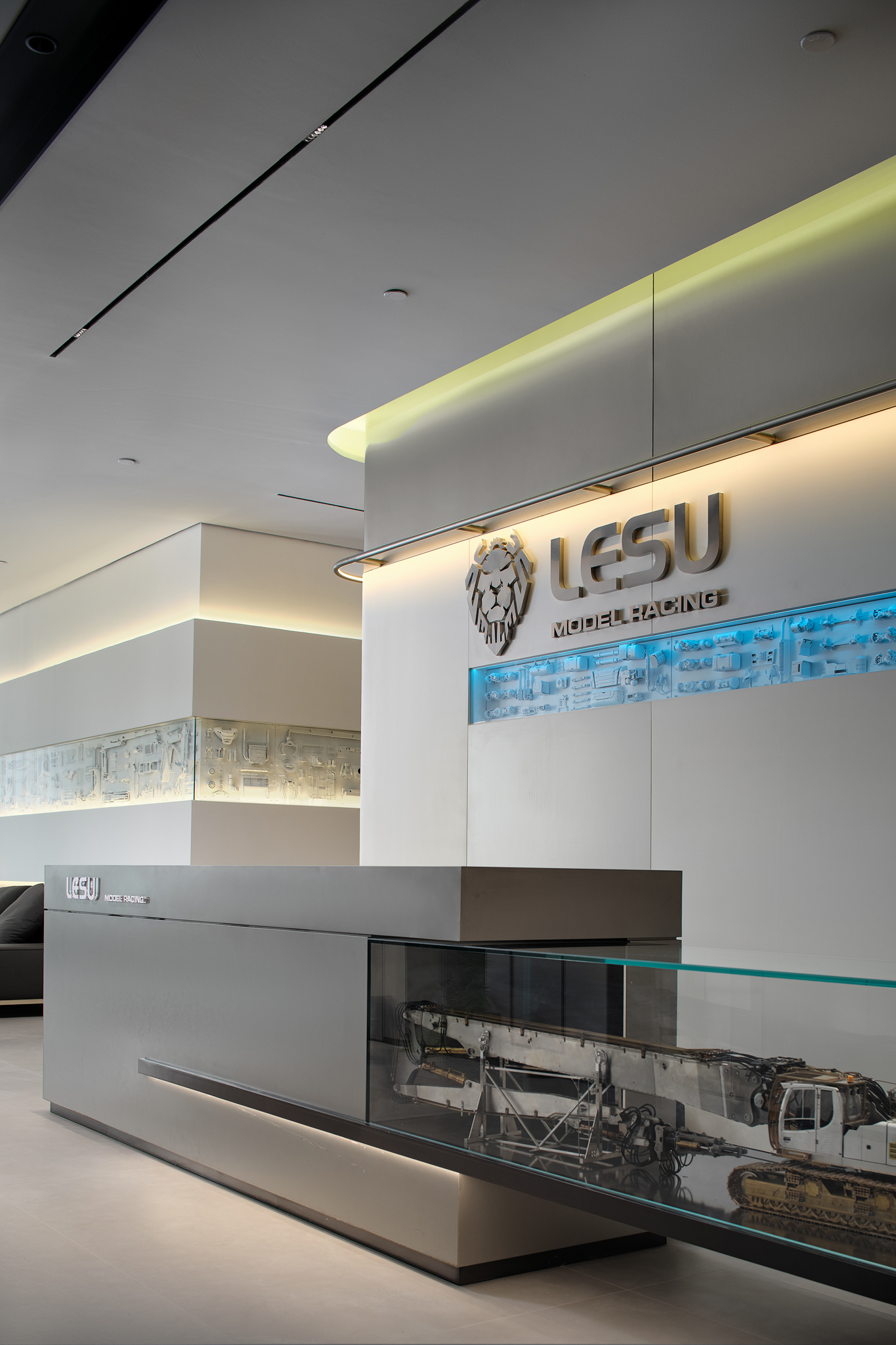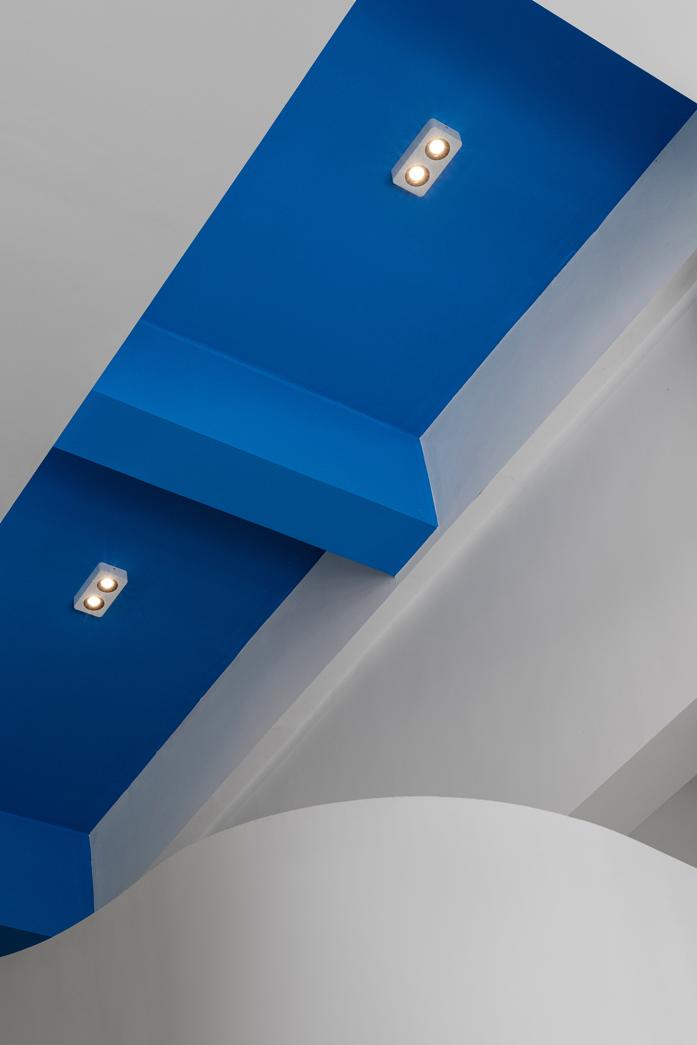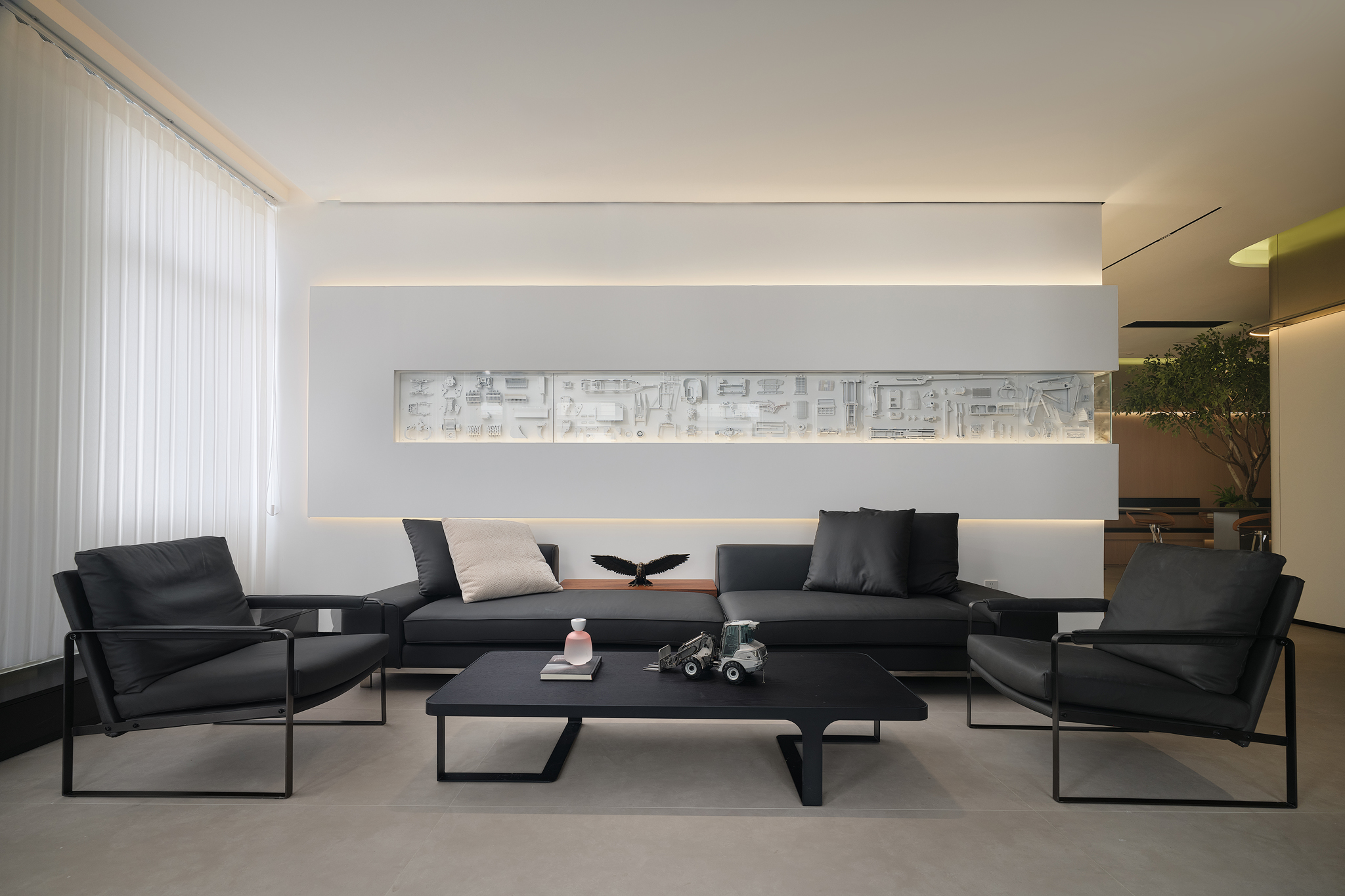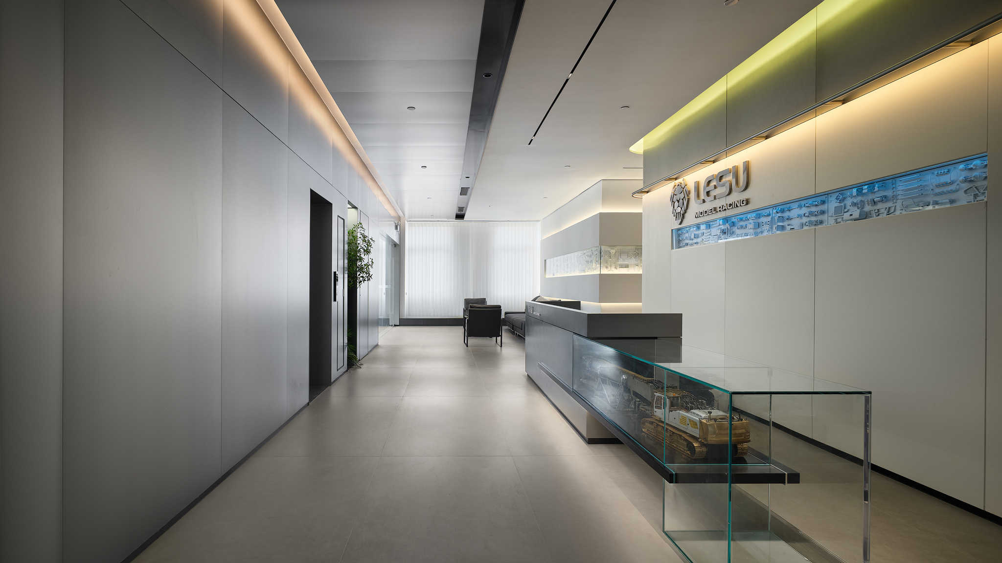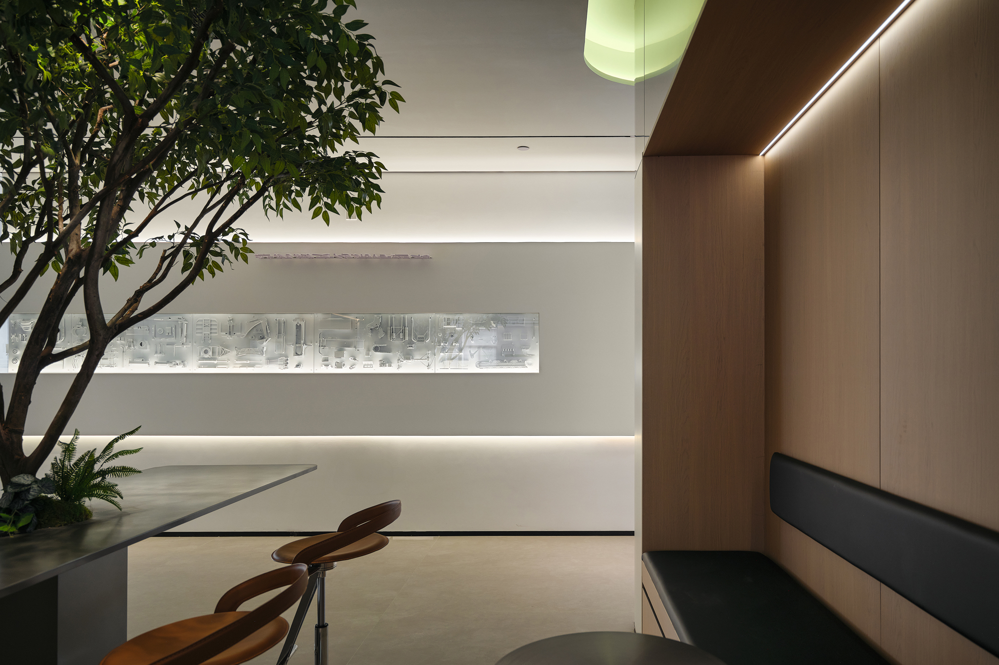 空间意境:纯白色基地的大厅内,裸露的科技蓝横梁直线贯穿直引内部以及车间的黑色门与右侧的黑色墙体与之呼应,沉淀工业底色;曲线突兀的旋转楼梯使得一层与二层与之互动,适当打破规则,让空间结构活跃,充斥未来的各种可能,细节语言上无不说着机械文化。