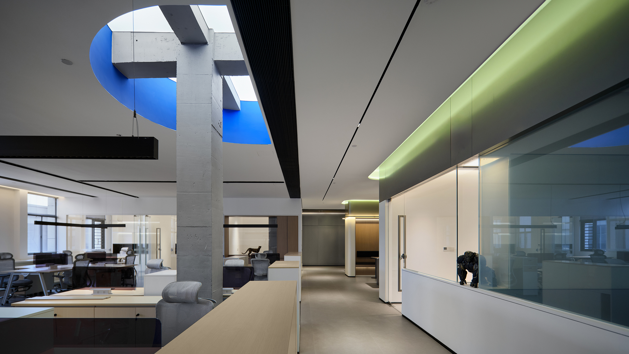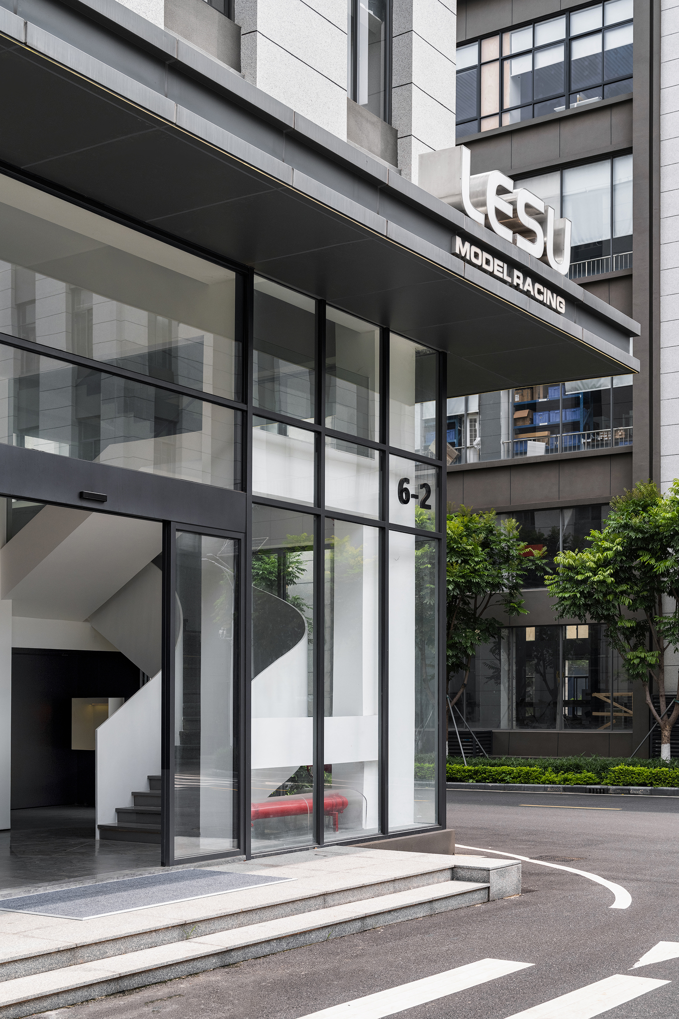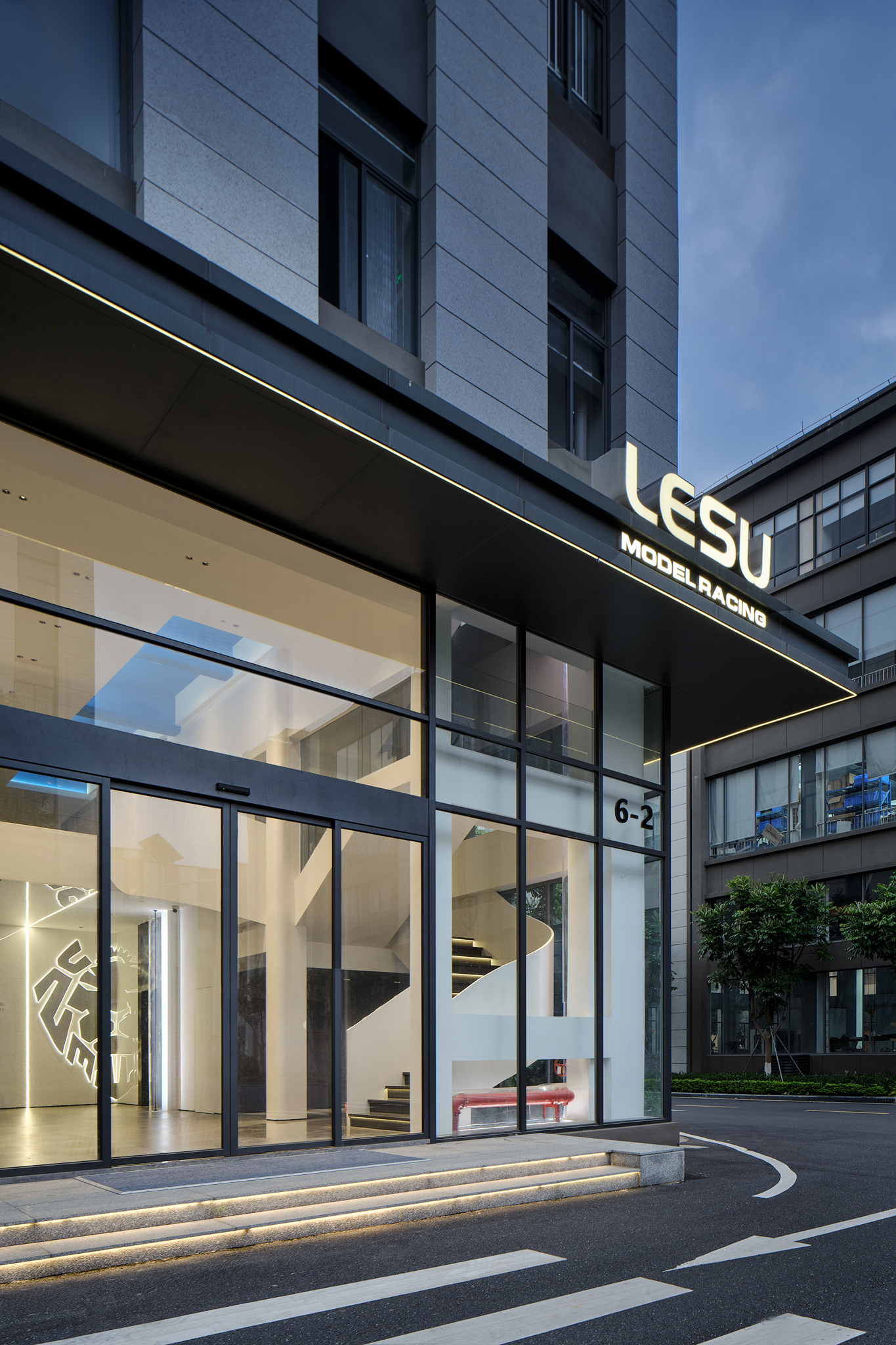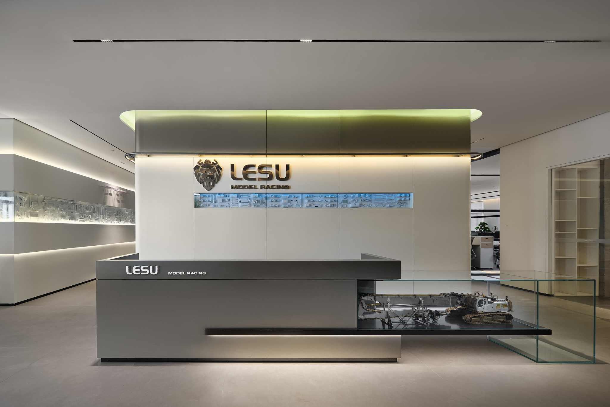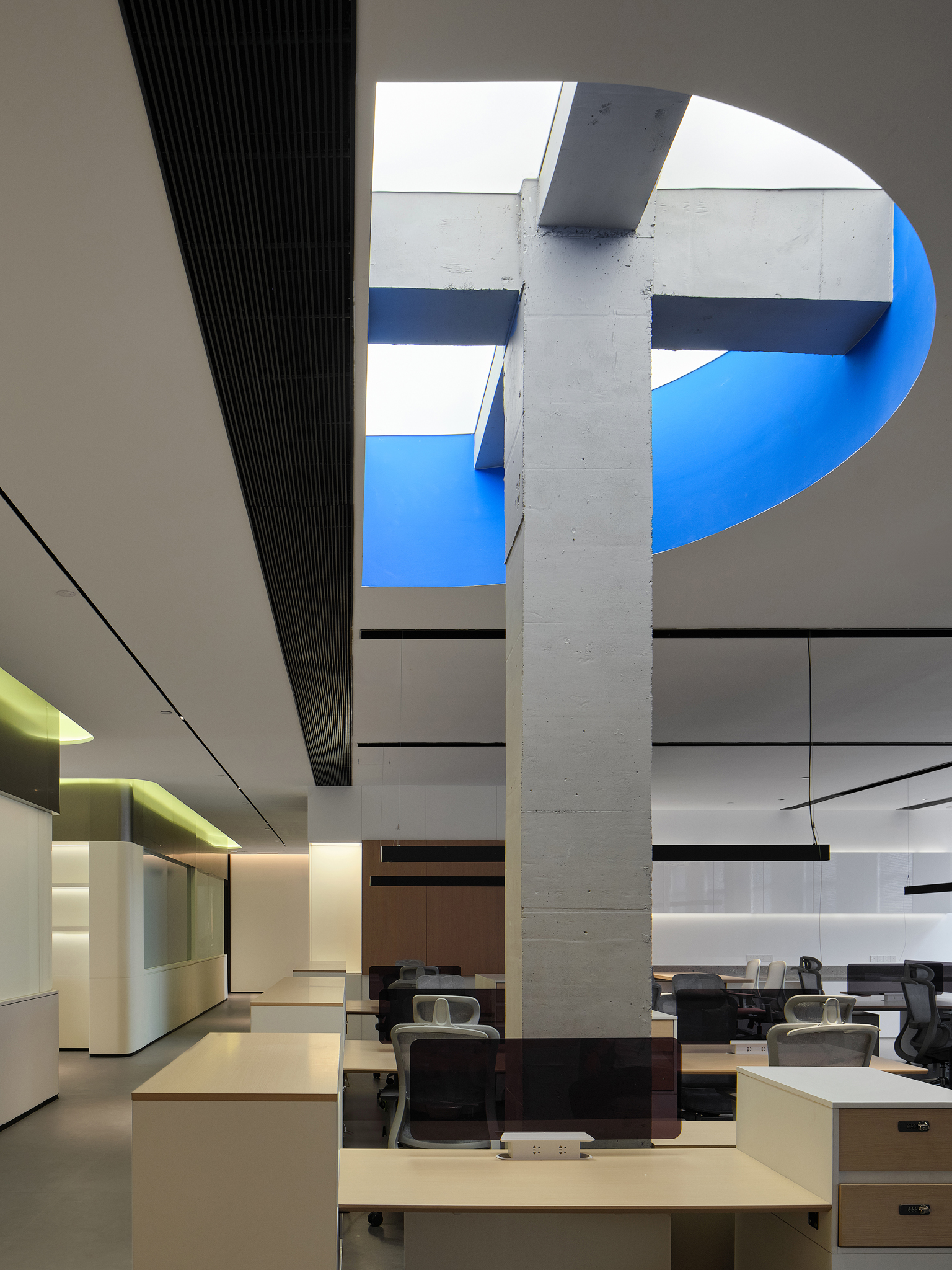 空间意境:纯白色基地的大厅内,裸露的科技蓝横梁直线贯穿直引内部以及车间的黑色门与右侧的黑色墙体与之呼应,沉淀工业底色;曲线突兀的旋转楼梯使得一层与二层与之互动,适当打破规则,让空间结构活跃,充斥未来的各种可能,细节语言上无不说着机械文化。