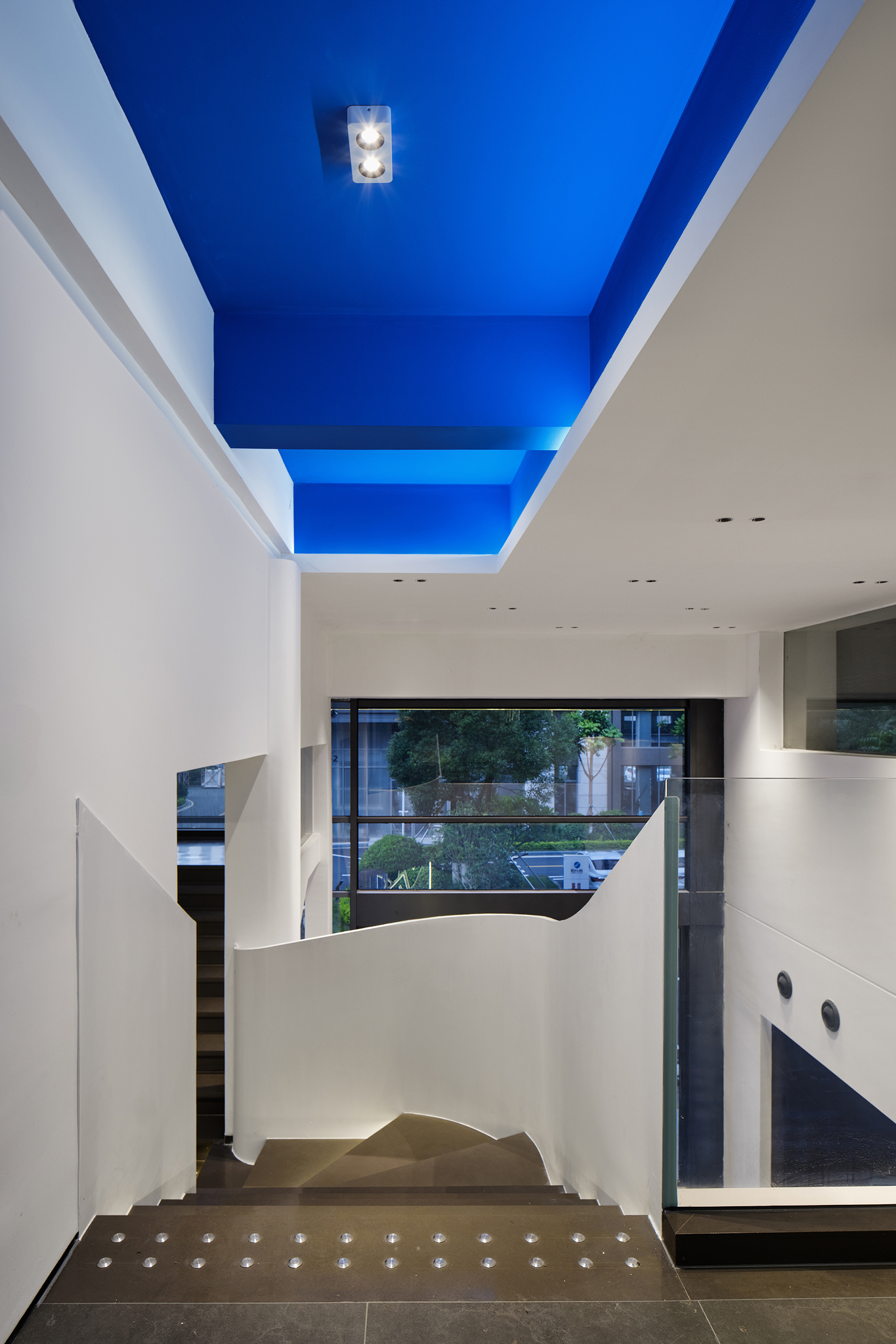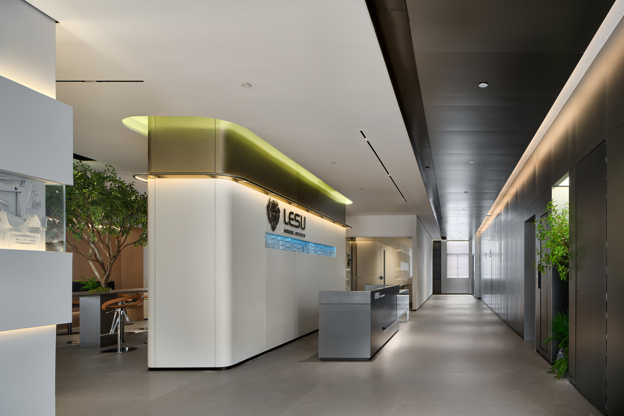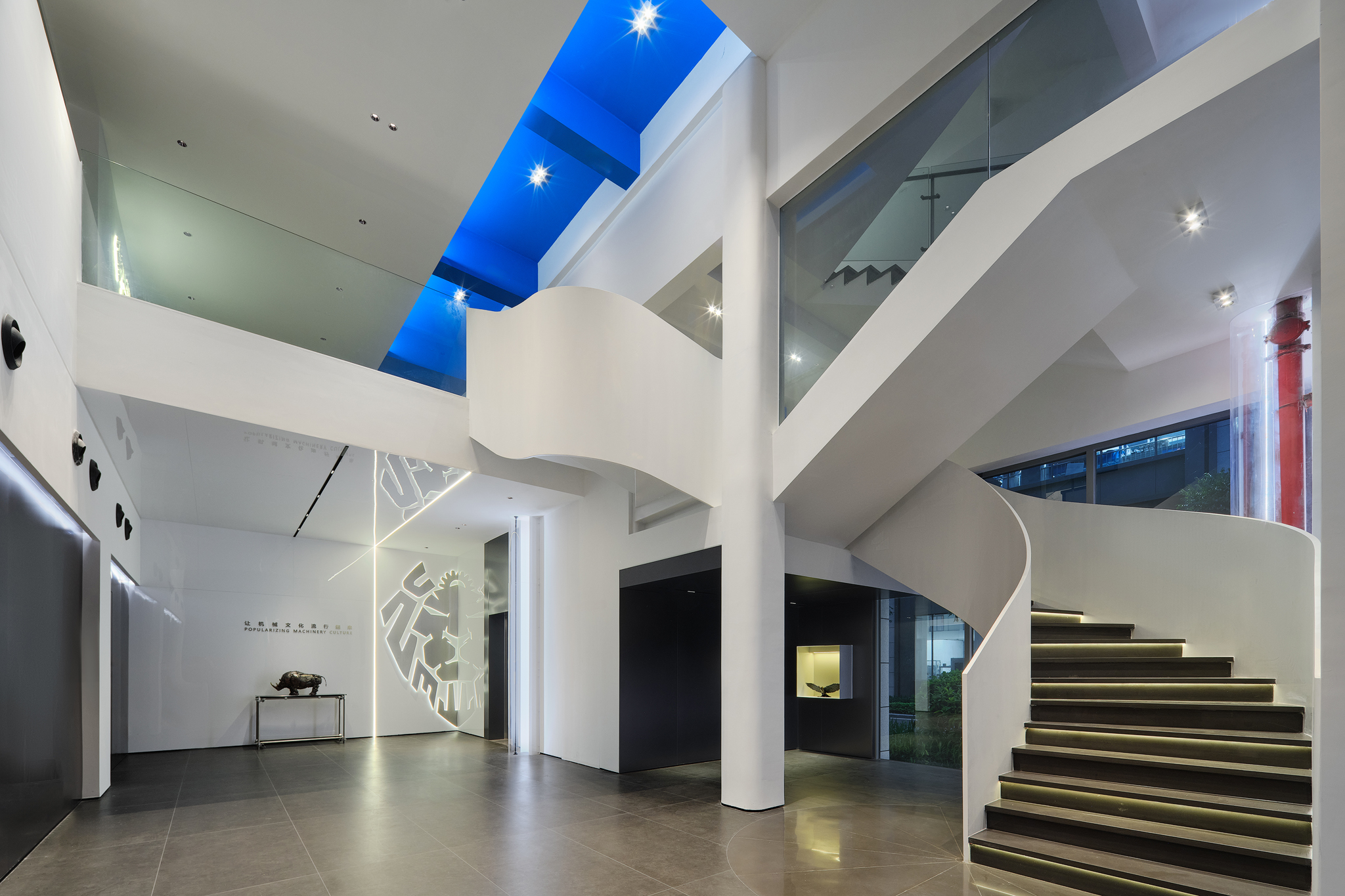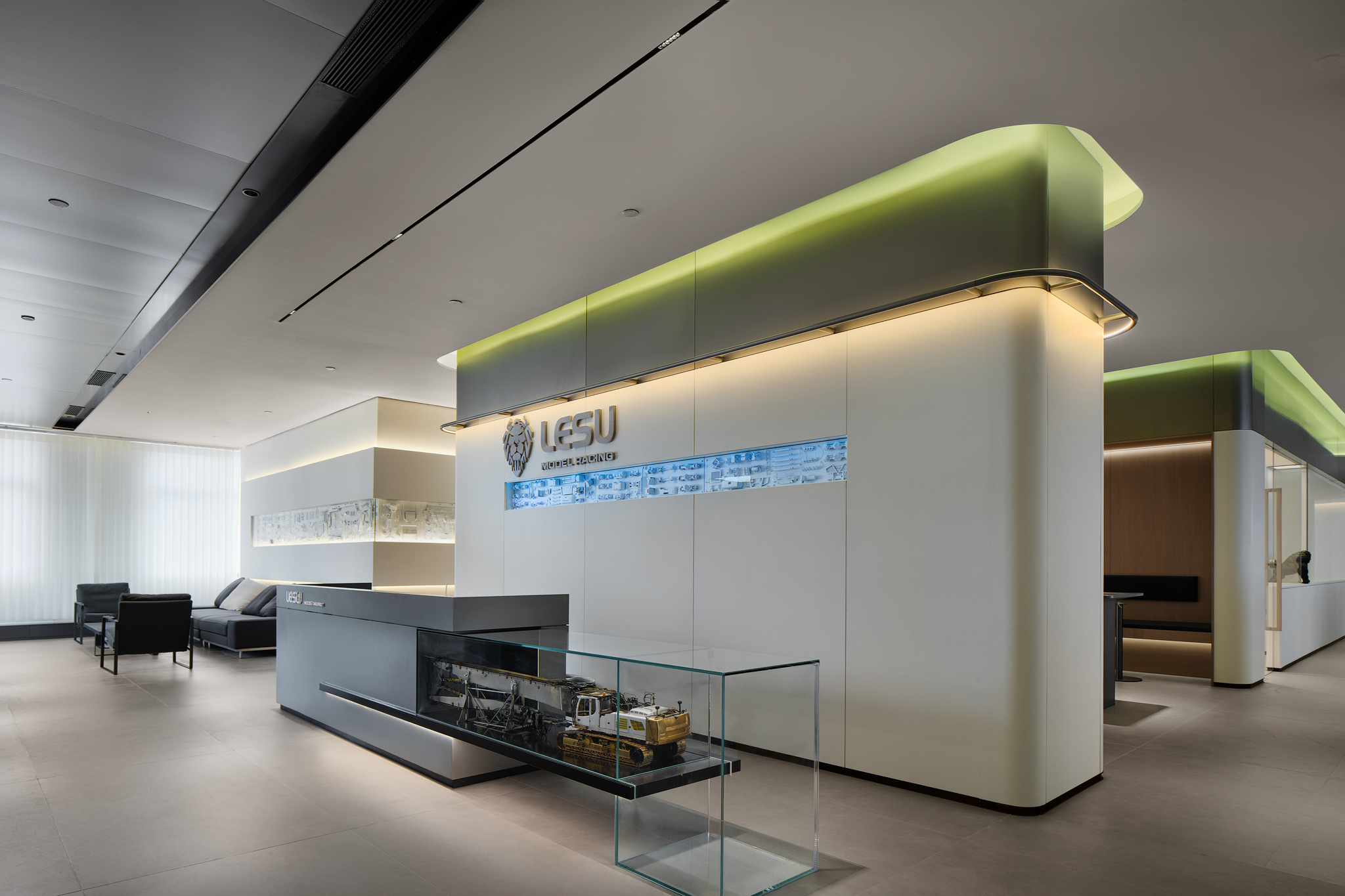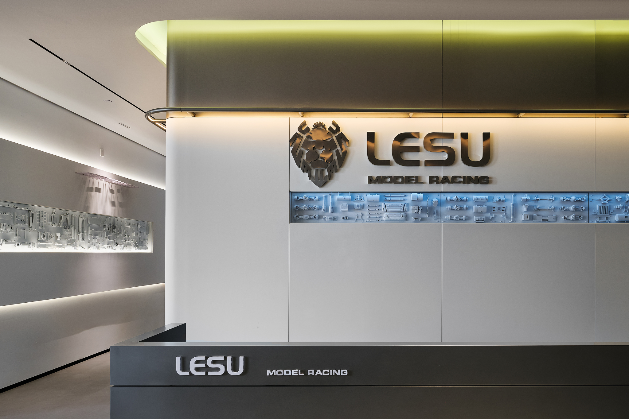 空间意境:纯白色基地的大厅内,裸露的科技蓝横梁直线贯穿直引内部以及车间的黑色门与右侧的黑色墙体与之呼应,沉淀工业底色;曲线突兀的旋转楼梯使得一层与二层与之互动,适当打破规则,让空间结构活跃,充斥未来的各种可能,细节语言上无不说着机械文化。