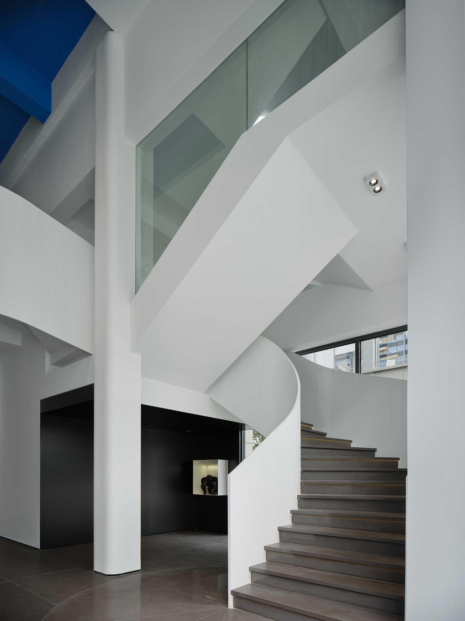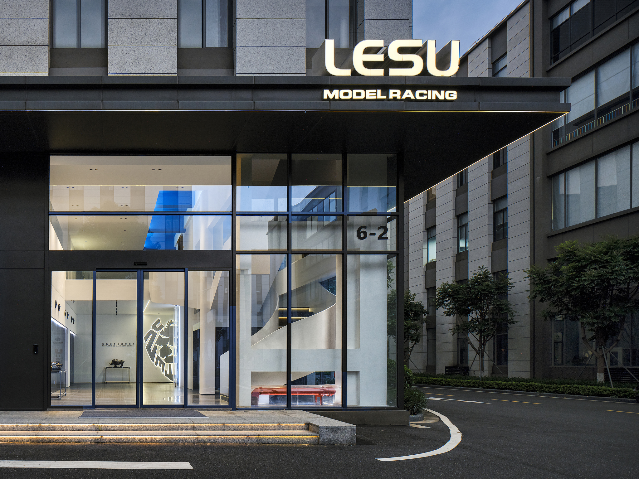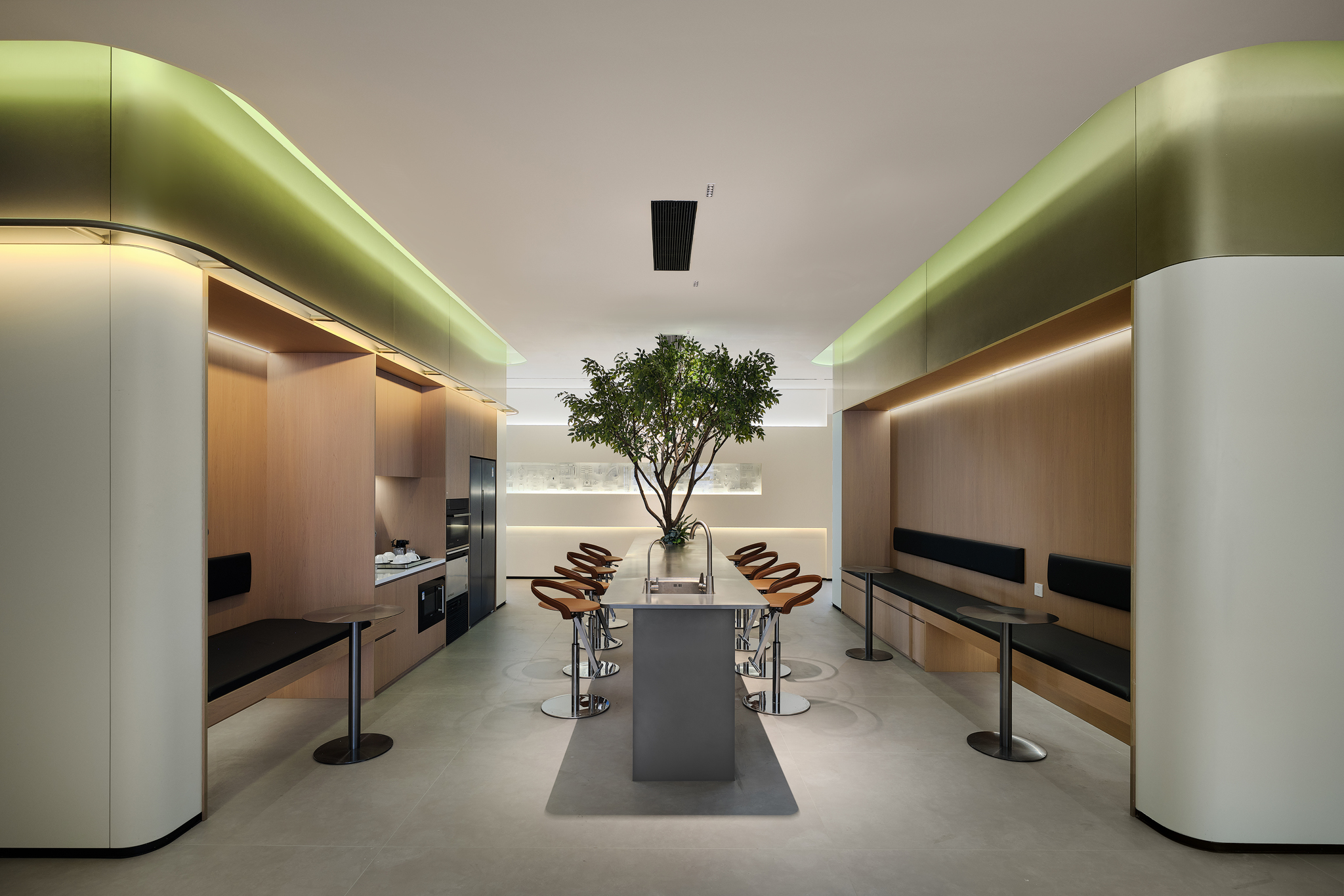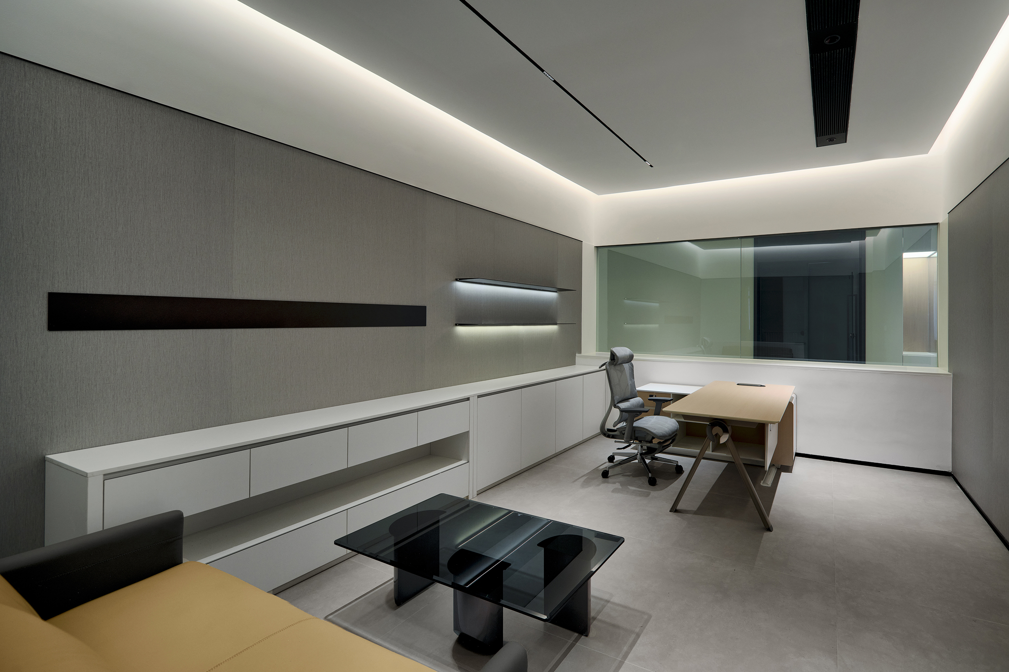 空间意境:纯白色基地的大厅内,裸露的科技蓝横梁直线贯穿直引内部以及车间的黑色门与右侧的黑色墙体与之呼应,沉淀工业底色;曲线突兀的旋转楼梯使得一层与二层与之互动,适当打破规则,让空间结构活跃,充斥未来的各种可能,细节语言上无不说着机械文化。