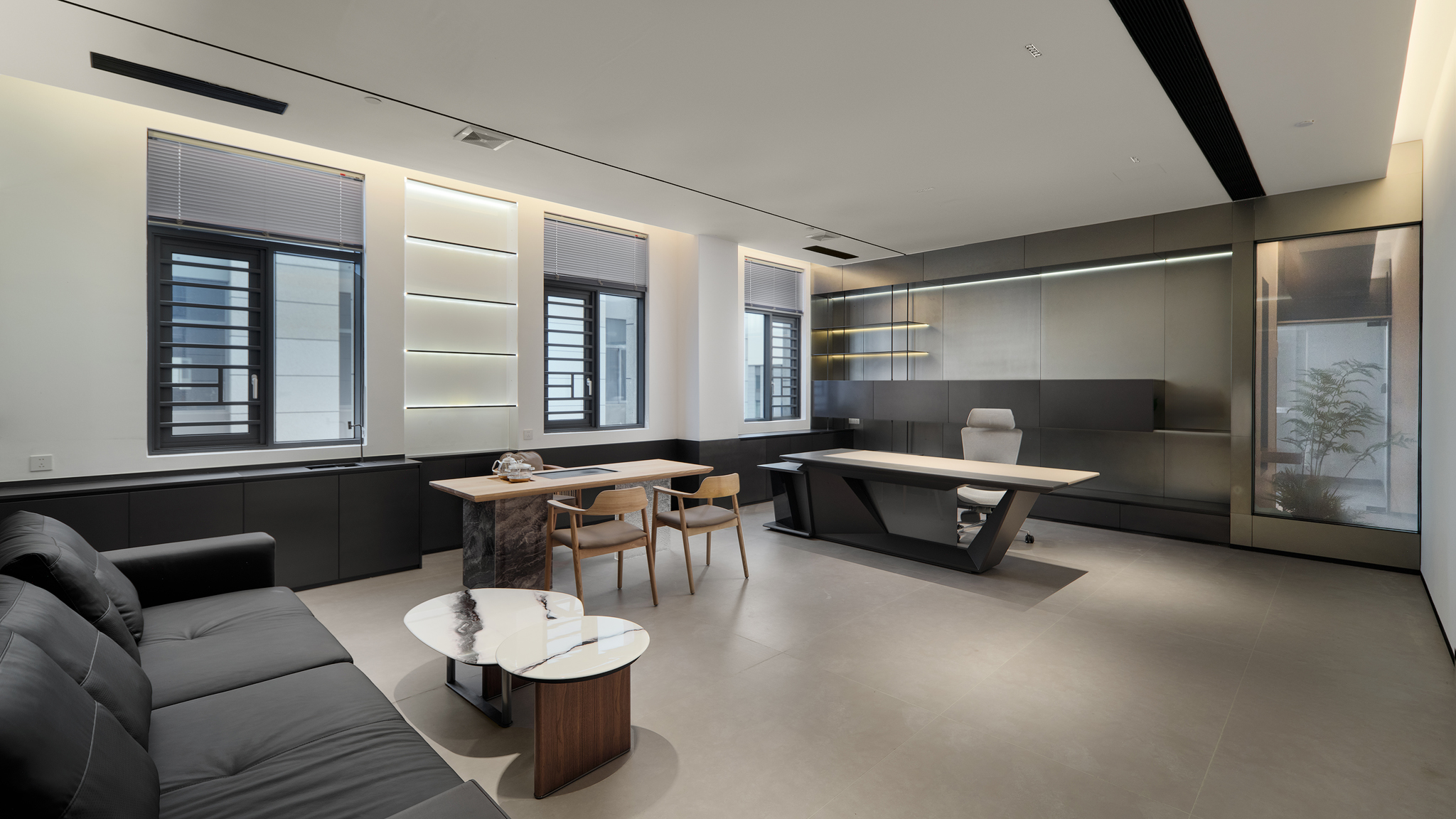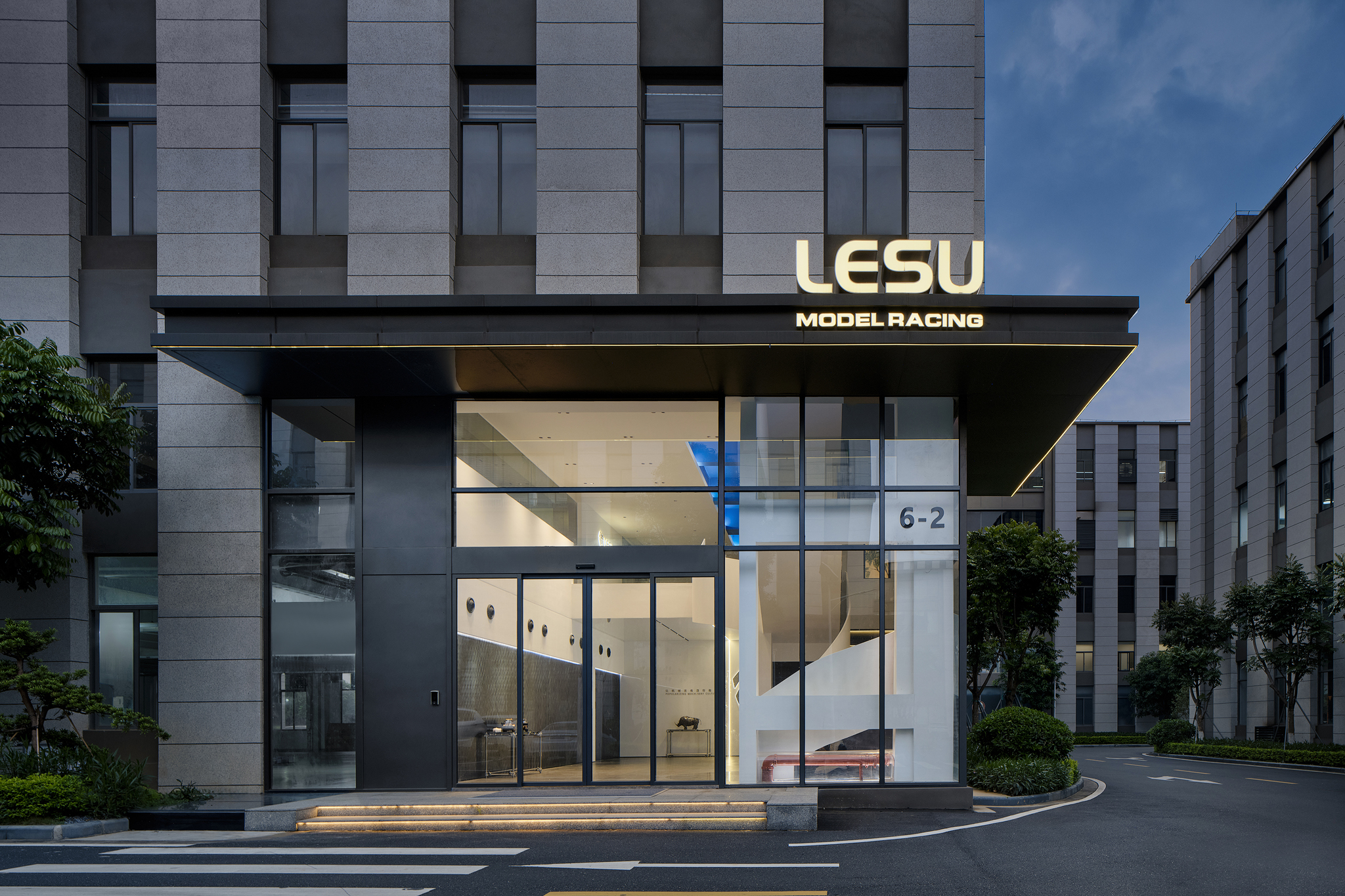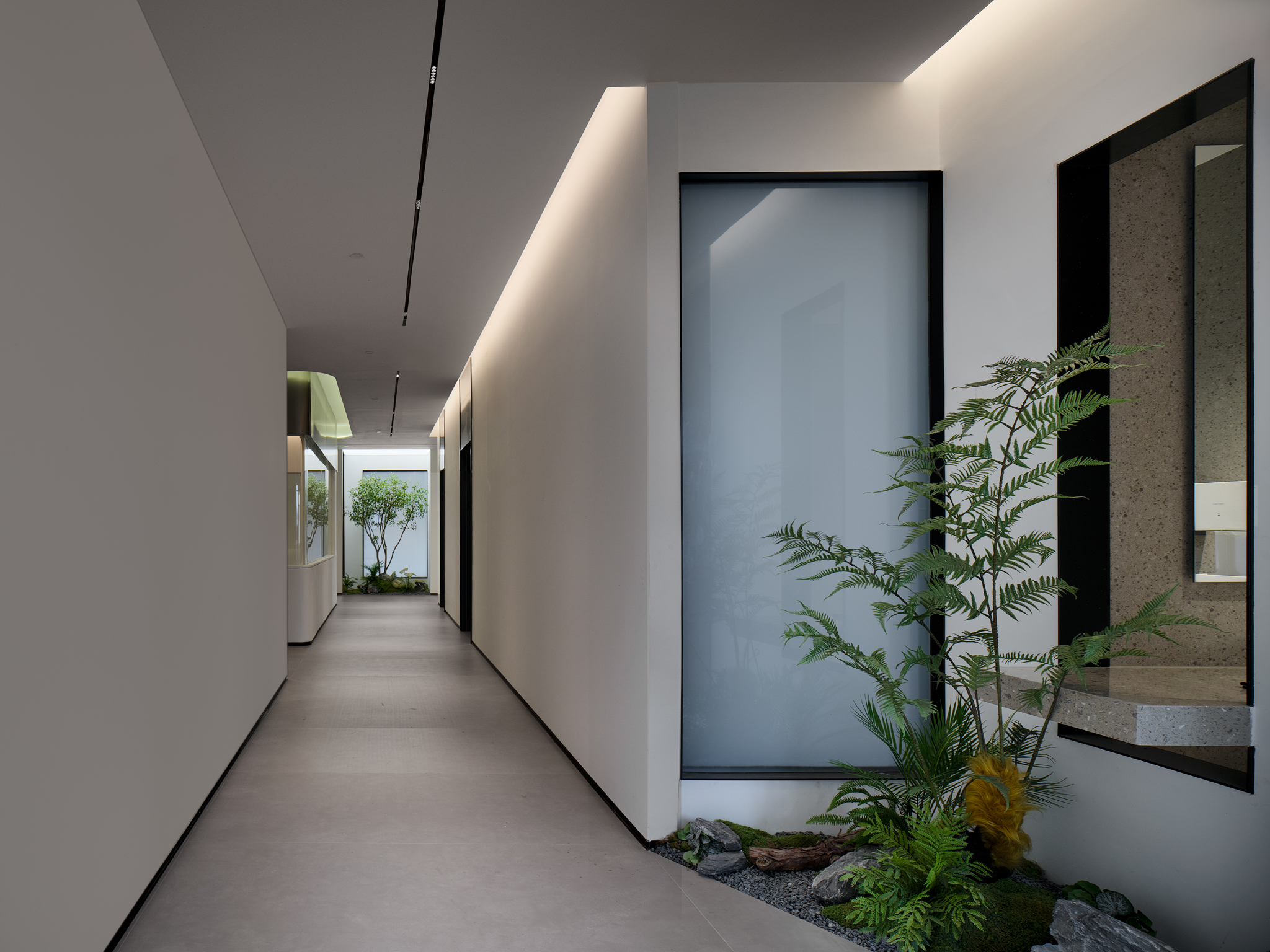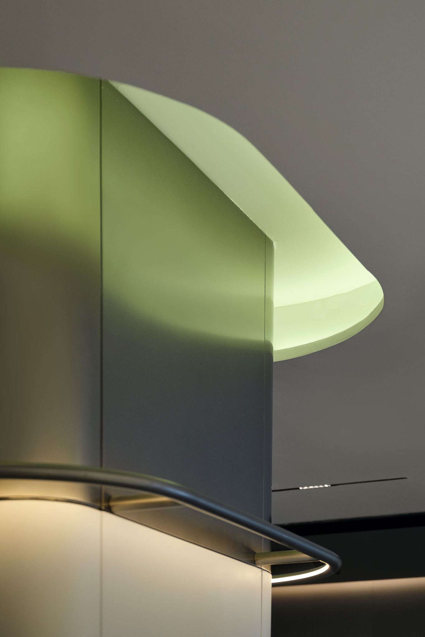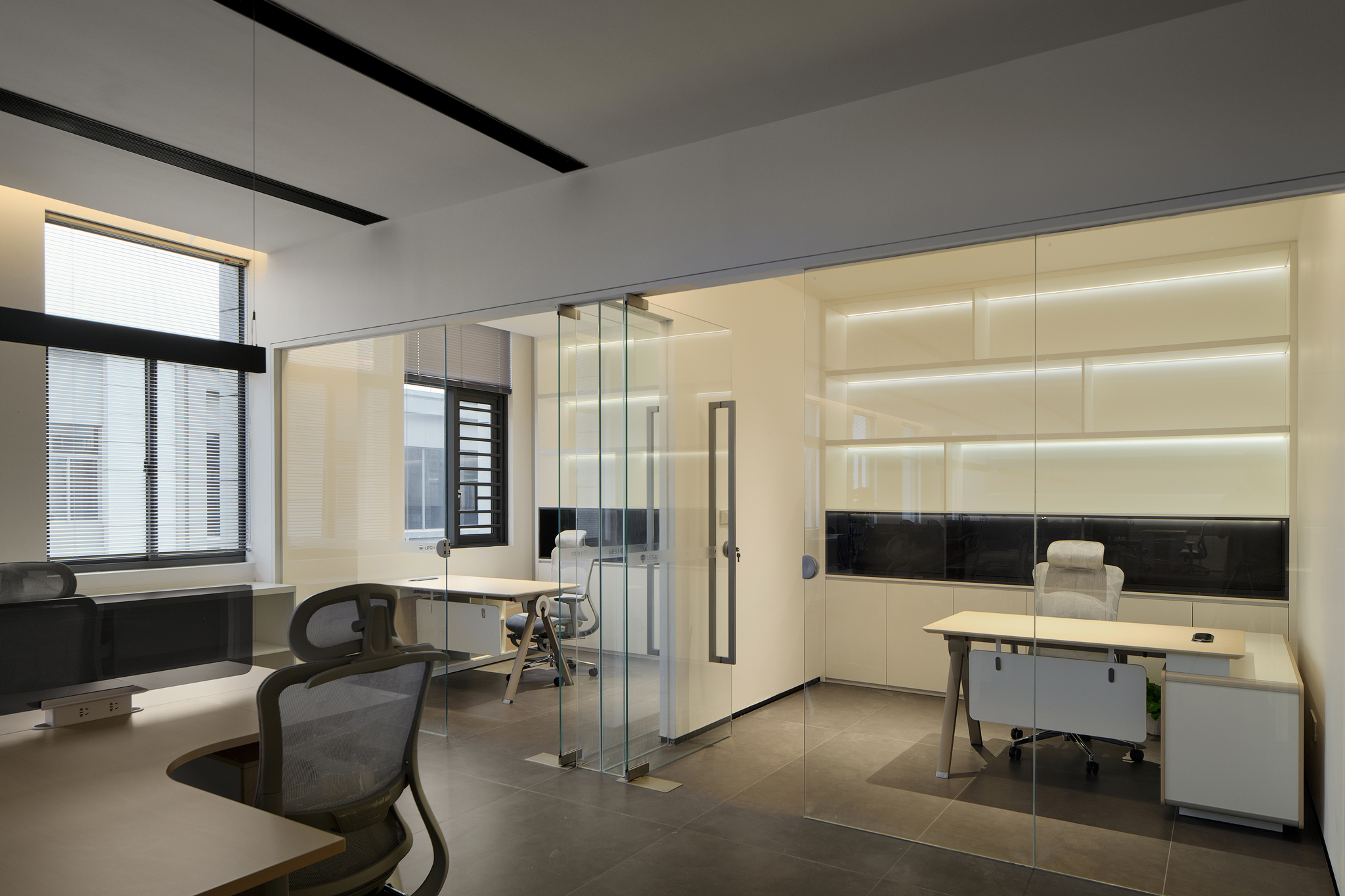 空间意境:纯白色基地的大厅内,裸露的科技蓝横梁直线贯穿直引内部以及车间的黑色门与右侧的黑色墙体与之呼应,沉淀工业底色;曲线突兀的旋转楼梯使得一层与二层与之互动,适当打破规则,让空间结构活跃,充斥未来的各种可能,细节语言上无不说着机械文化。
