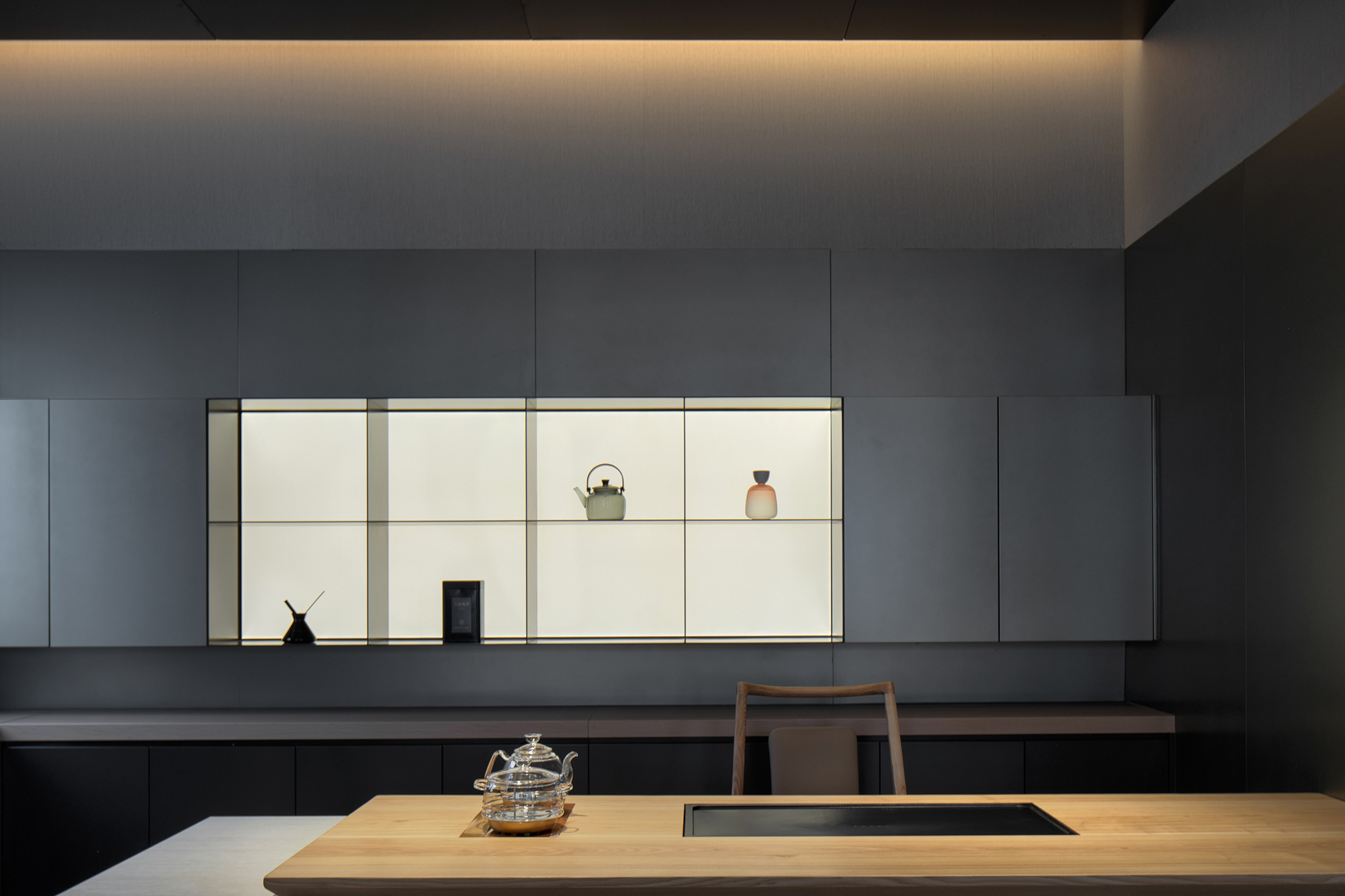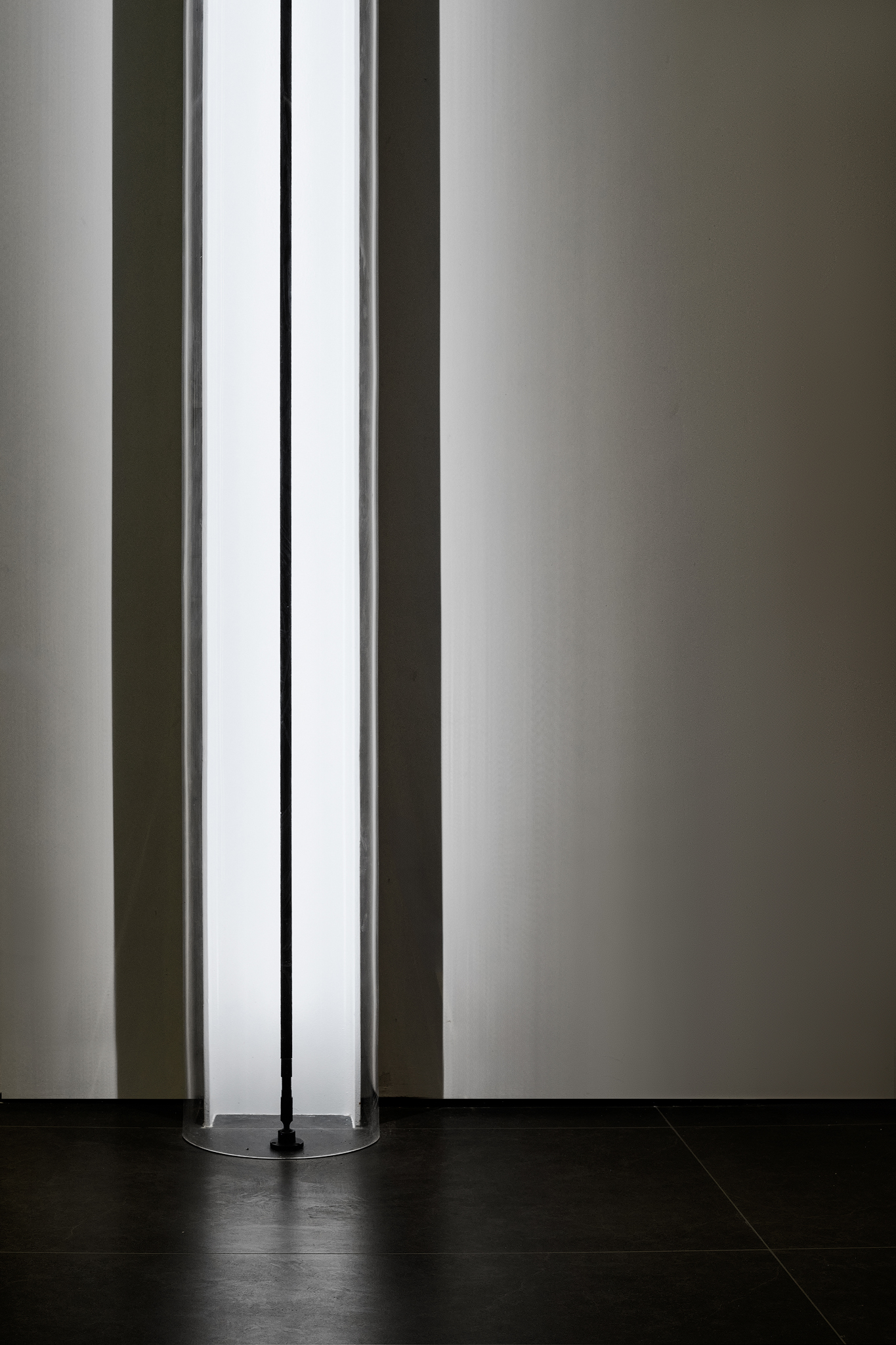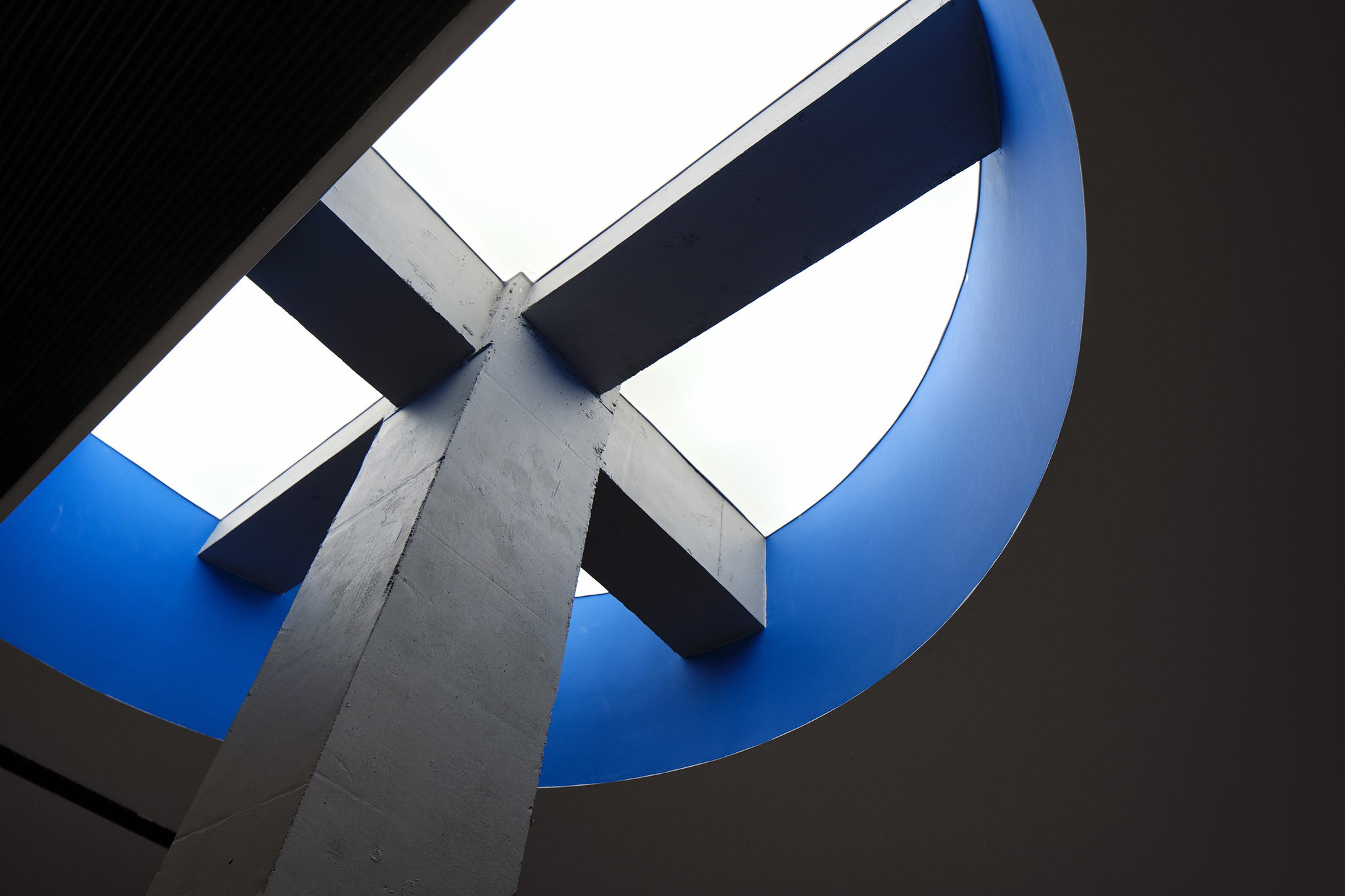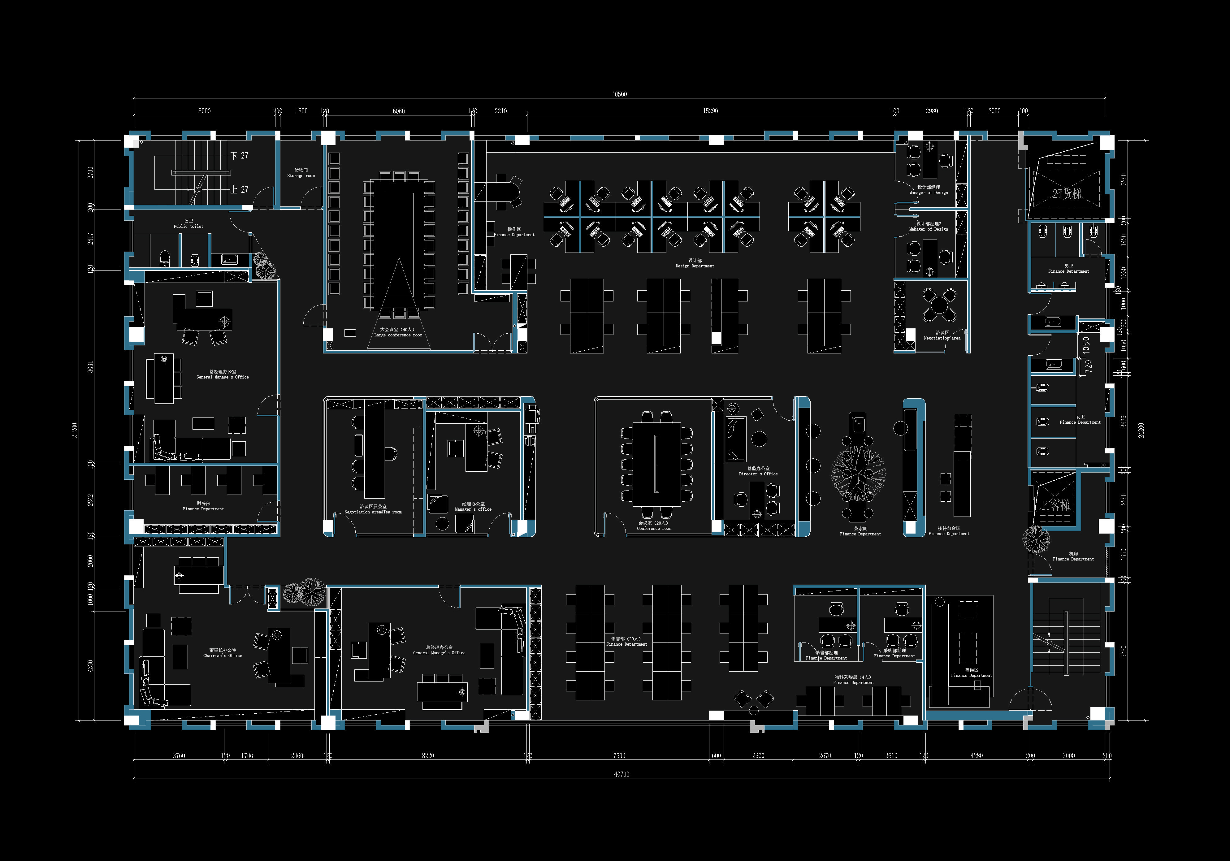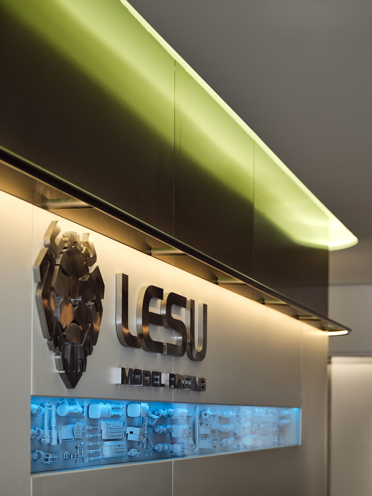 空间意境:纯白色基地的大厅内,裸露的科技蓝横梁直线贯穿直引内部以及车间的黑色门与右侧的黑色墙体与之呼应,沉淀工业底色;曲线突兀的旋转楼梯使得一层与二层与之互动,适当打破规则,让空间结构活跃,充斥未来的各种可能,细节语言上无不说着机械文化。