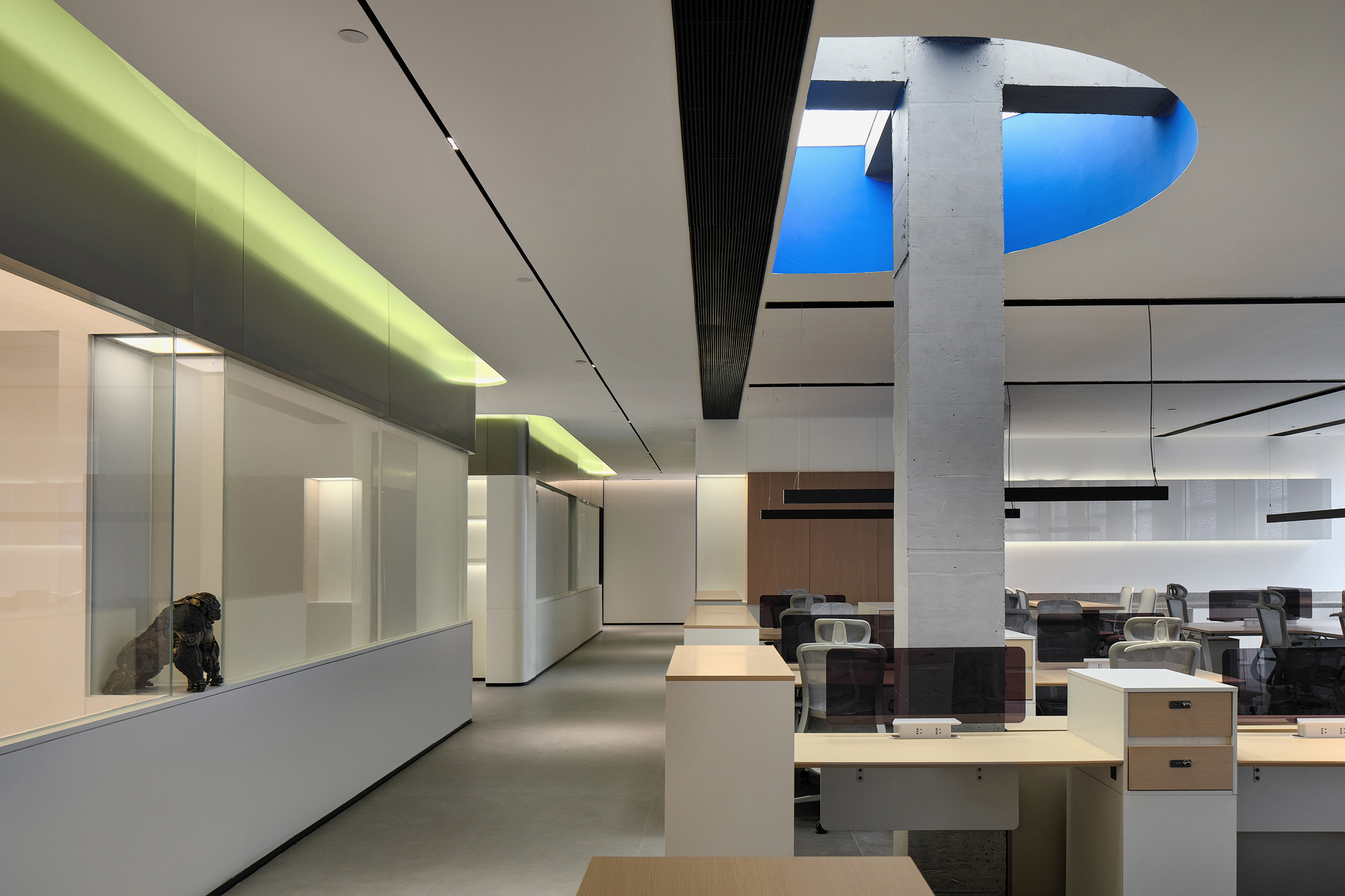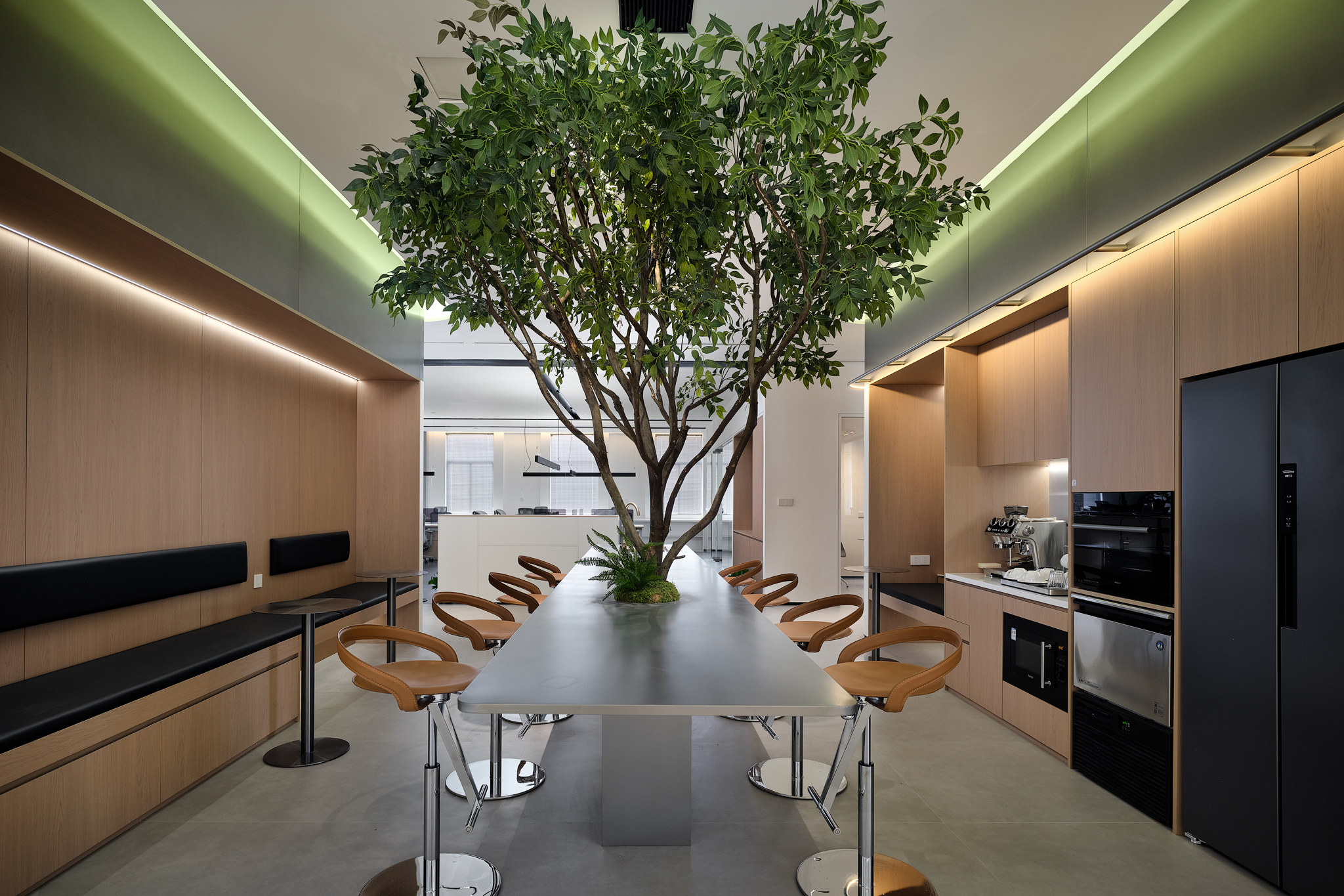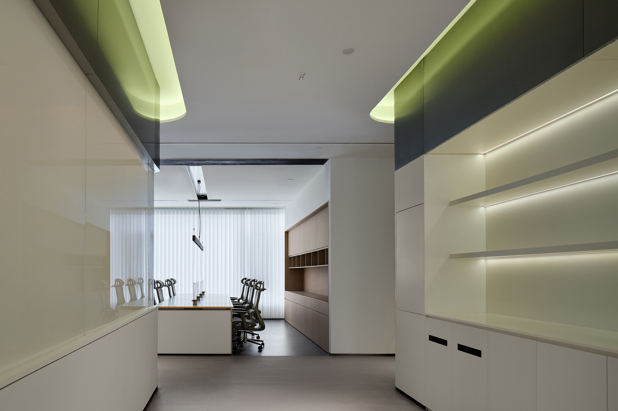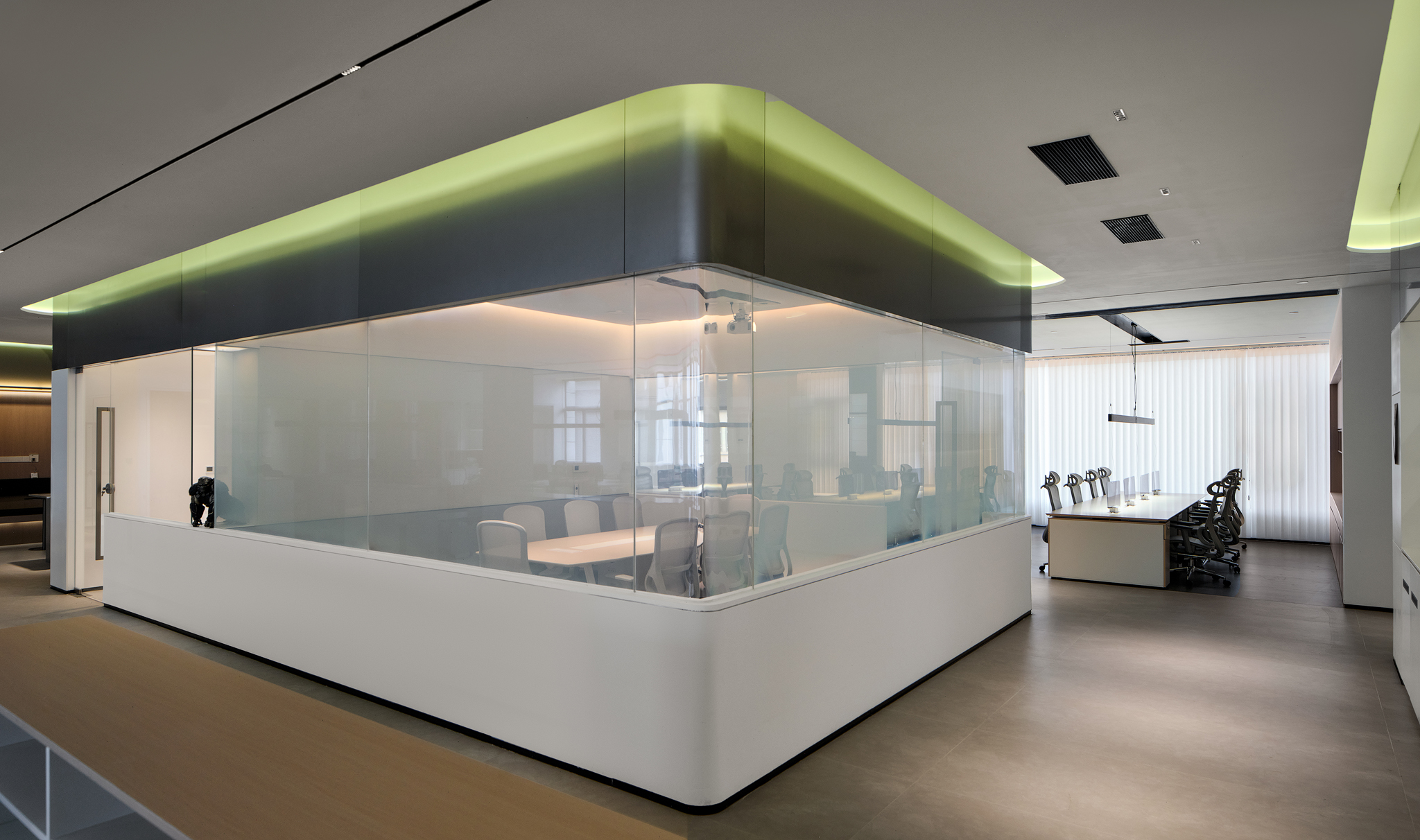 空间布局:企业希望的是自由办公 ,在哪都有一抹绿,能让整个大空间氛围显得不那么压抑,放松一些,同时天花处也采用了淡绿色温暖适眼的光