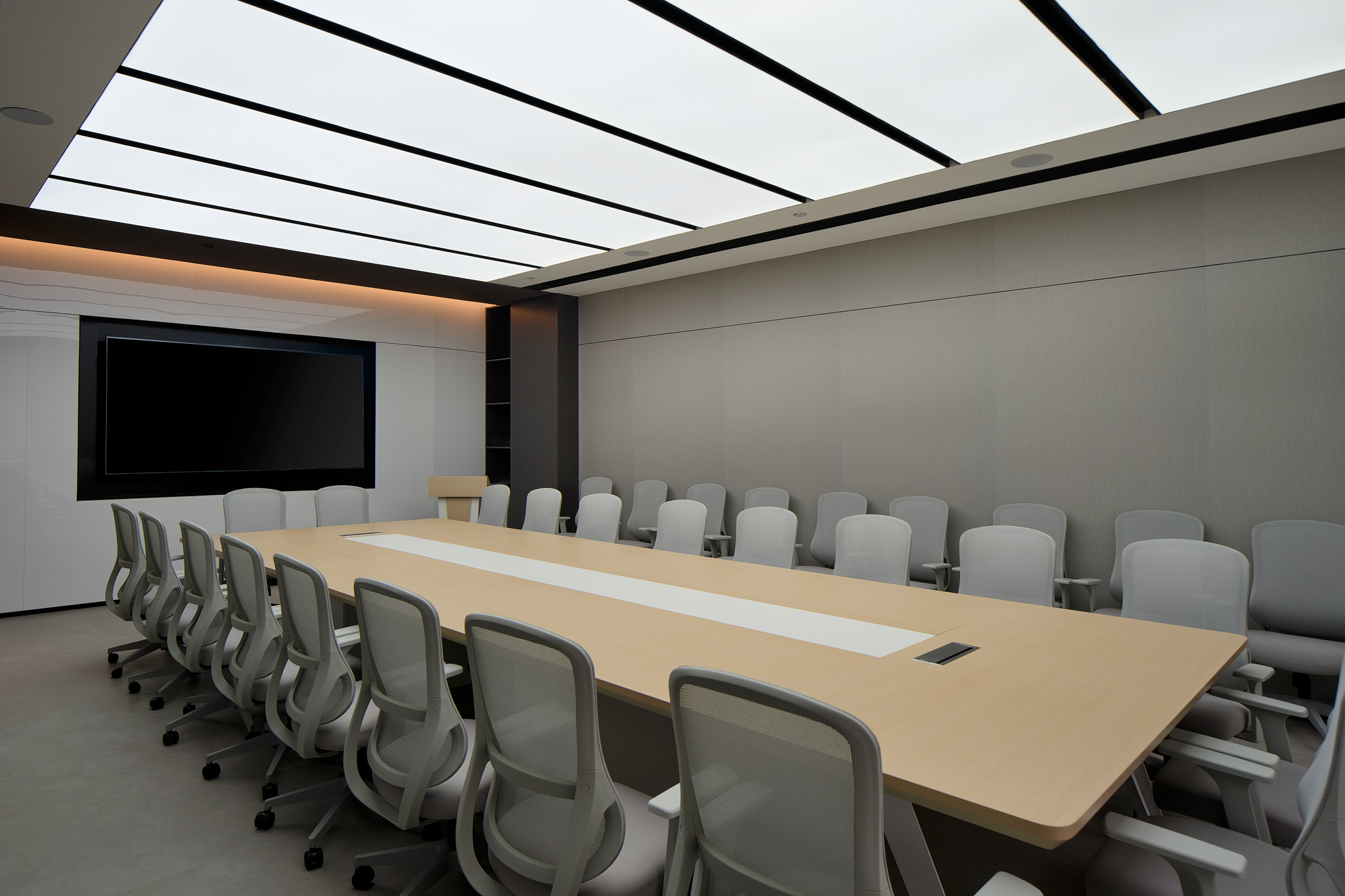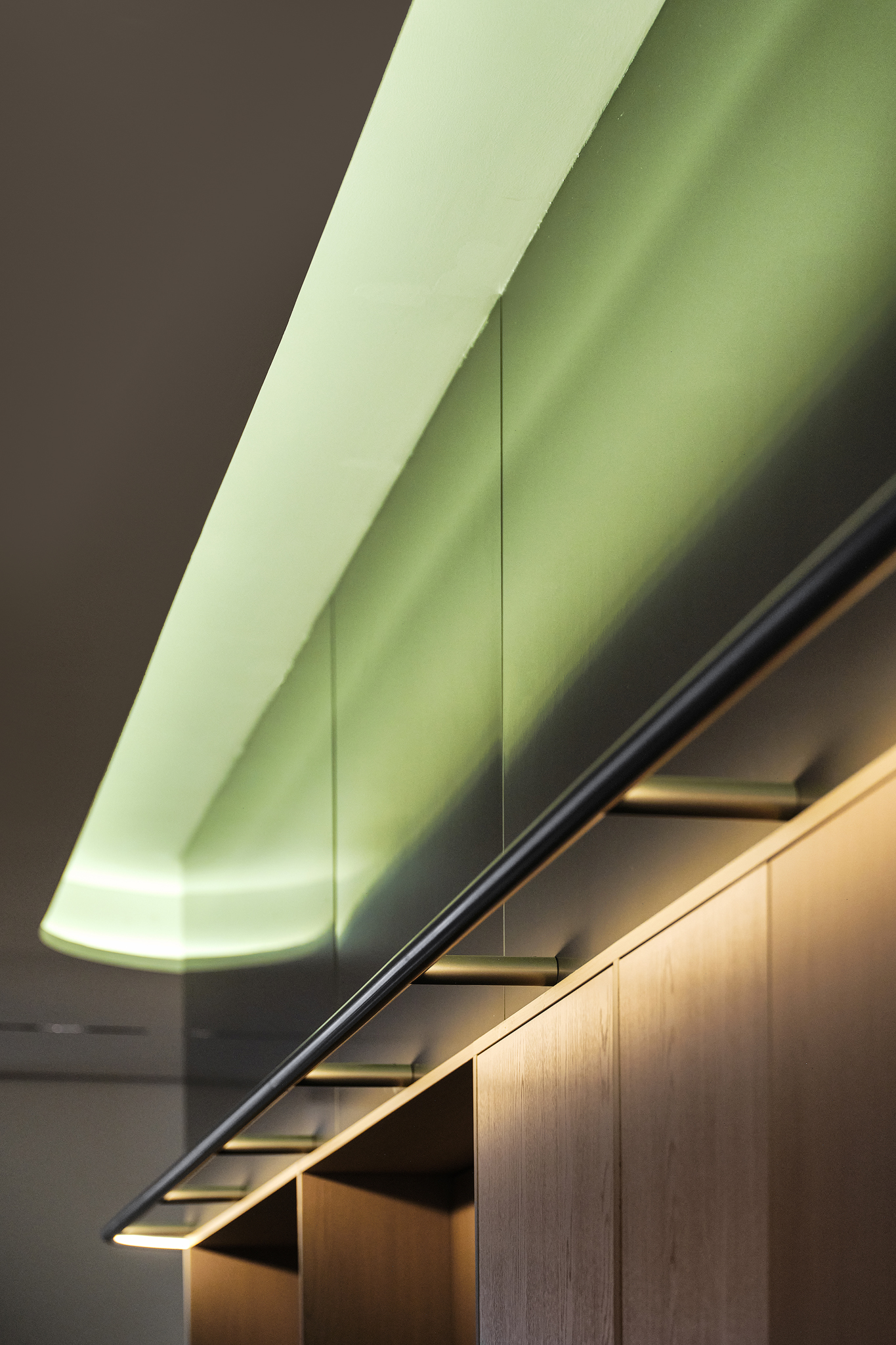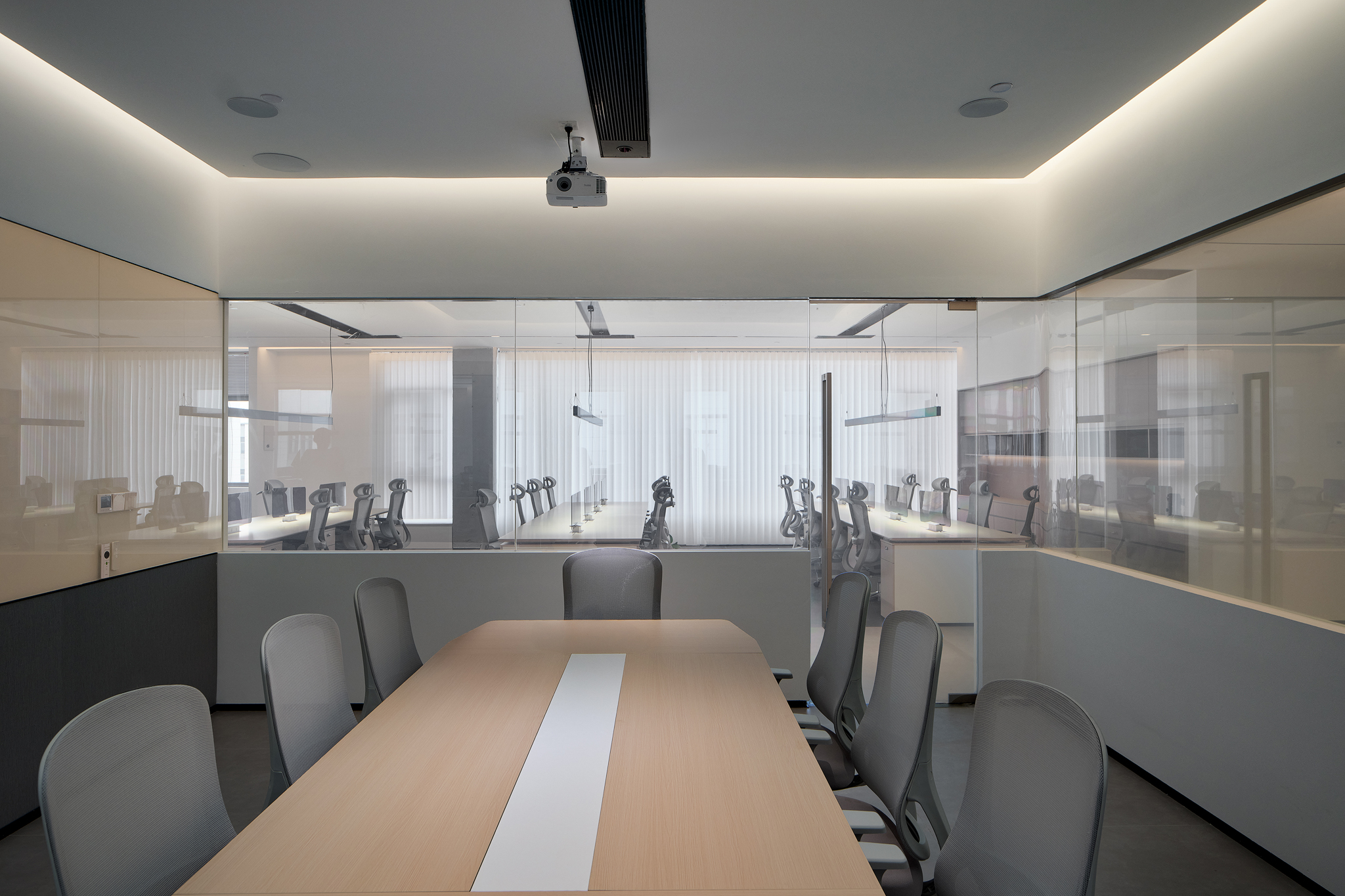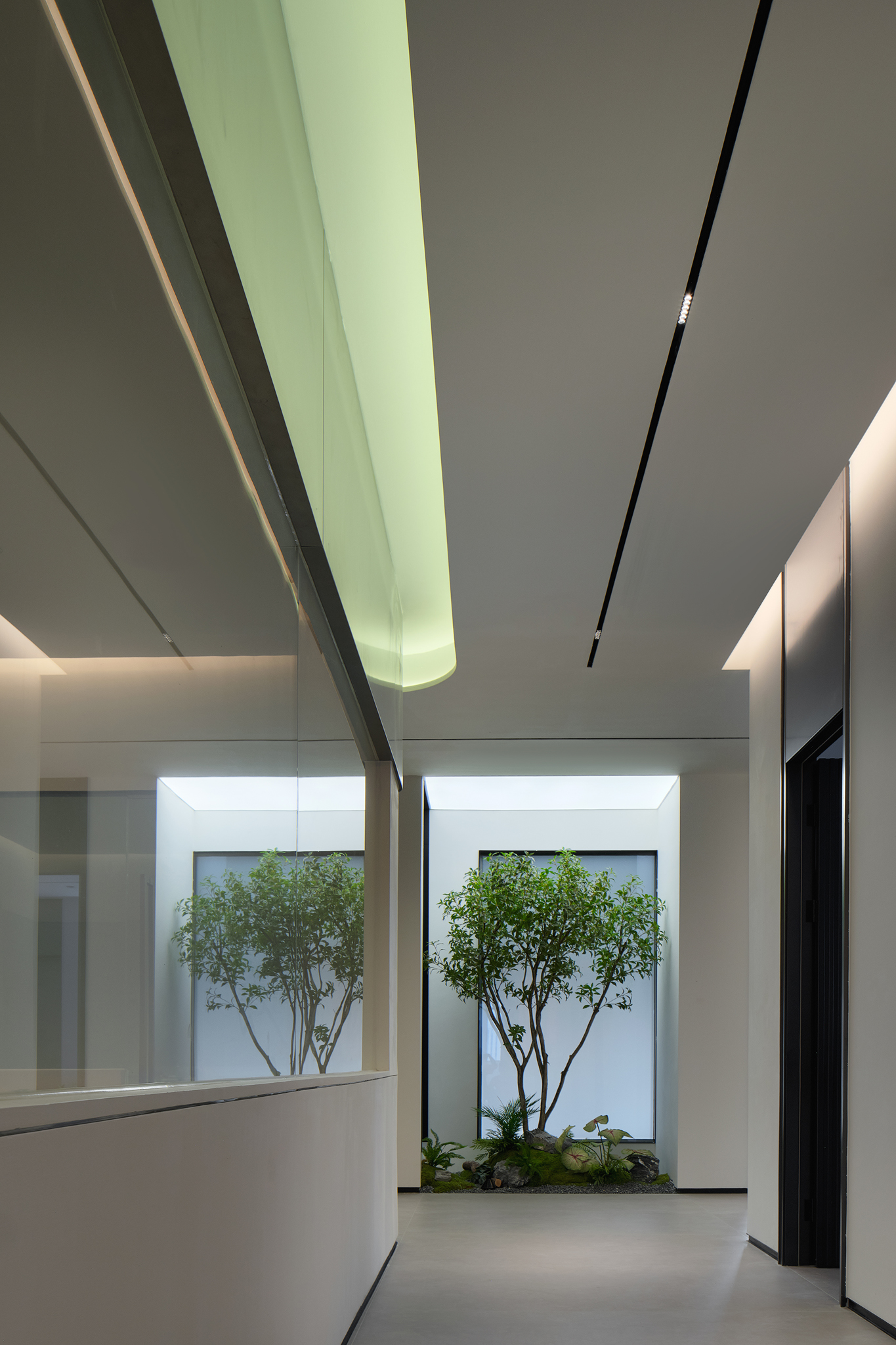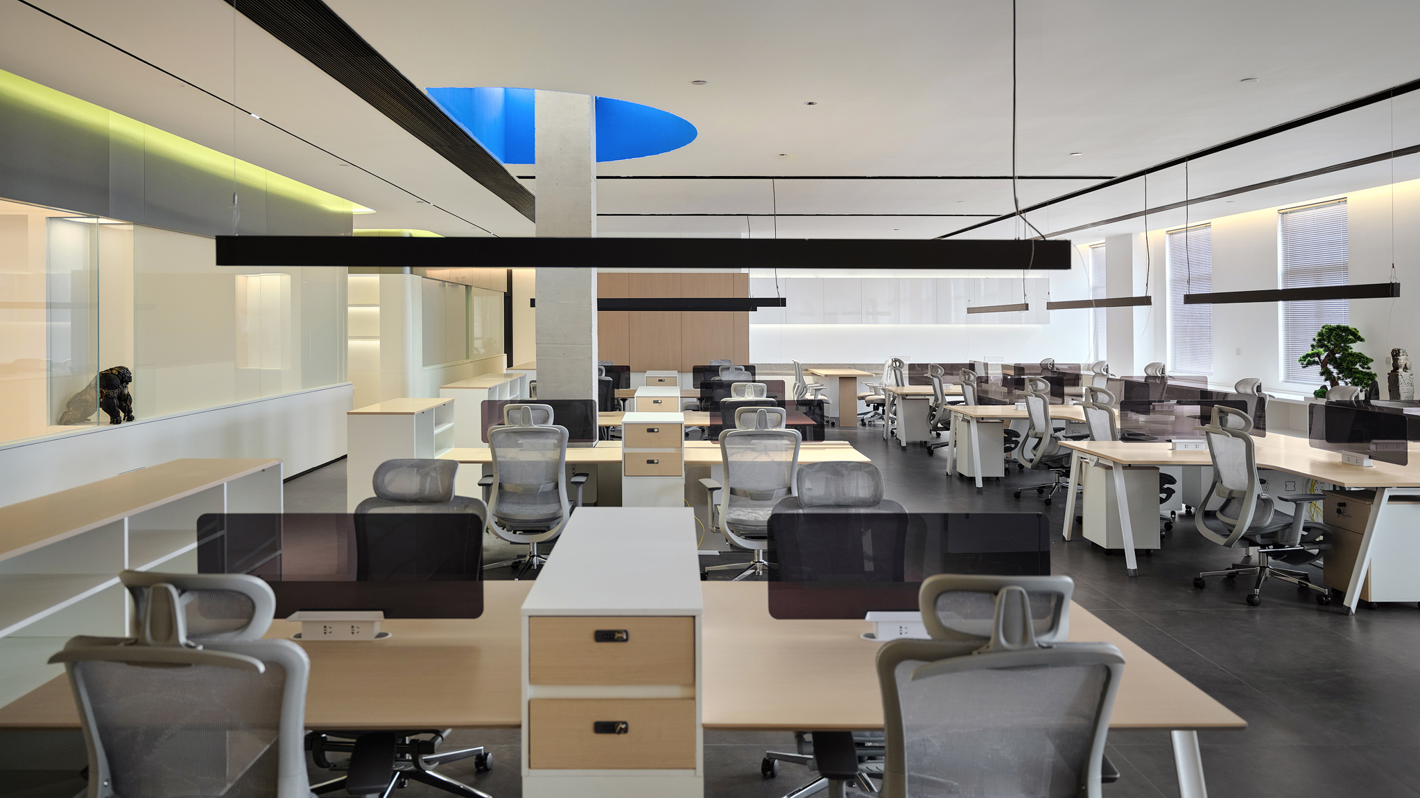 空间布局:企业希望的是自由办公 ,在哪都有一抹绿,能让整个大空间氛围显得不那么压抑,放松一些,同时天花处也采用了淡绿色温暖适眼的光